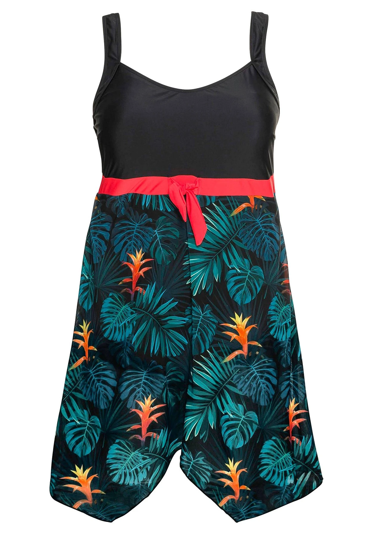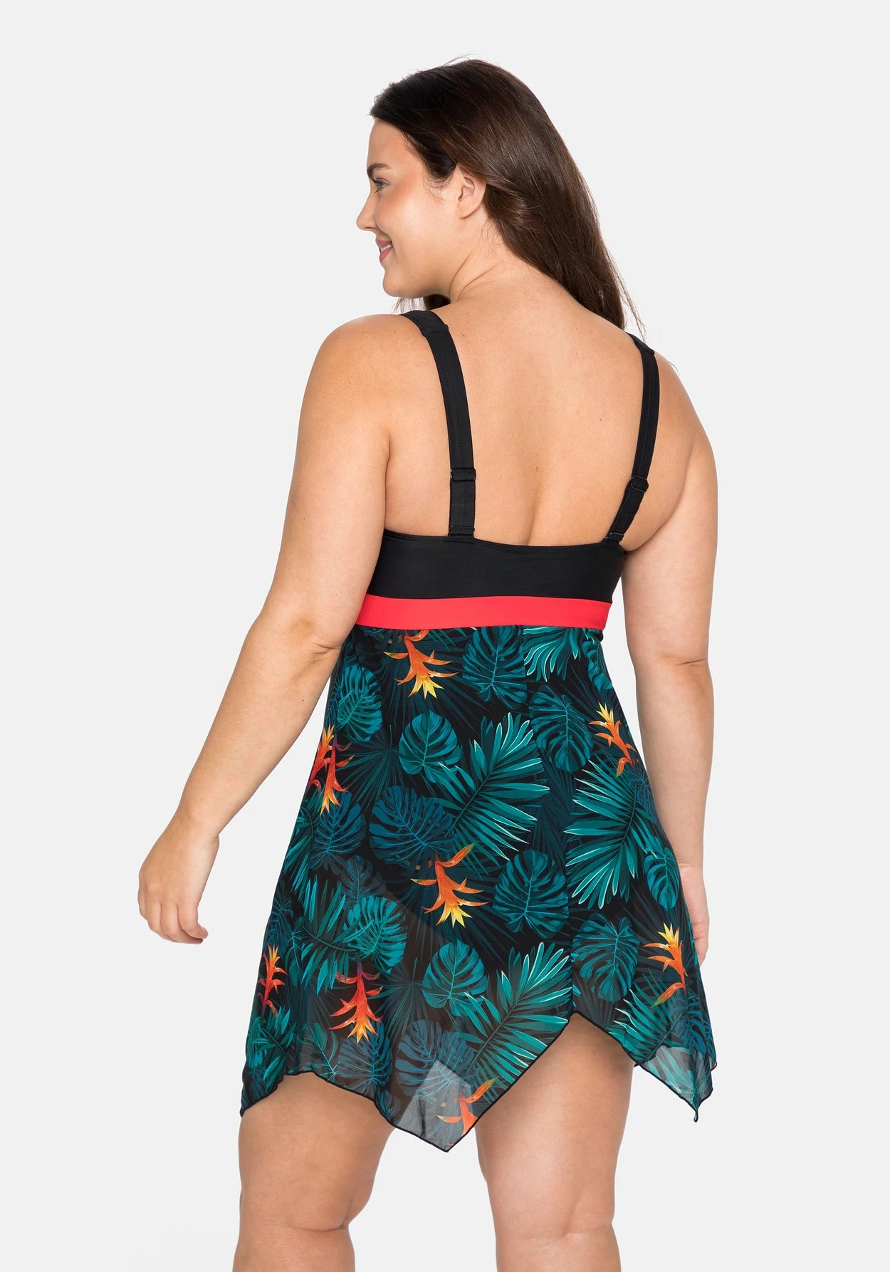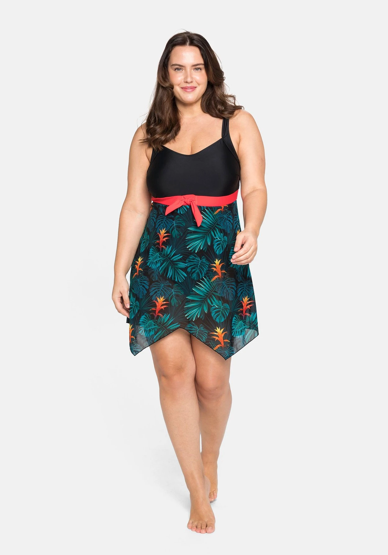 Badekleid von sheego by Joe Browns. Zum Hingucker wird es durch den zipfelig geschnittenen Mesh-Rock mit tropischem Print, das unifarbene Bindeband unterstreicht den modischen Auftritt. Ein weiter Karrée-Ausschnitt und die wattierten Cups formen ein schönes Dekolleté. Die breiten Träger lassen sich bequem in der Länge verstellen.