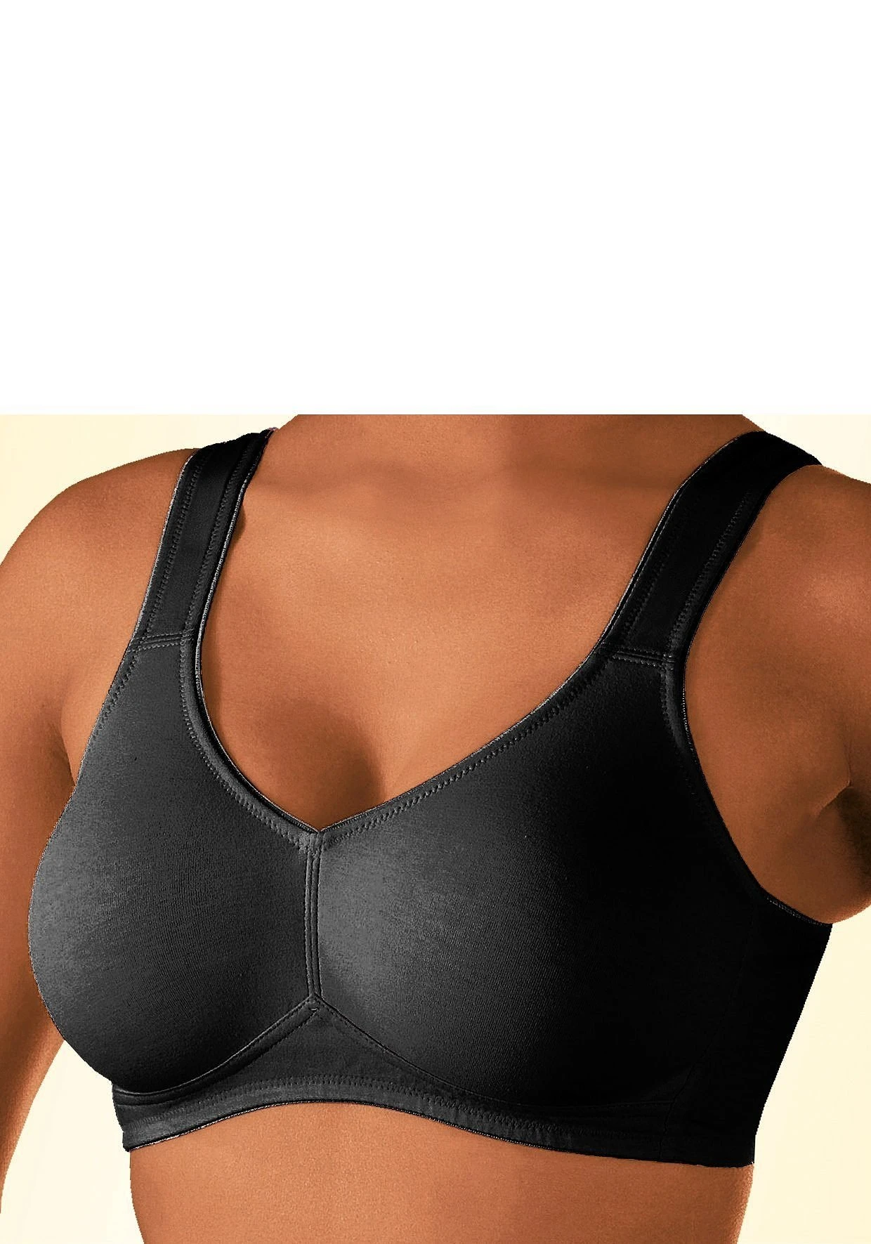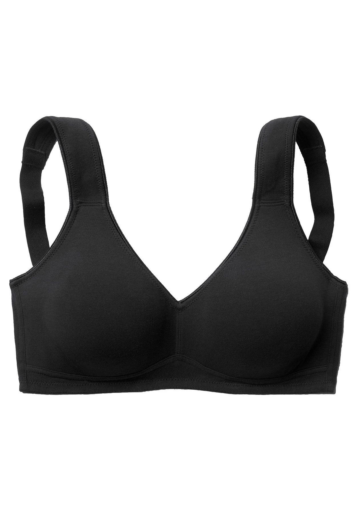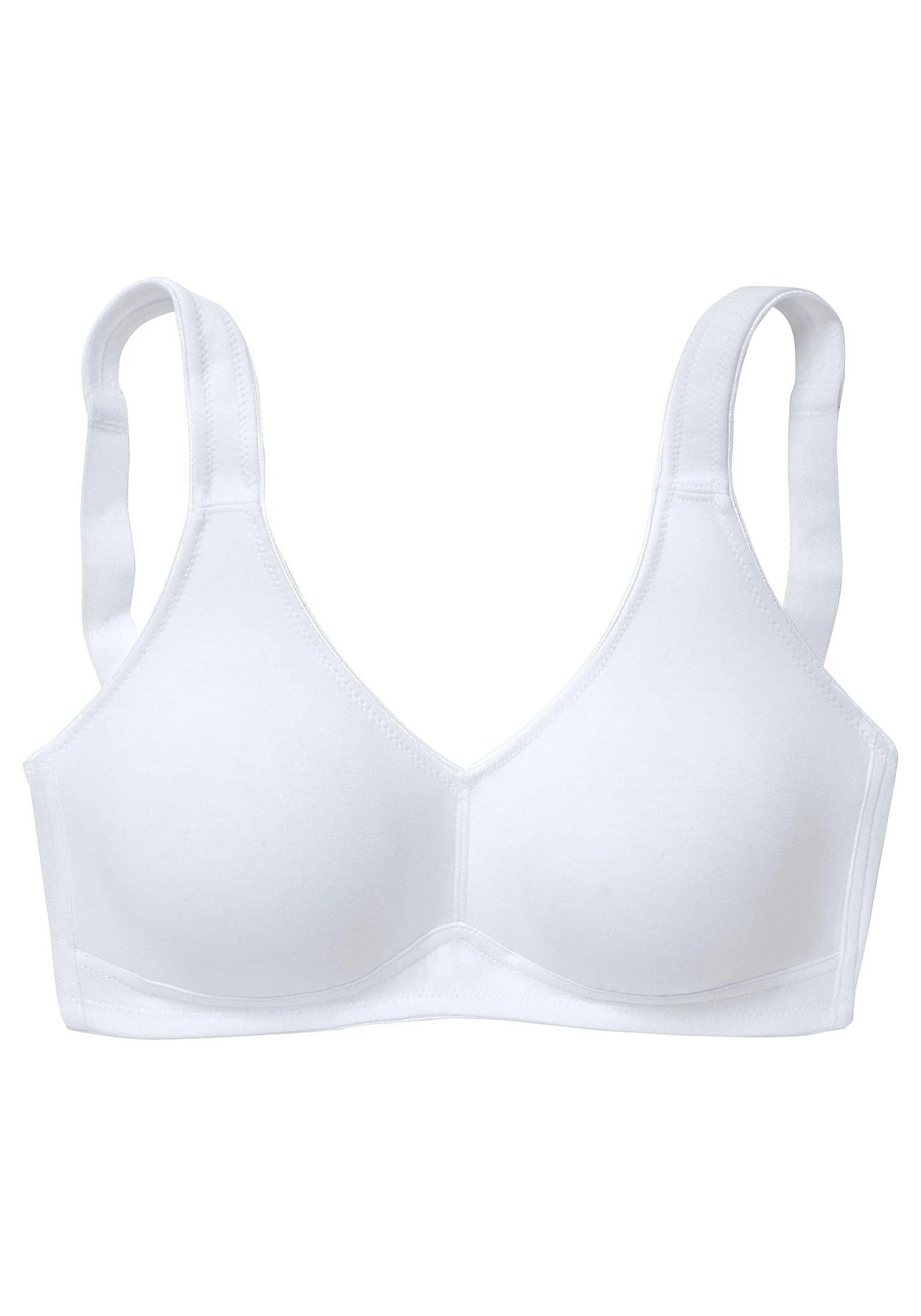 Toller Basic BH ohne Bügel von Petite Fleur im Doppelpack. Die nahtlos vorgeformten, gemoldeten Cups schmiegen sich sanft an und sind ideal für eng anliegende Kleidung, da sich nichts abzeichnet. Die breiteren Träger geben verlässlichen Halt und verhindern ein unangenehmes Einschneiden auf den Schultern. Mit steigender Größe ist die Passform auf die jeweiligen besonderen Bedürfnisse abgestimmt, d.h. pro Größe wachsen auch die Rückteile und Verschlussbreiten mit. Für hohen Tragekomfort sorgen breitere Elastikbänder entlang der Kanten, die dank hochelastischer Nähte nicht einschneiden. Träger und Rückenverschluss sind verstellbar. Klassische Dessous. Bequeme Alltags-Dessous. Modische Dessous. Aus 95% Baumwolle, 5% Elasthan.