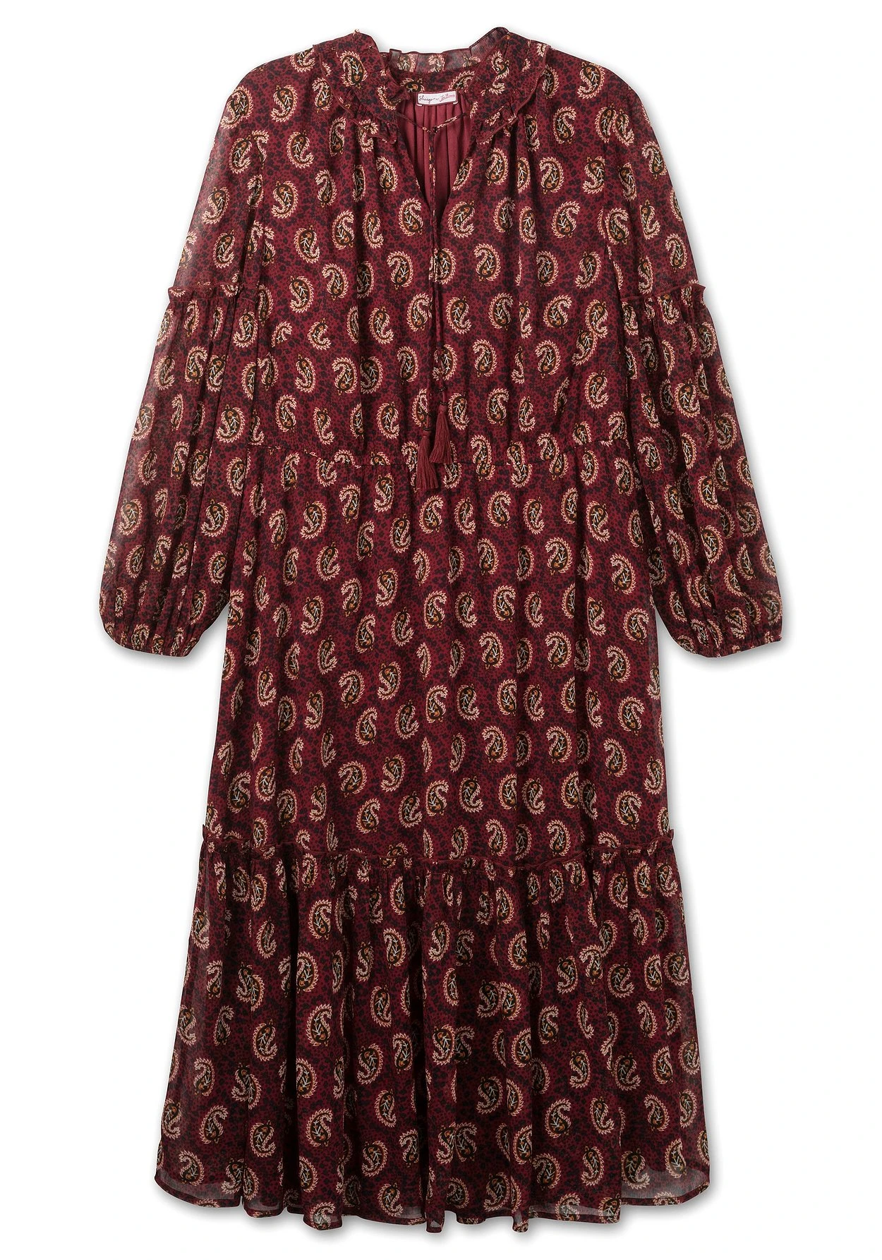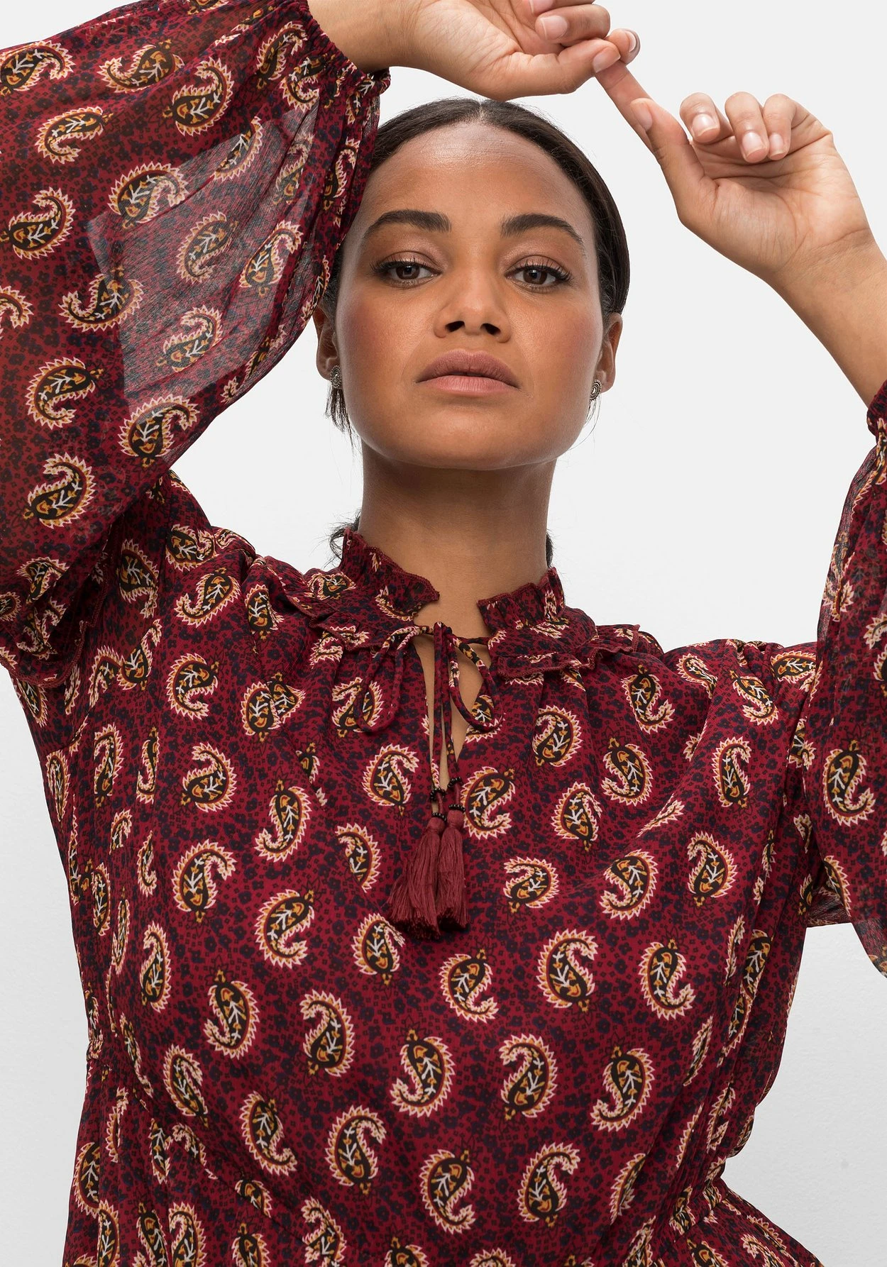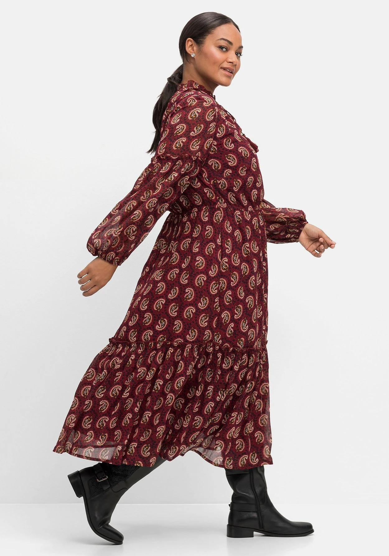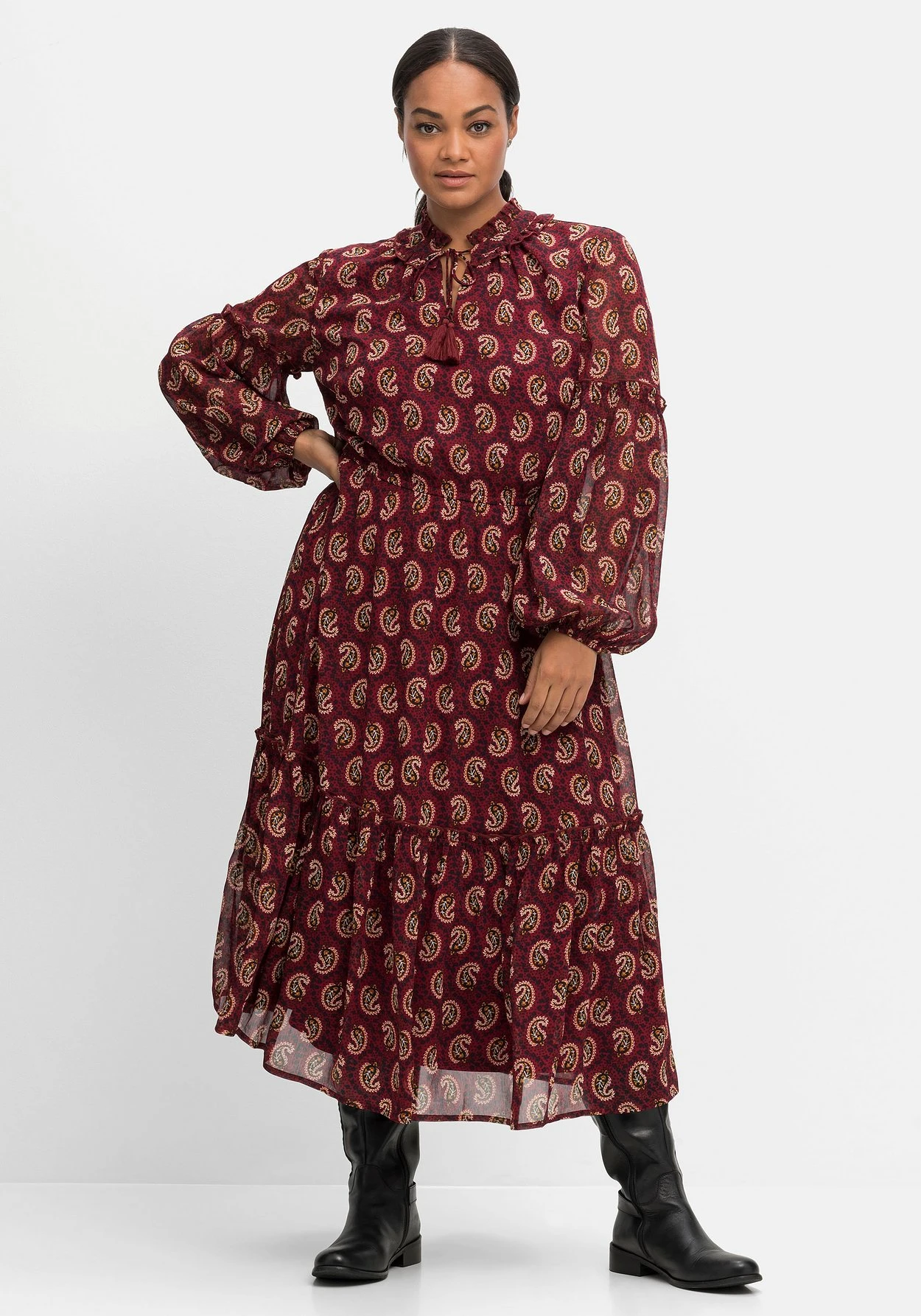Chiffonkleid von sheego by Joe Browns. Der Paisley-Alloverdruck und die Maxilänge sorgen bei diesem Kleid für eine modische Optik. Dazu kommen feminine Details: Den Rundhalsausschnitt zieren Schlitz und Rüsche sowie ein Bindeband mit Tassel. Der Gummizug in der Taille gibt der Silhouette Form, darunter schließt sich das weit schwingende Rockteil mit Volant am Saum an. Ballonärmel mit Rüsche dienen hier als verspielte Finish.