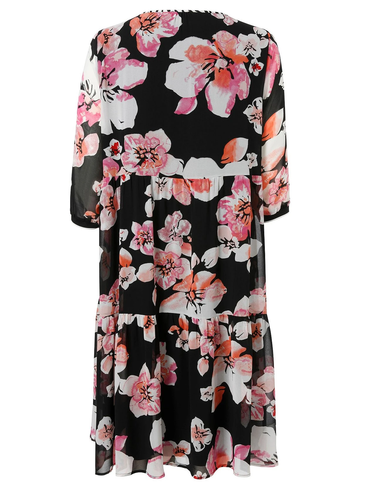 Chiffonkleid von VIA APPIA DUE. Der ausdrucksstarke Blumenprint erhält durch die kontrastfarbene Blende mit Bindeband am Rundhalsausschnitt modischen Twist. Der zarte Chiffon ist mit Jerseyfutter unterlegt, ein stufiger Volant gibt dem Rock femininen Schwung.