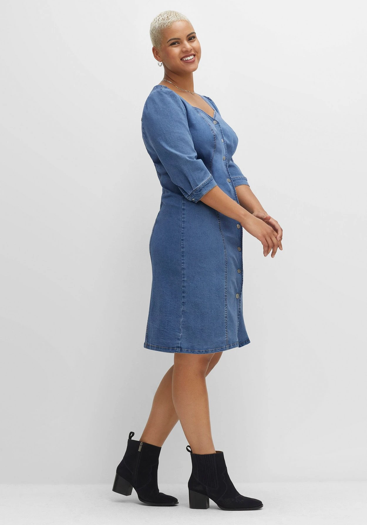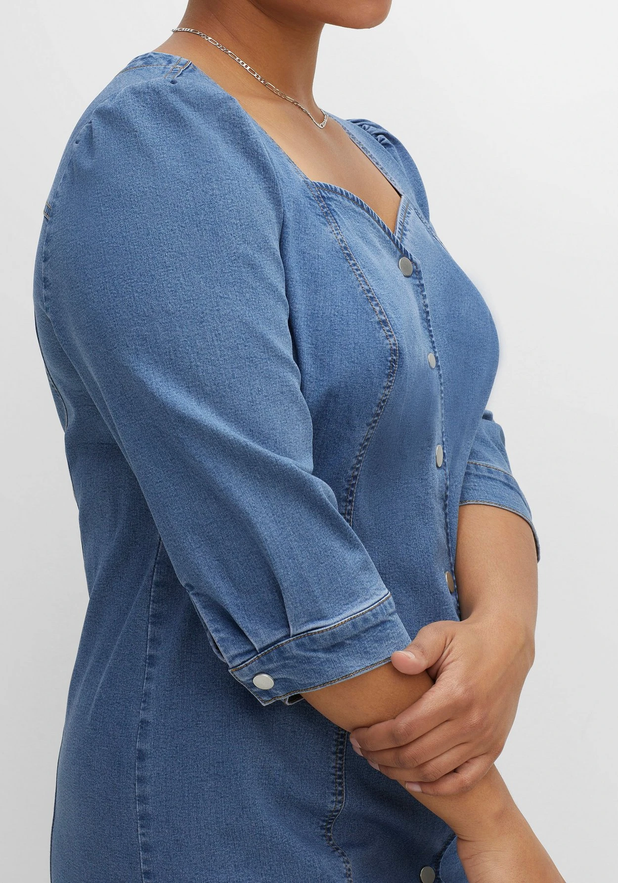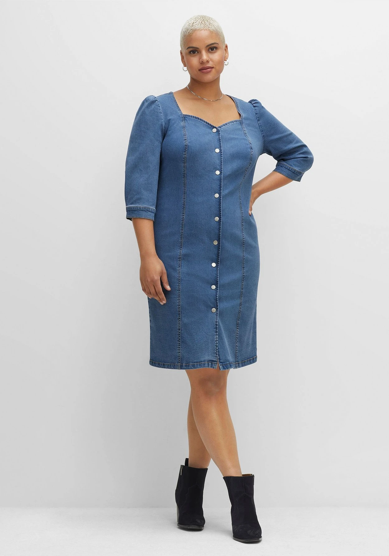 Jeanskleid in figurbetontem Schnitt. Durch den formschönen Herz-Ausschnitt kommt das Dekolleté optimal zur Geltung, dekorative Kräuselungen und Manschetten mit Schlitz und Druckknopf am 3/4-Arm unterstreichen den femininen Look. Eine durchgehende Druckknopfleiste in Metalloptik sorgt für den typischen Jeans-Look.