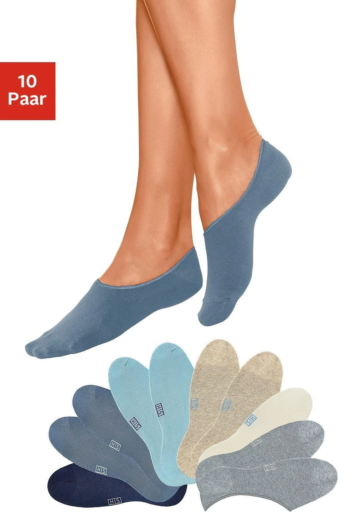 Vielseitige Basic Füßlinge für jede Gelegenheit. Einfach nach Lust und Laune kombinieren. Die offenen Unisex Füßlinge der Marke H.I.S im 10er Pack verschwinden ganz in den sportiven Schuhen. Durch die verstärkte Ferse und Spitze wird die Haltbarkeit beim Tragen und auch nach vielen Wäschen verbessert.