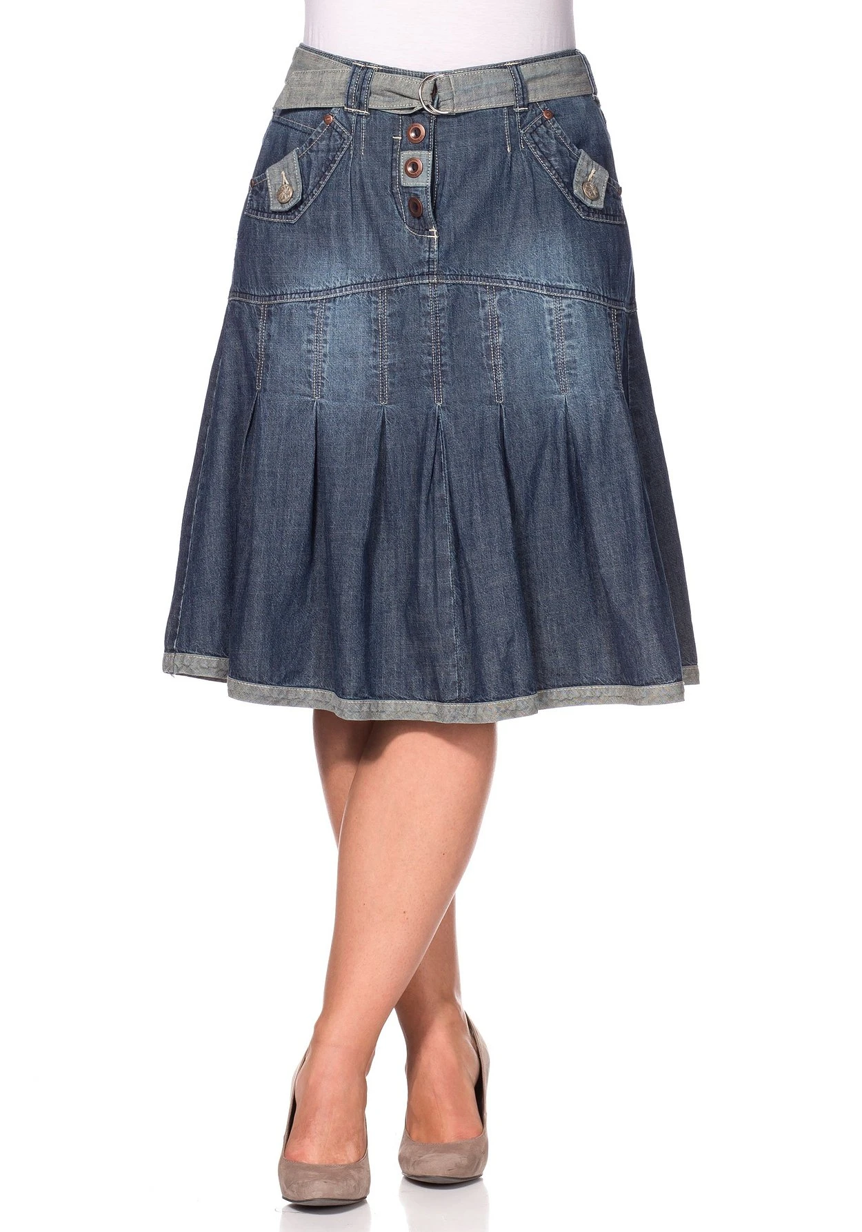 Feminin und verspielt wirkt der Jeansrock von sheego by Joe Browns. Die ausgestellte Form ist mit Falten versehen, die beim Gehen aufspringen und so für Schwung und Bewegungsfreiheit sorgen. Die Eingrifftaschen auf der Vorderseite und die aufgesetzten Gesäßtaschen sind mit einer Klappe und geprägten Knöpfen verziert Die Klappe ist wie der abnehmbare Bindegürtel und der Saumabschluss hell abgesetzt. Mit einem Reißverschluss unter der Zierknopfleiste wird der Rock geschlossen.