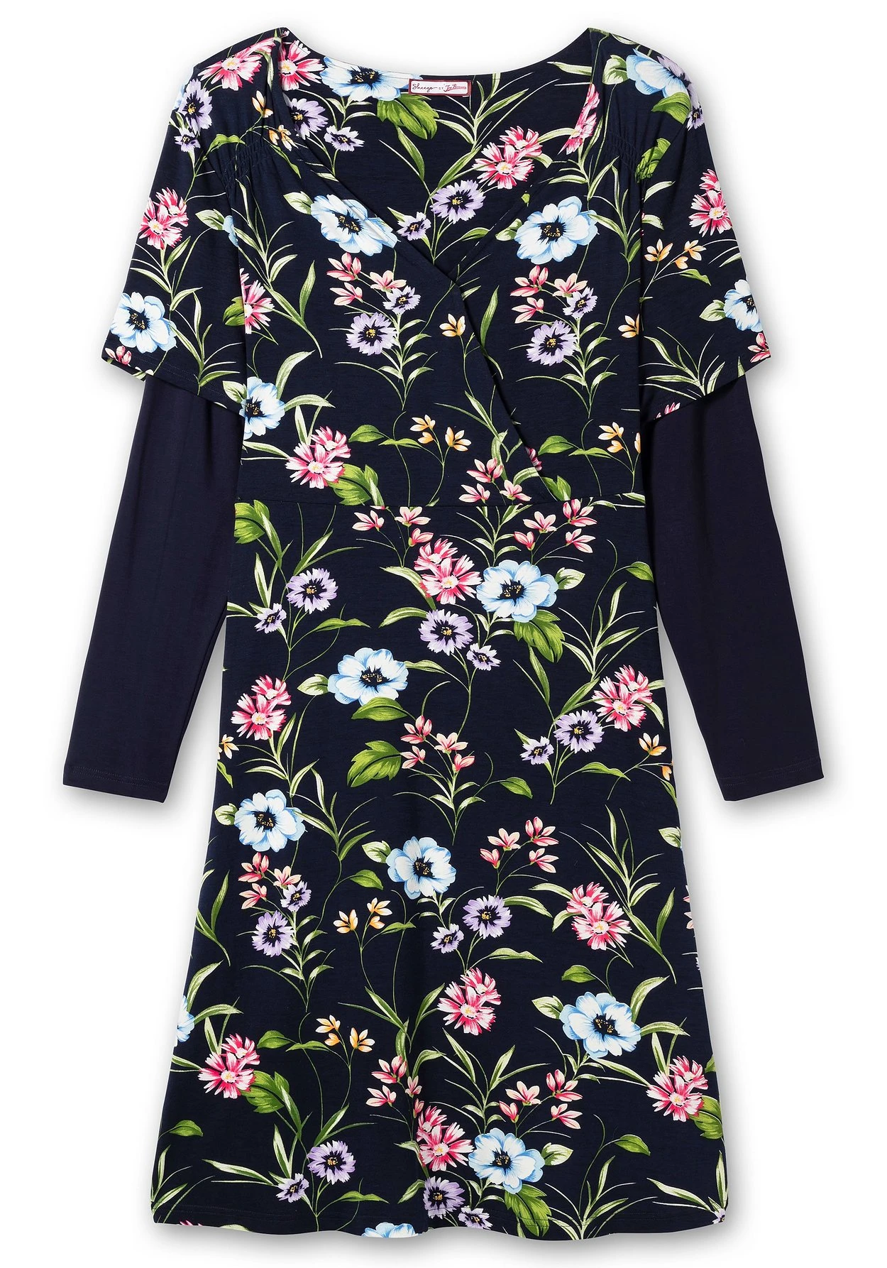 Jerseykleid von sheego by Joe Browns. Das allover mit Blumen bedruckte Kleid ist mit V-Ausschnitt in Wickeloptik gestaltet. Durch die leicht gesmokte Schulterpartie fällt der Style am Oberkörper besonders schön, darunter schließt sich ein leicht ausgestellter Rock an. Die unifarbenen langen Ärmel lassen eine spannende 2-in-1-Optik entstehen, ein farblich passender Bindegürtel rundet den Auftritt harmonisch ab.