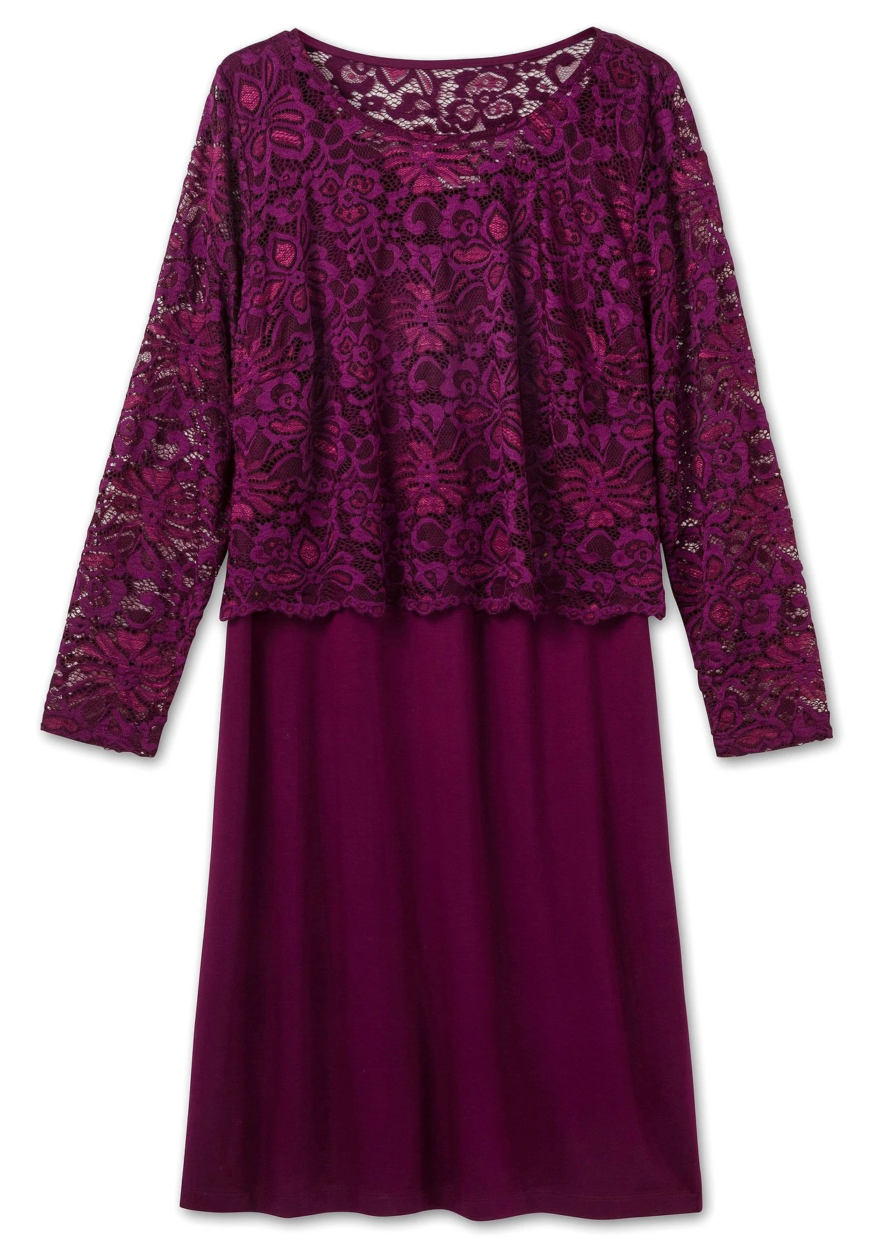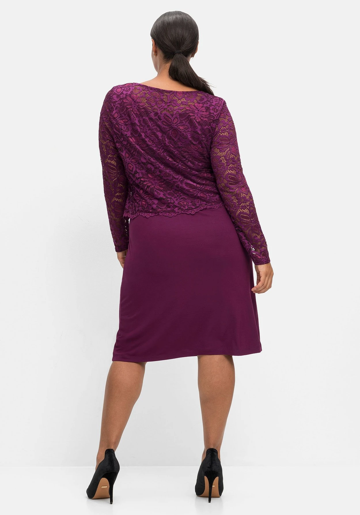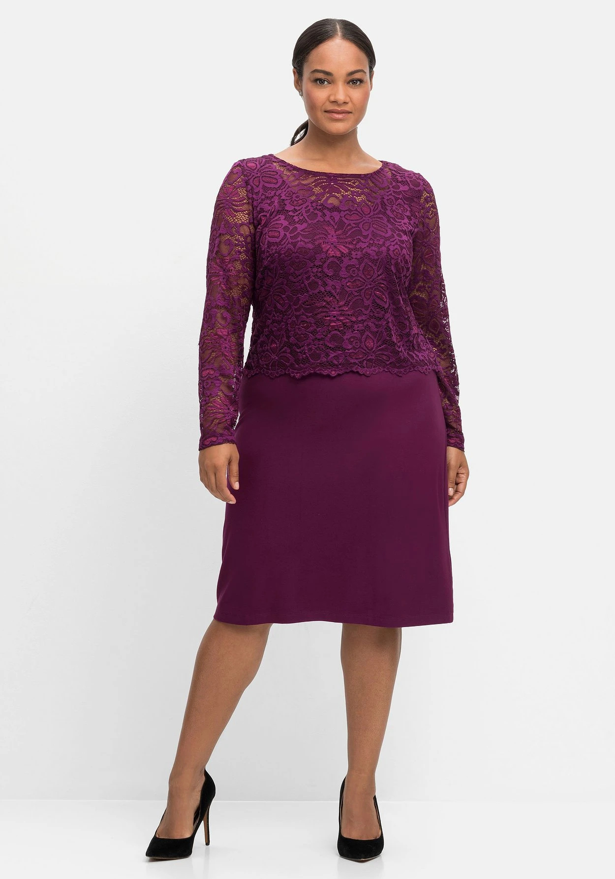 Jerseykleid in Double-Layer-Optik von sheego by Joe Browns. Über das ärmellose Jerseykleid fällt ein locker geschnittenes Oberteil aus Two-Tone-Spitze. Der feine Glanz verleiht ihm eine festlich-elegante Optik. An Dekolleté, Rücken und den Ärmeln lässt die semitransparente Spitze die Haut dezent durchschimmern. So entsteht ein femininer Look, der auf Partys und Festlichkeiten eine tolle Figur macht.