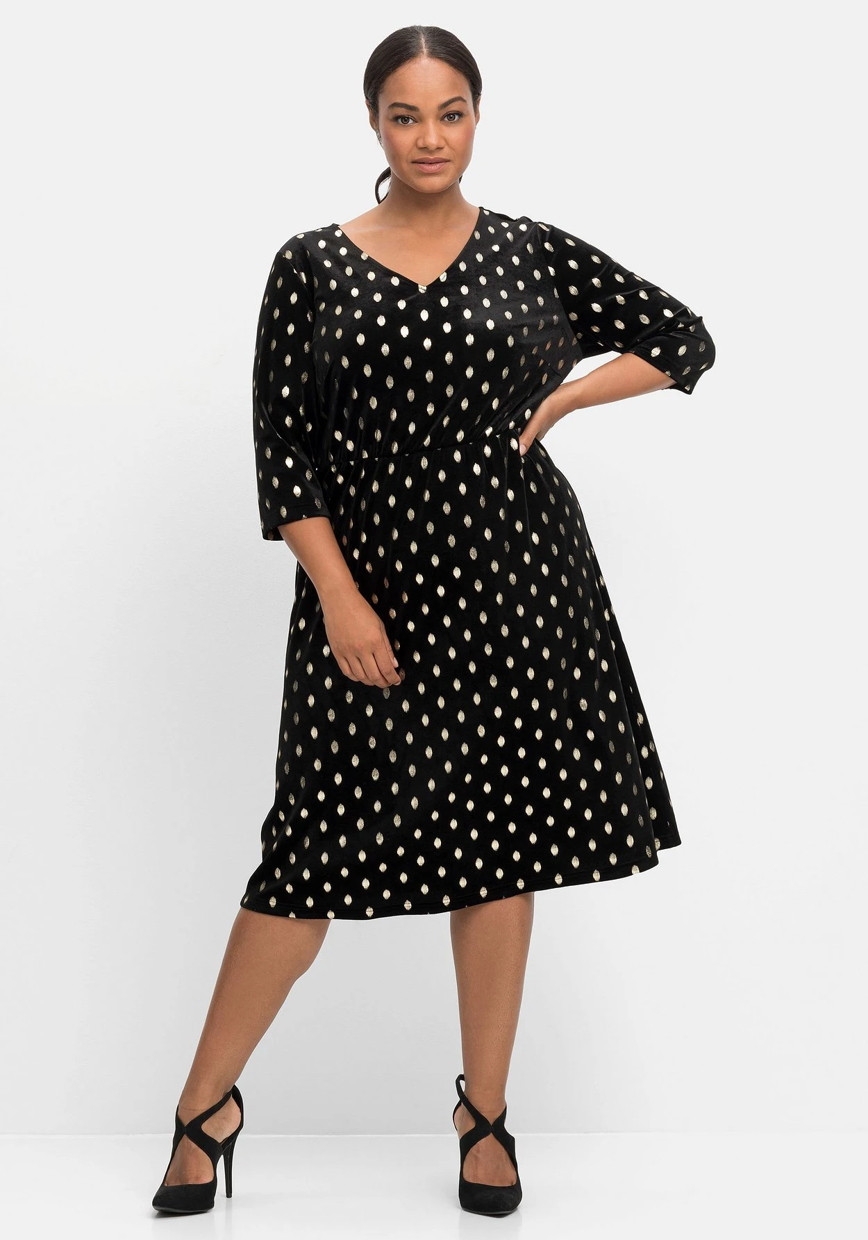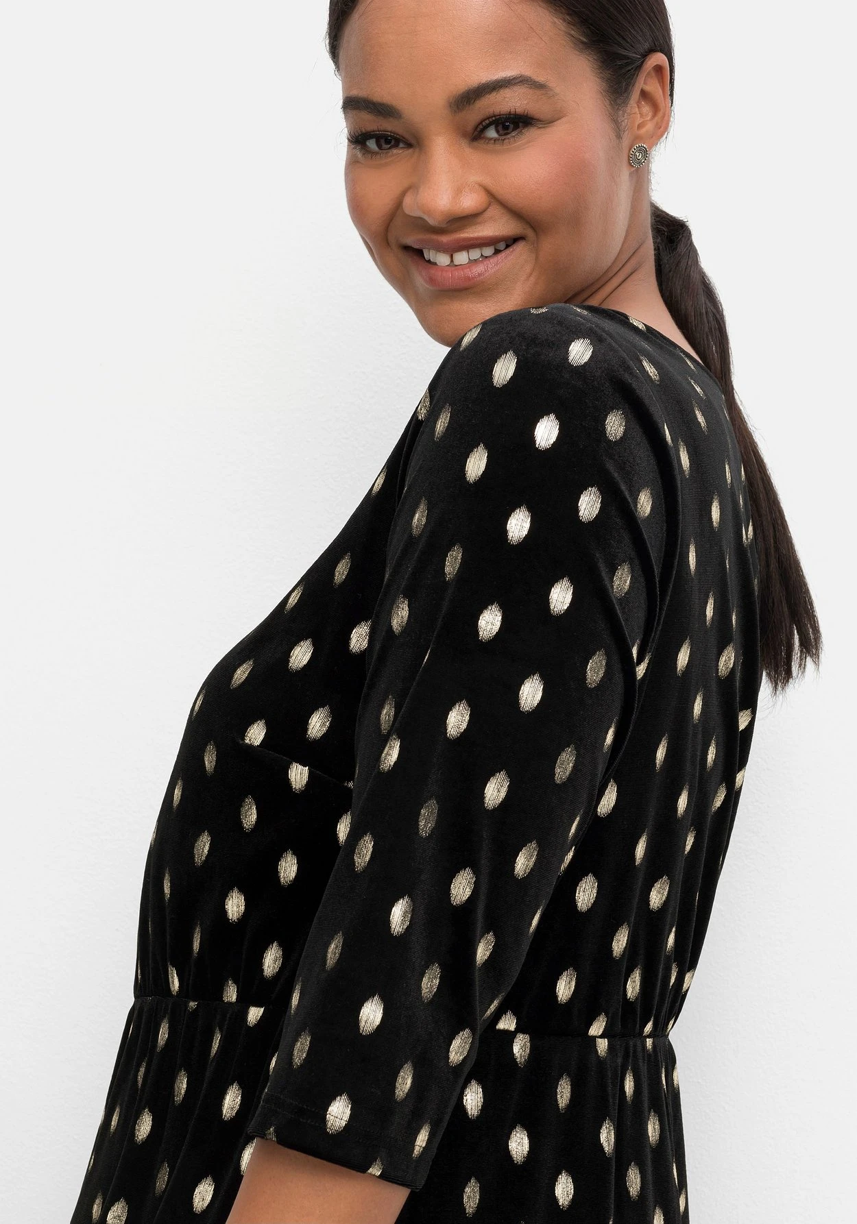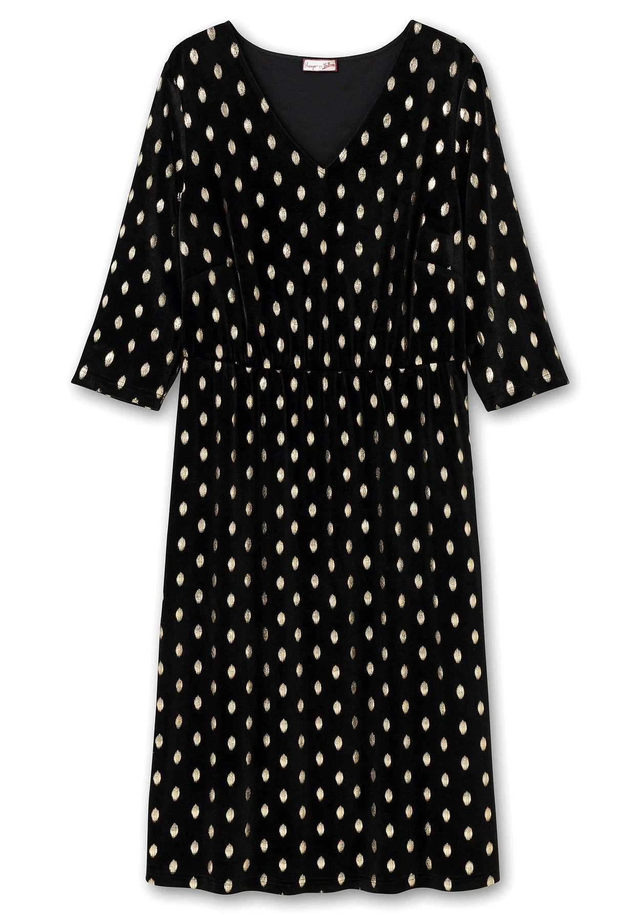 Jerseykleid von sheego by Joe Browns. Die weiche Samtoptik wird durch den goldfarbenen, fein schimmernden Glitter-Alloverdruck festlich ergänzt. Der feminine Fit zeigt sich mit V-Ausschnitt, 3/4-Arm und leicht ausgestelltem Rock. Ein leicht gekräuselter Gummizugbund auf Taillenhöhe definiert die Silhouette. So entsteht ein moderner Look, der auf Partys und Festlichkeiten eine tolle Figur macht.