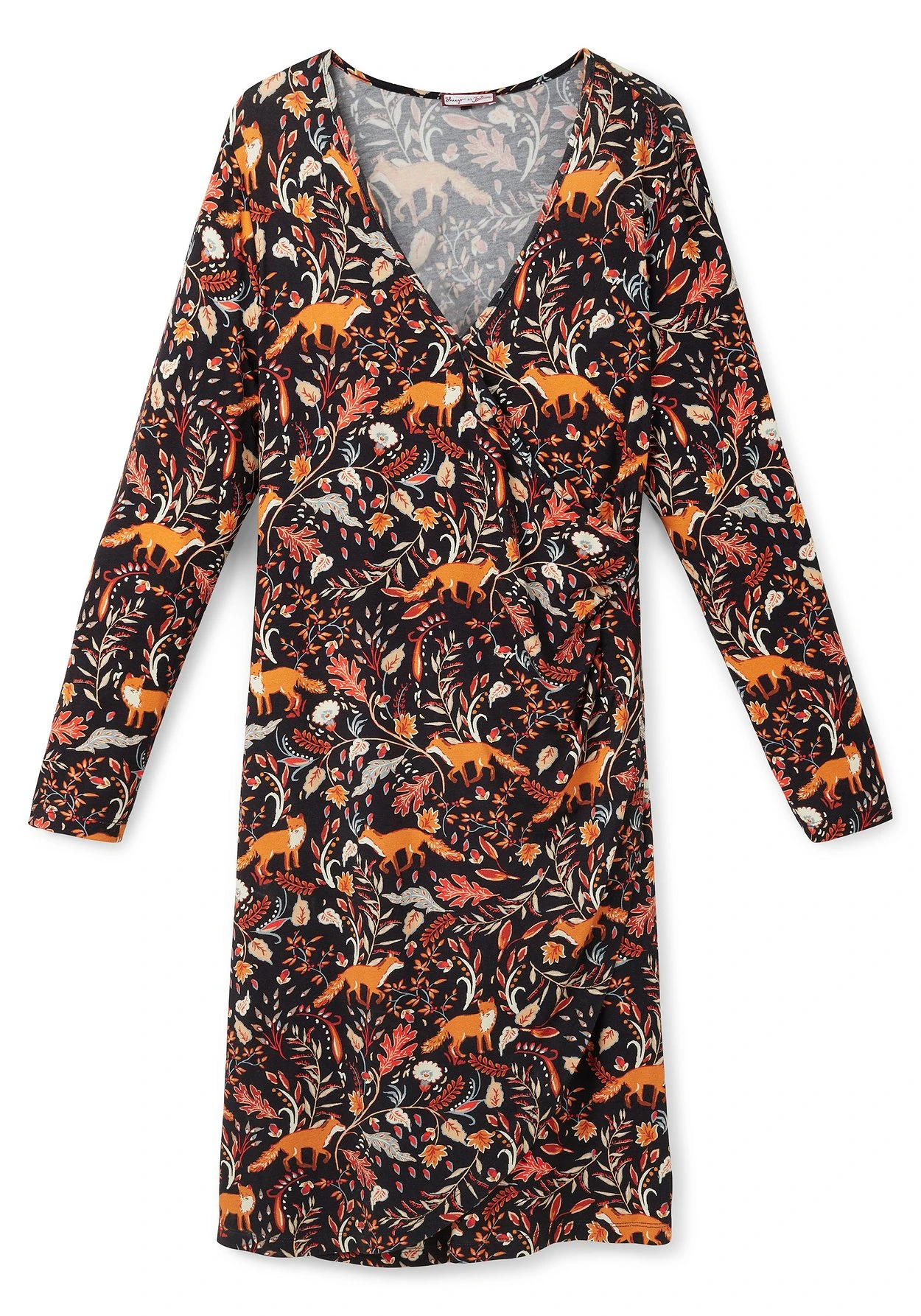 Der figurbetonte Schnitt endet in kniefreier Länge und umspielt locker die Beine. Der V-Ausschnitt wirkt optisch streckend, auch die seitliche Raffung schmeichelt der Figur.
