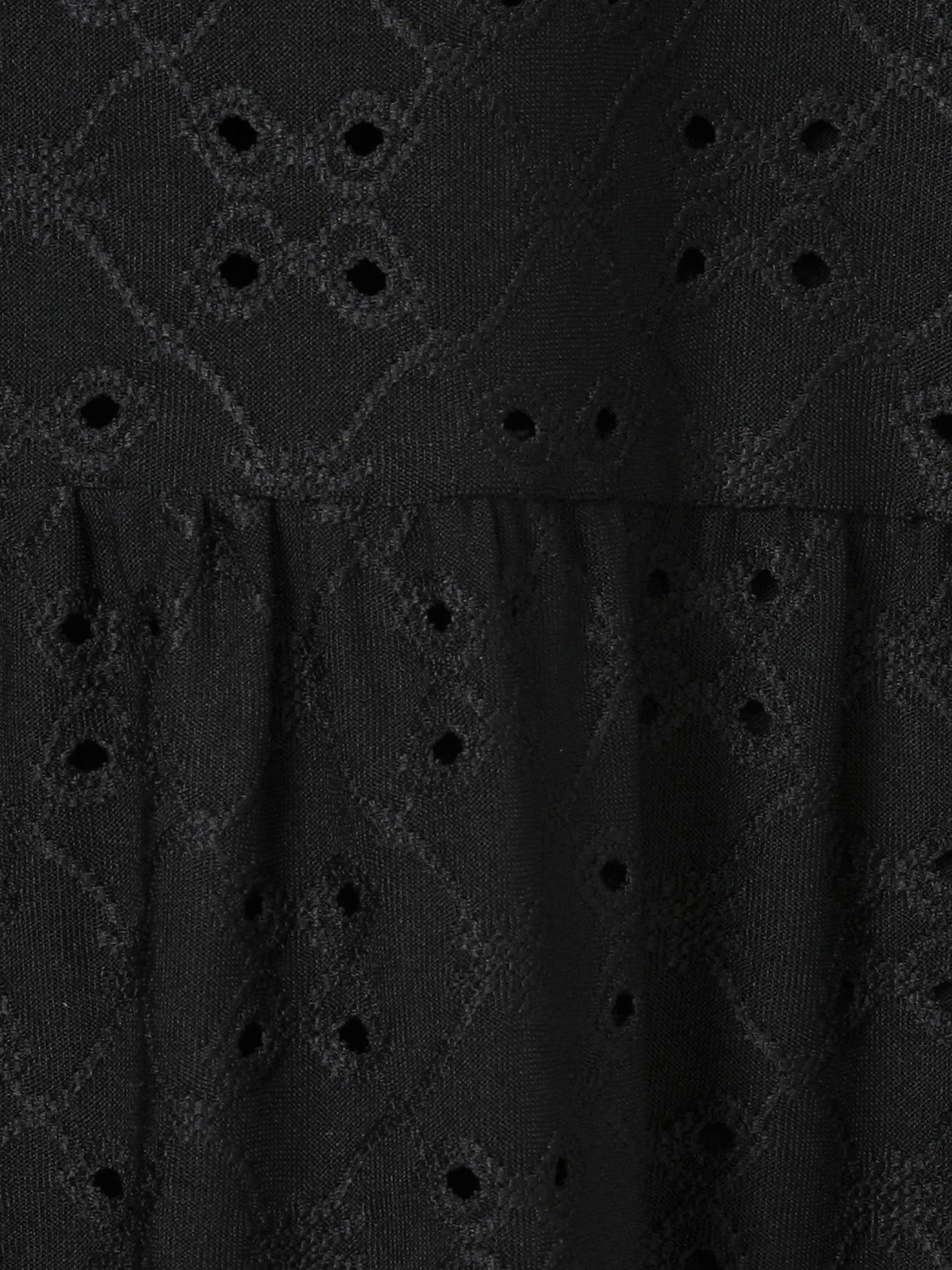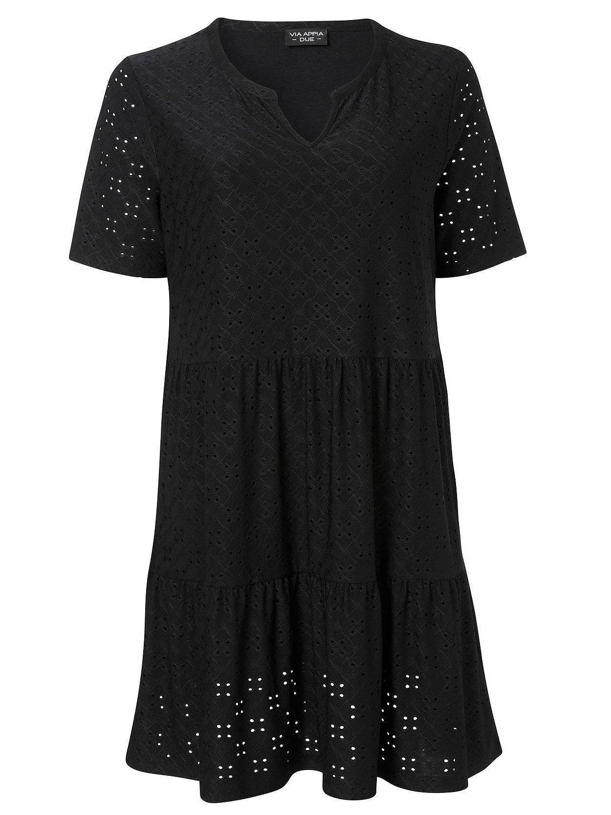 Kleid von VIA APPIA DUE. Die Lochstickerei lässt an Ärmel und Saum die Haut hervorblitzen und verleiht dem Kleid so eine sommerliche Anmutung. Die angekräuselten Teilungsnähte lassen eine gestufte Optik entstehen, der leicht ausgestellte Rock umspielt schmeichelnd die Beine.