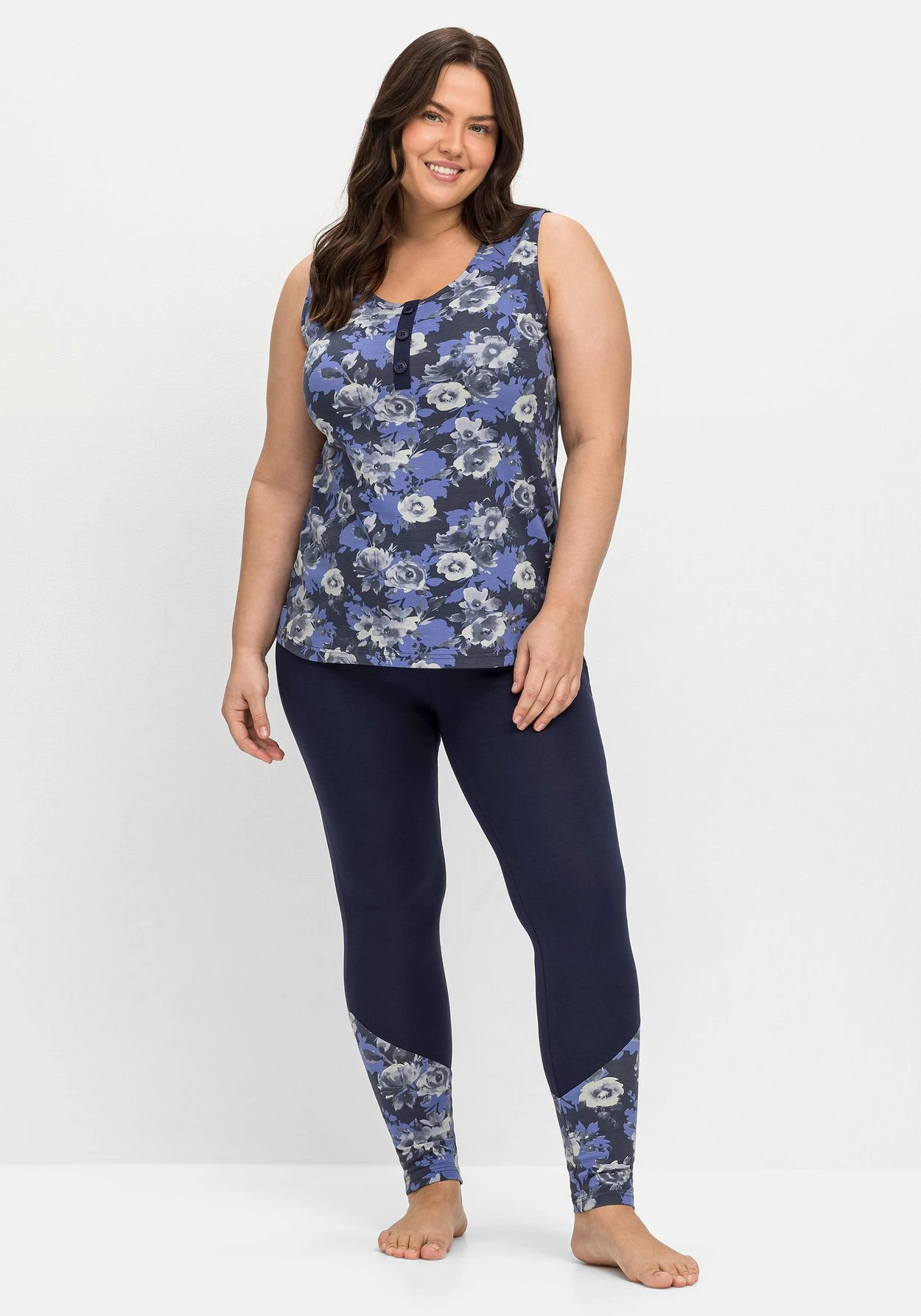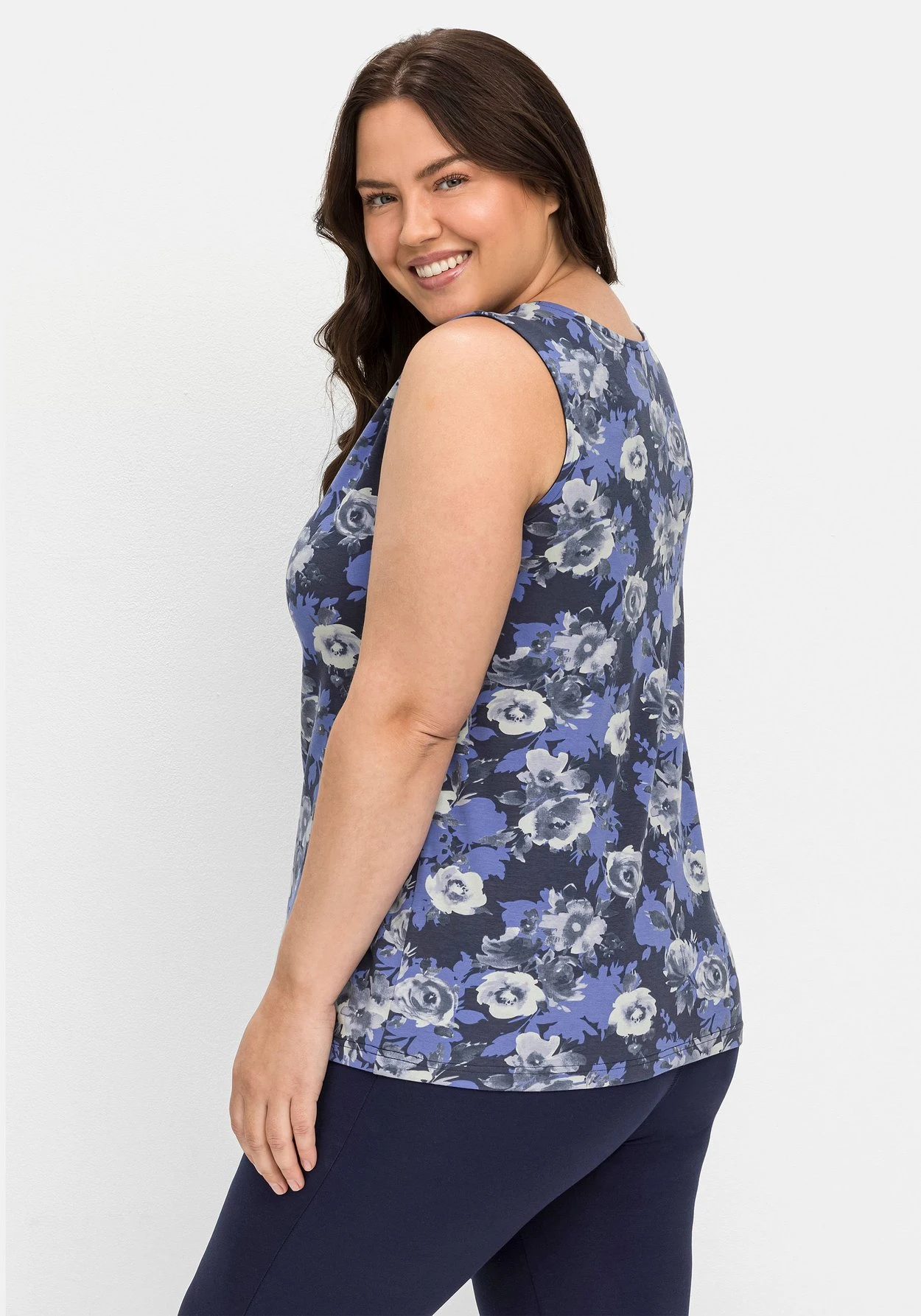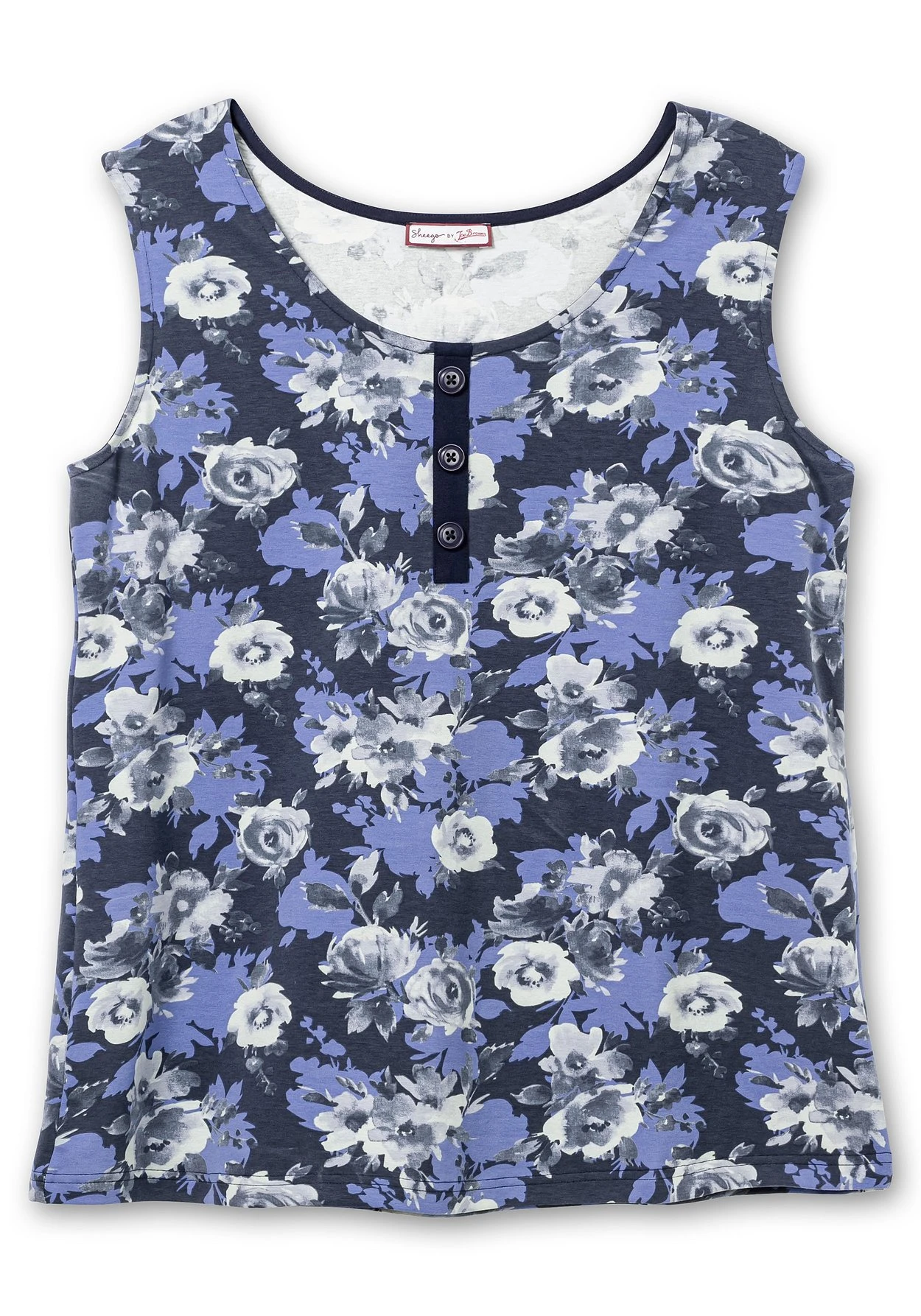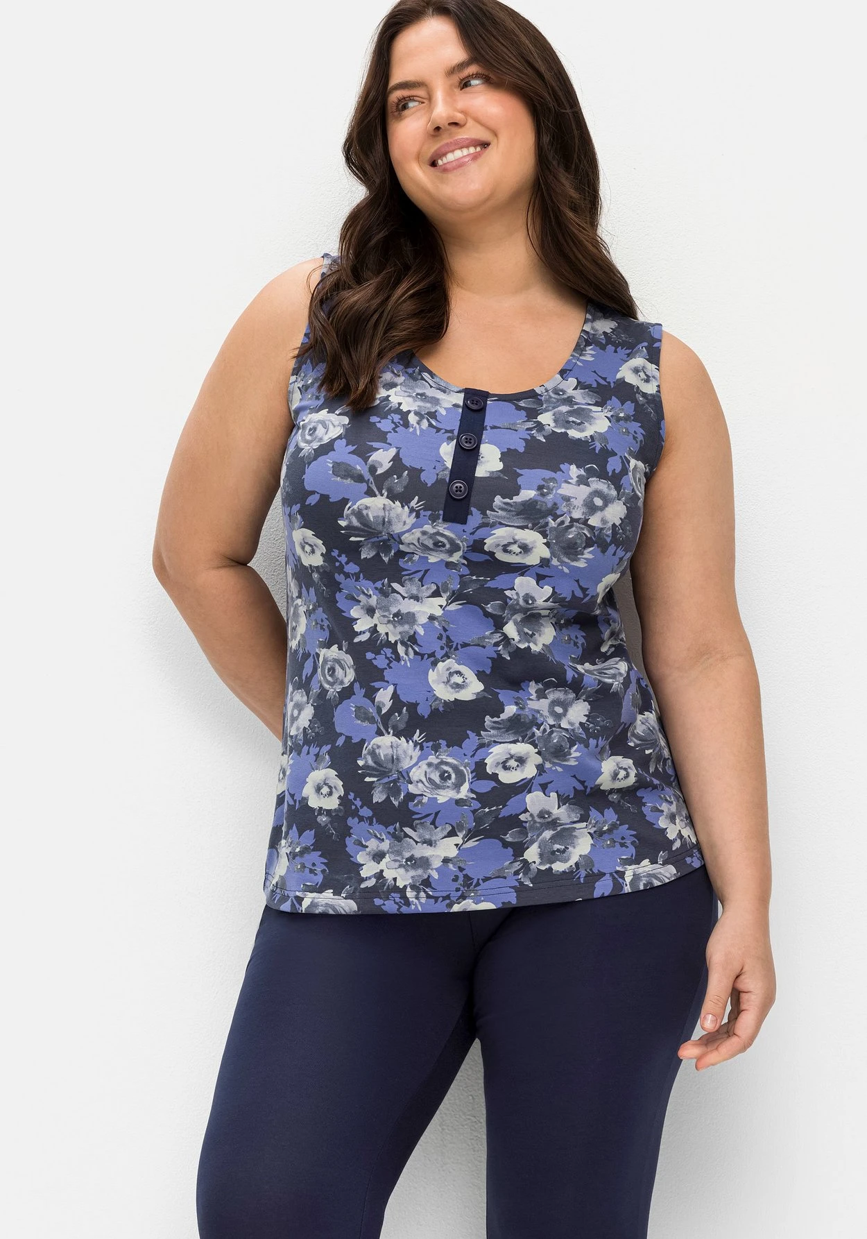 Jerseytop mit floralem Print von sheego by Joe Browns. Die ärmellose Form zeigt sich mit Rundhalsausschnitt und dekorativer Zierknopfleiste. Breite Träger garantieren einen komfortablen Sitz und lassen die BH-Träger mühelos verschwinden. Der sportive Schnitt wird durch den Blumendruck feminin abgerundet.