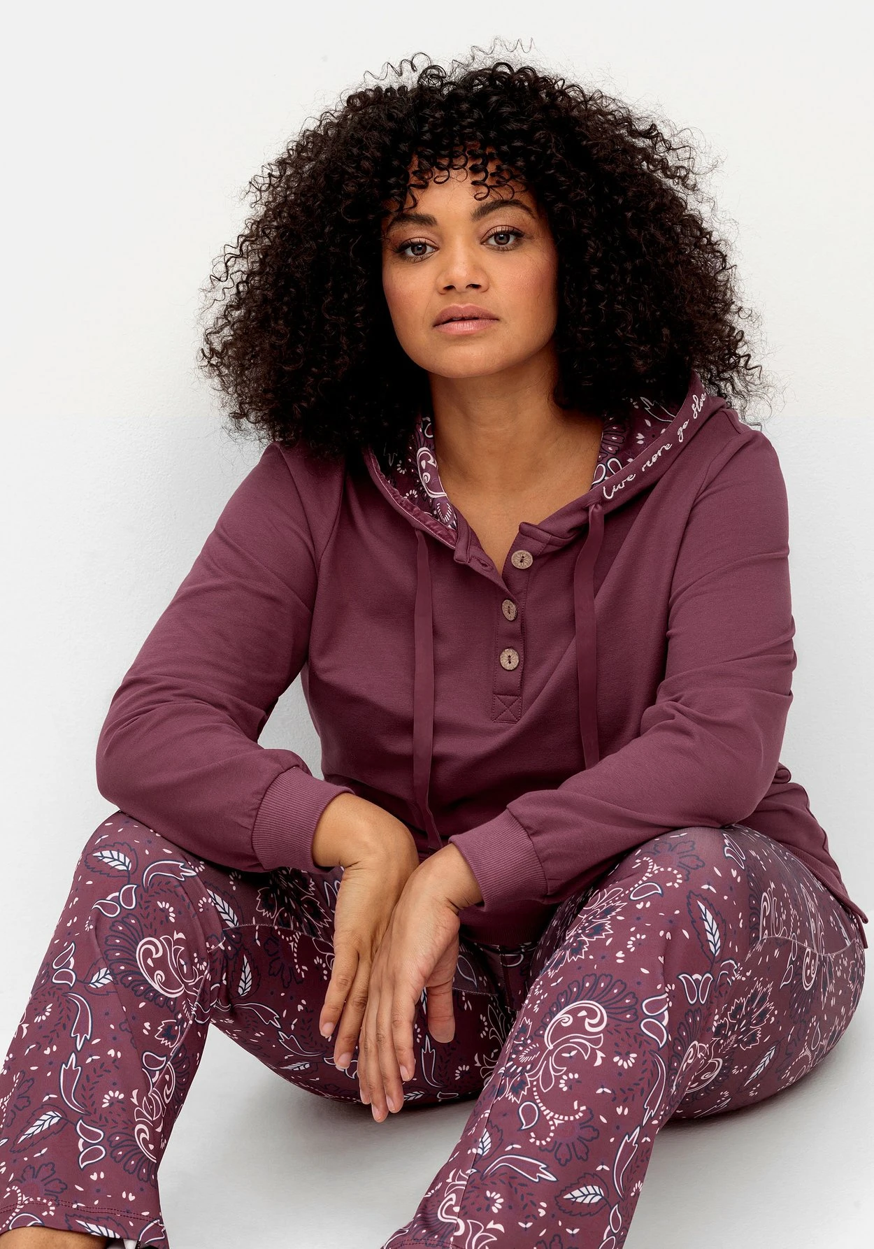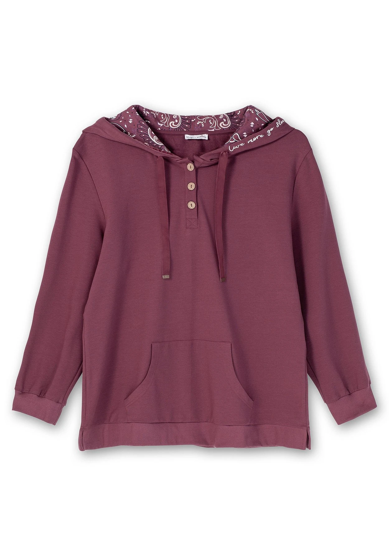 Kapuzensweatshirt von sheego by Joe Browns, mit kurzer Knopfleiste und dekorativen Knöpfen in Holzoptik. Der Relaxstyle erhält durch das filigrane Paisley-Innenfutter der Kapuze und das Bindeband in Samtoptik eine feminin-verspielte Note. Außen an der Kapuze zeigt sich eine kleine Wording-Stickerei in Kontrast, elastische Rippbündchen schließen bequem am Ärmelabschluss und Saum ab. Praktisch ist die Kängurutasche, die zusammen mit der Kapuze für eine sportive Optik sorgt. Seitliche Schlitze am geraden Saum lassen den Hoodie locker über die Hüfte fallen. Ein perfekter Wohlfühl-Look, der wunderbar mit anderen Teilen aus unserer Homewear Kollektion kombiniert werden kann.