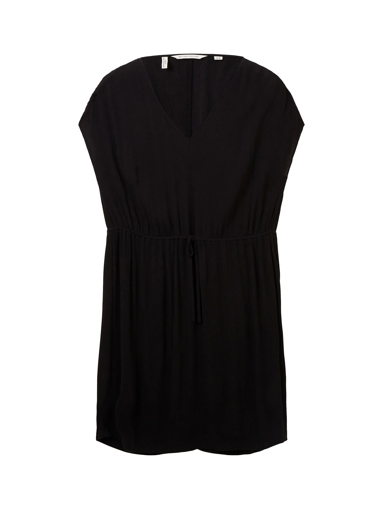 Kleid von TOM TAILOR Plus. Mit V-Ausschnitt und Fledermausärmeln lässt es eine bequeme und dabei zeitlos moderne Optik entstehen. Der Gummizugbund gibt der Silhouette Form und betont auch mit den Bindebändchen die Körpermitte.