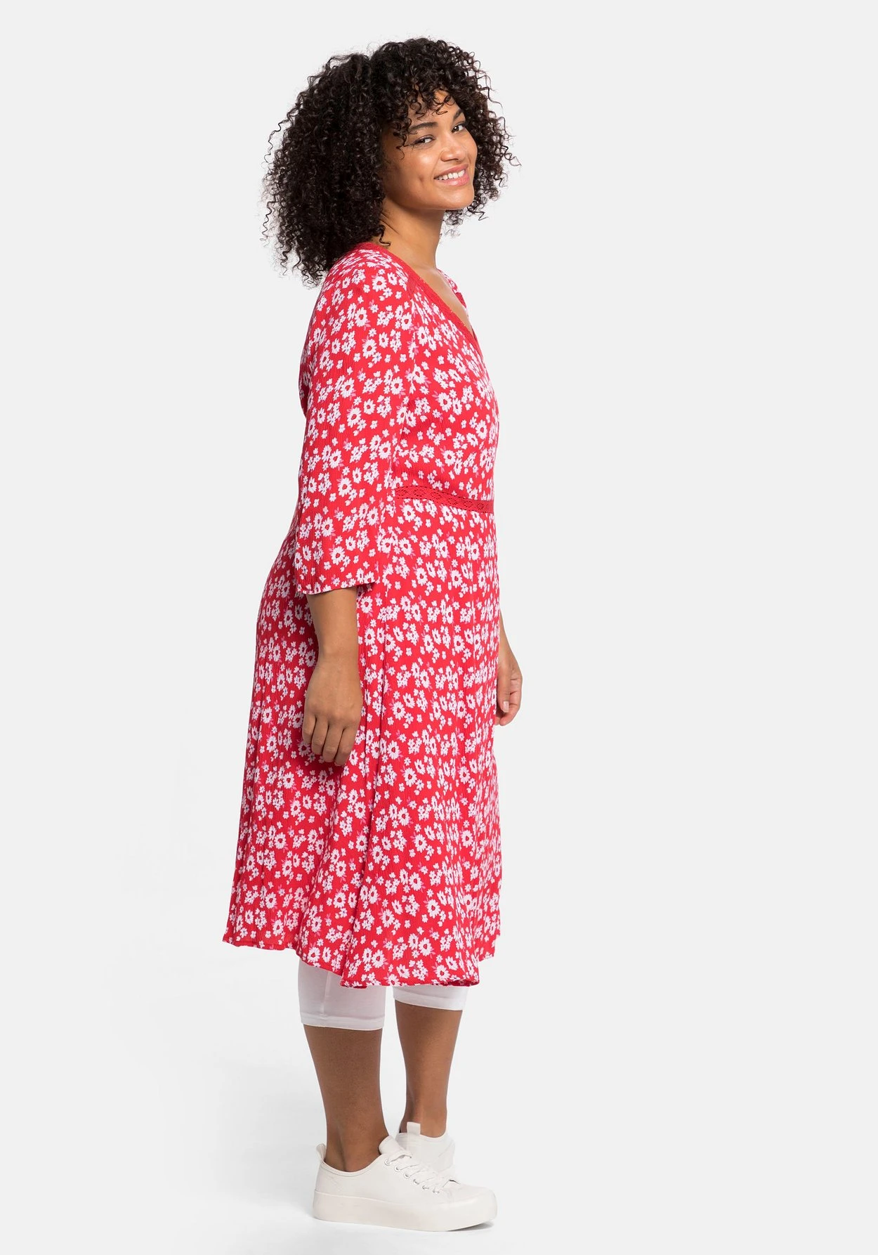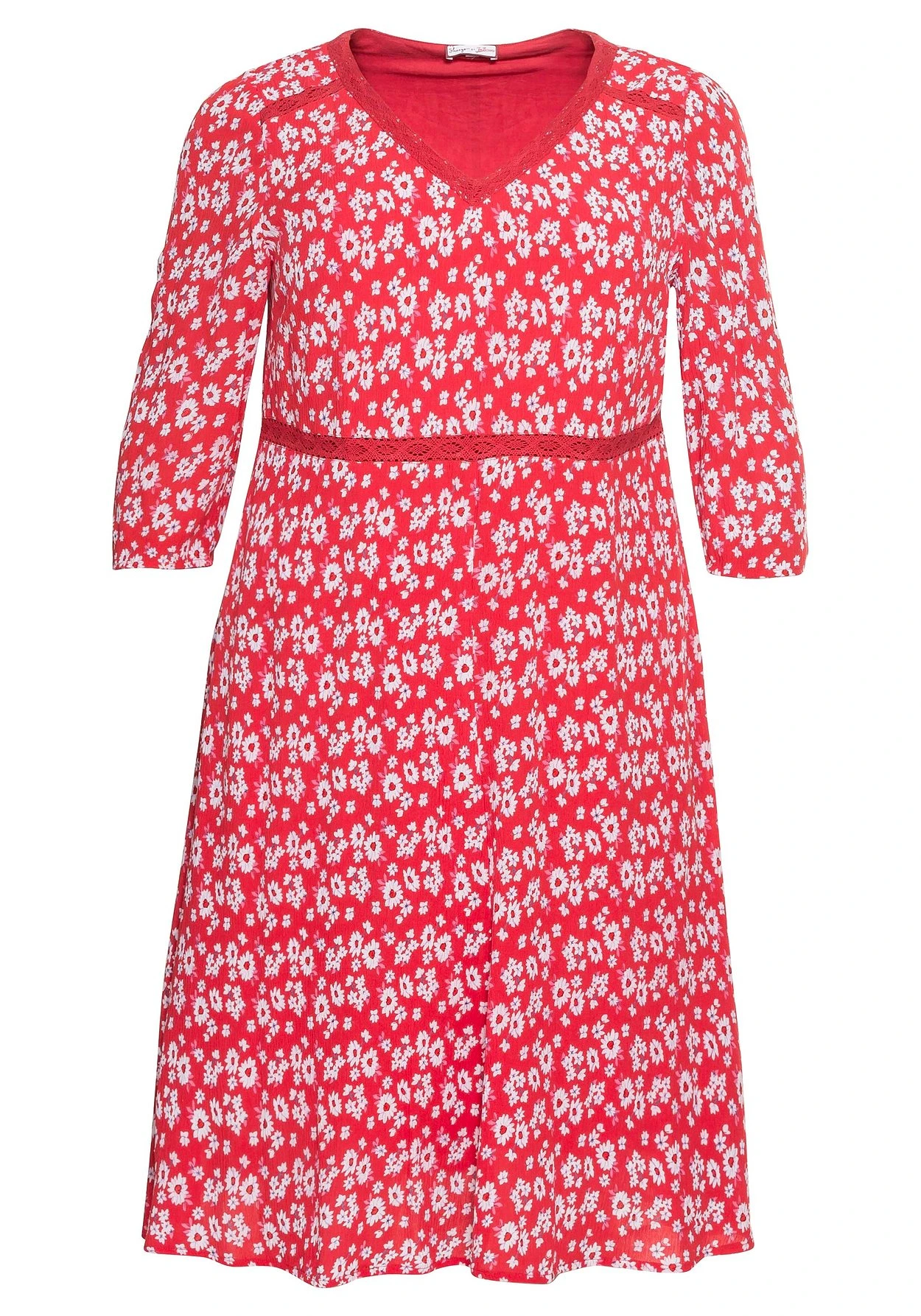 Kleid mit 3/4-langen Ärmeln von sheego by Joe Browns. Der zarte Blümchendruck wird durch den Crochet-Spitzenbesatz am V-Ausschnitt, an der Schulter und in der Taille vorn feminin ergänzt. Das ausgestellte Rockteil ist in kniebedeckender Länge gearbeitet und schwingt mit jedem Schritt schön mit. Für einen leichteren Einstieg sorgt der nahtfeine, seitliche Reißverschluss.