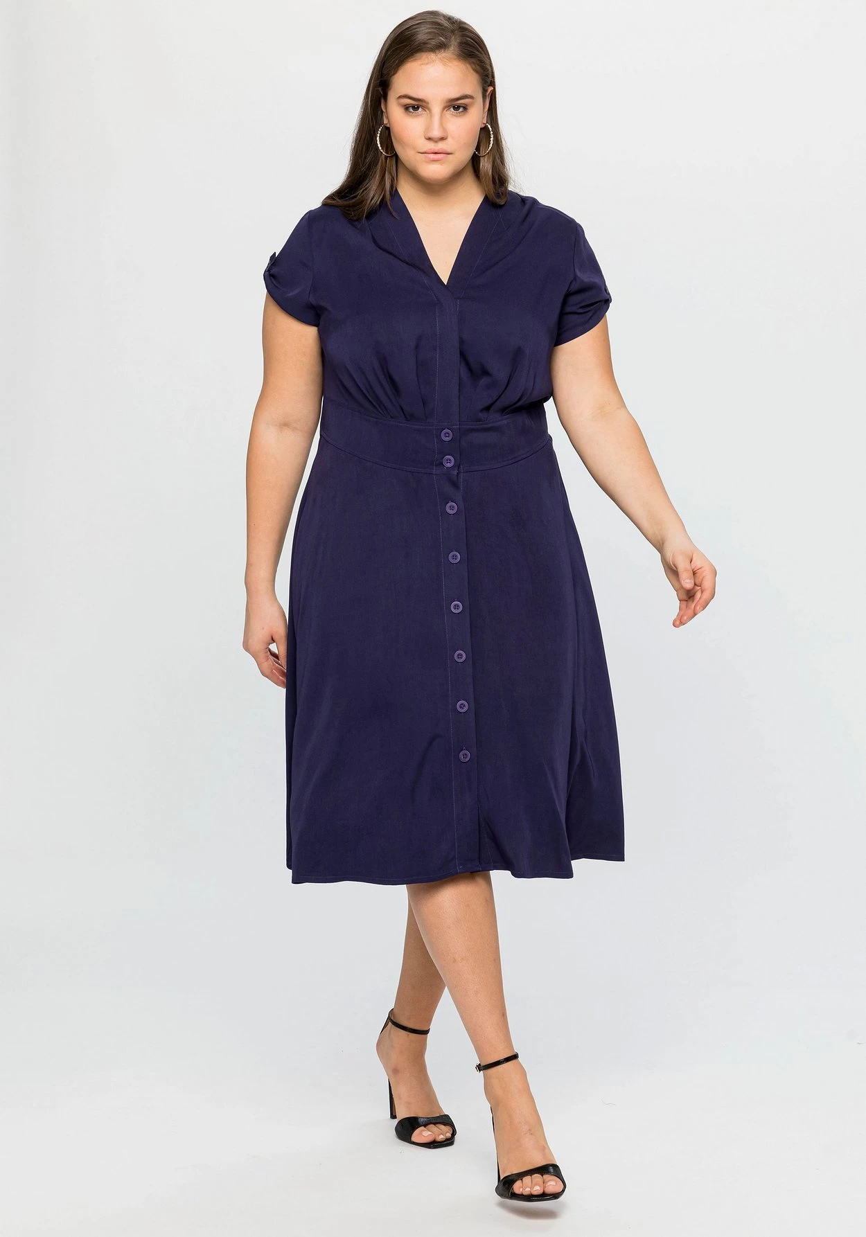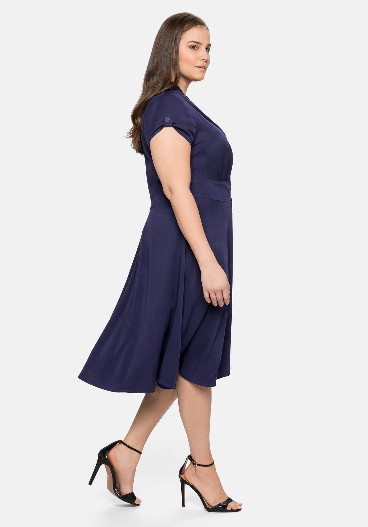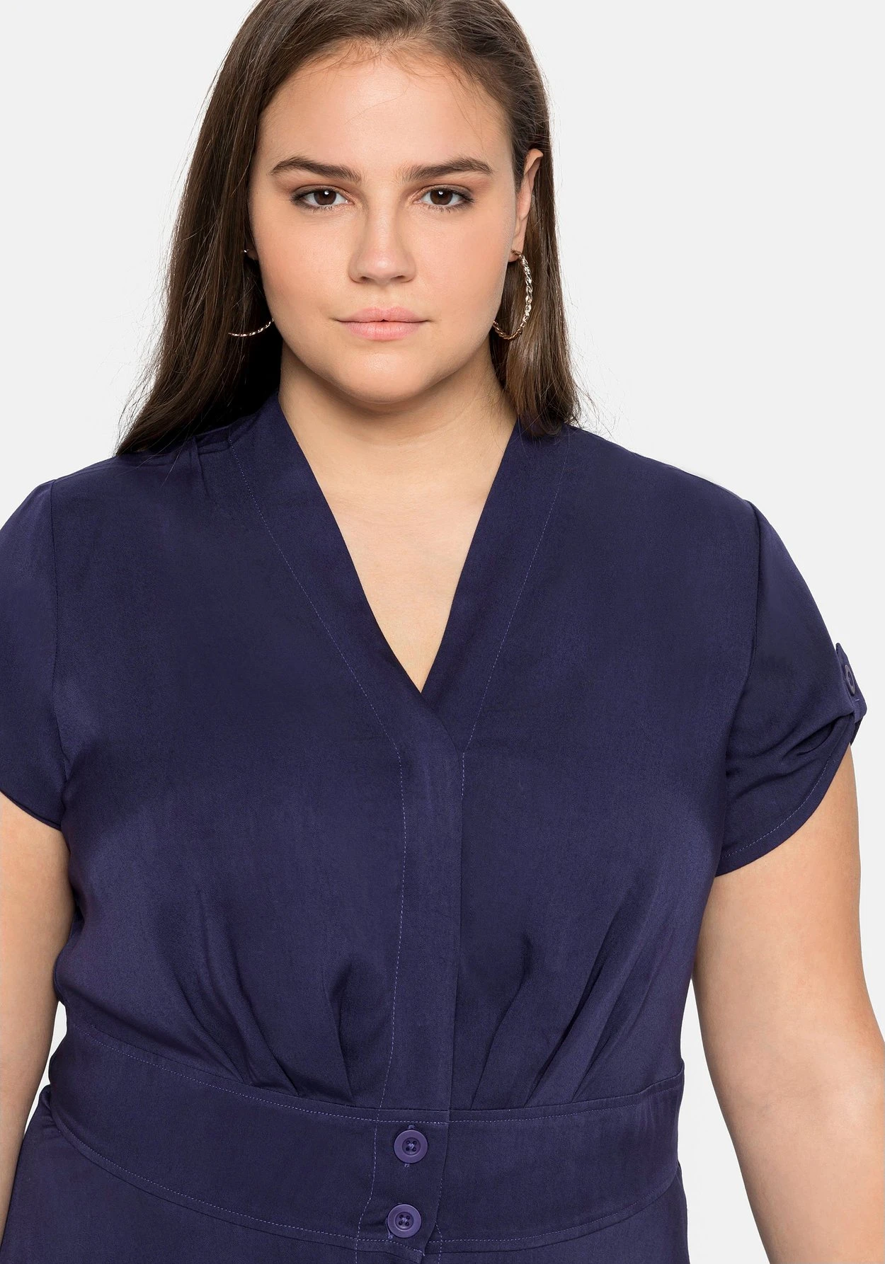 Kleid von sheego by Joe Browns. Der feminine Fit zeigt sich mit V-Ausschnitt und durchgehender Knopfleiste. Druckknöpfe am Ausschnitt sorgen für einen optimalen Sitz. Die sichtbaren Knöpfe lassen eine streckende Linie entstehen, das breite Taillenband auf Hüfthöhe betont die Körpermitte. Darunter schließt sich ein weit schwingender Rock an. Die kurzen Ärmel können entspannt hochgekrempelt und mit einem Knopf fixiert werden.