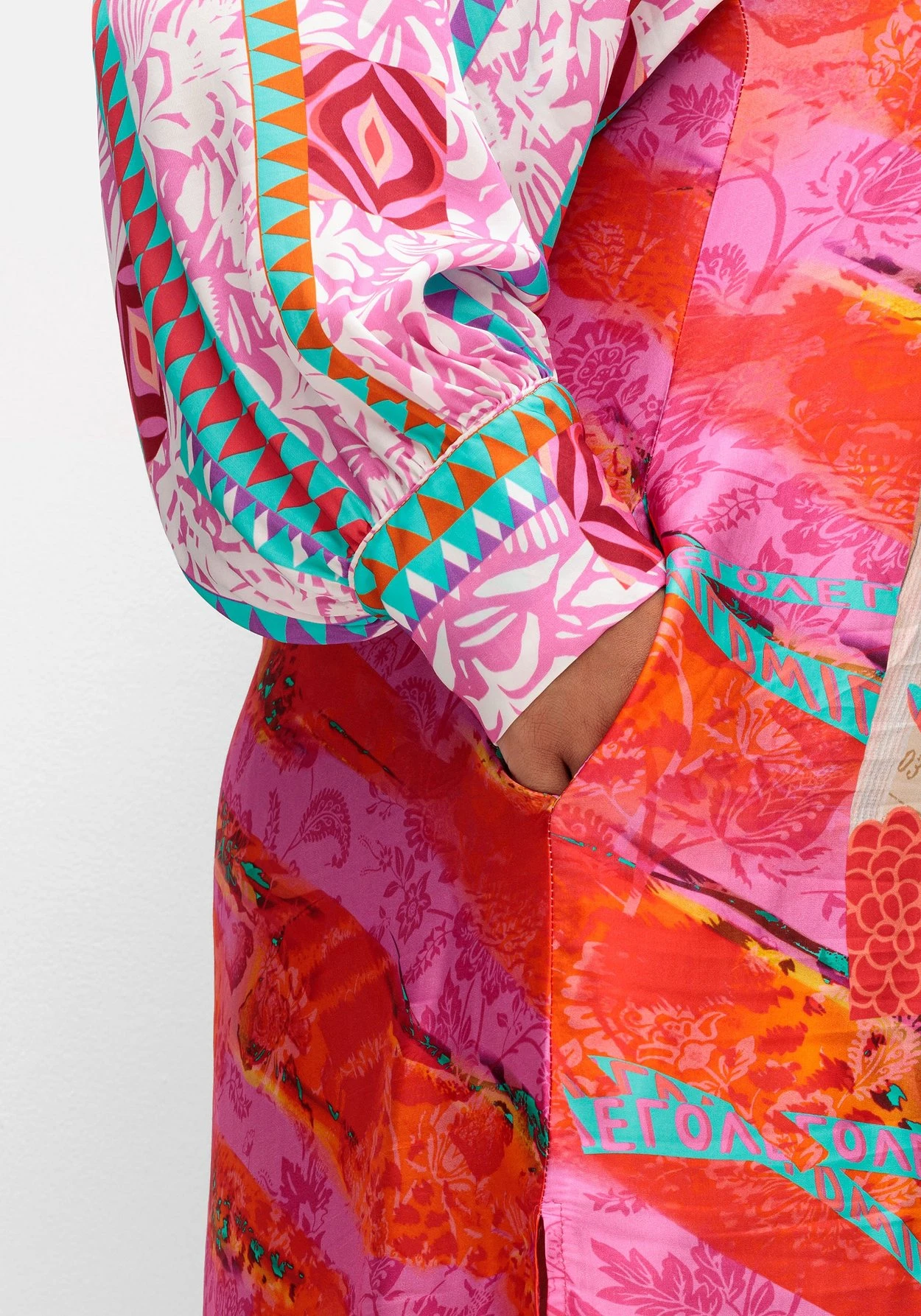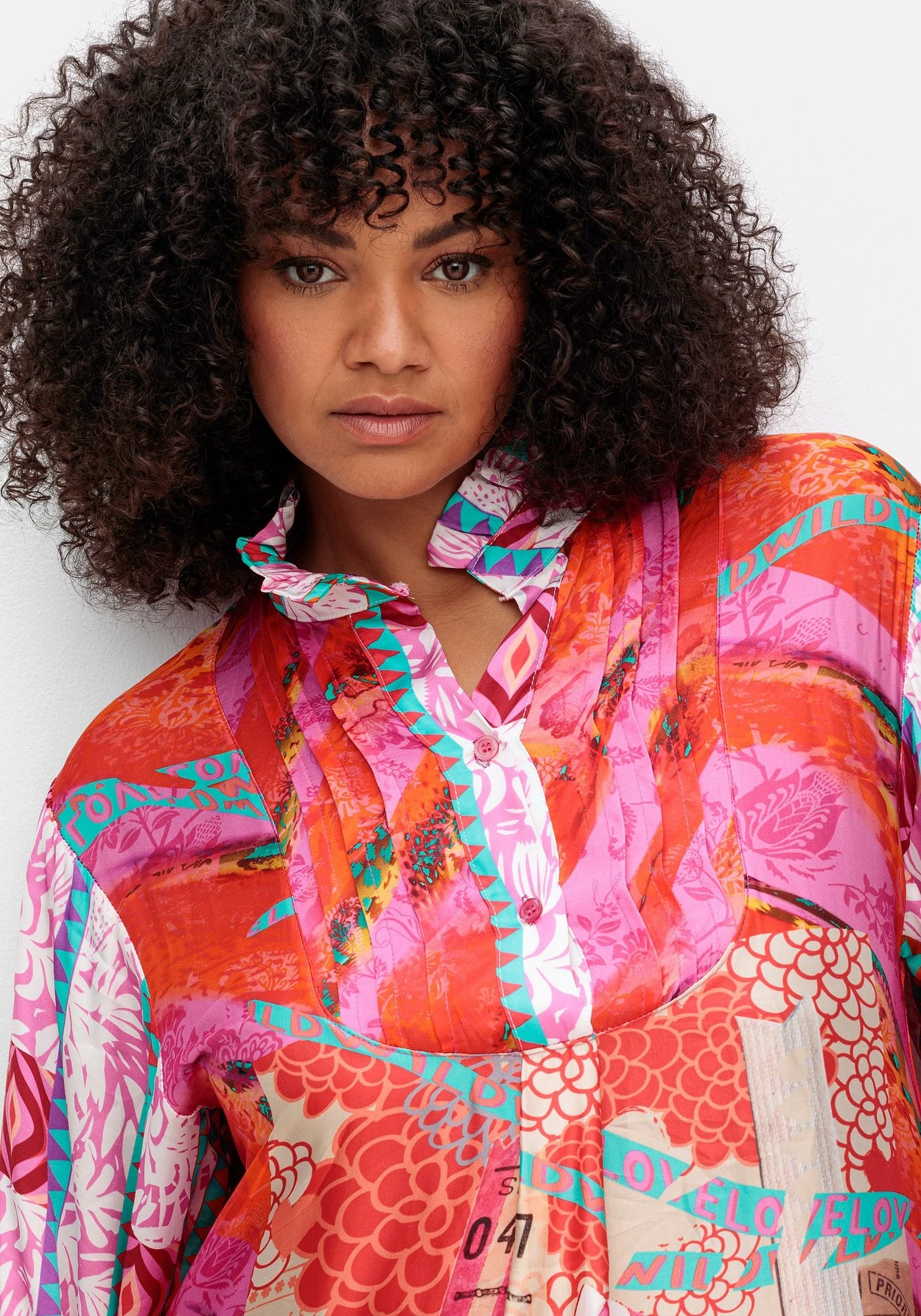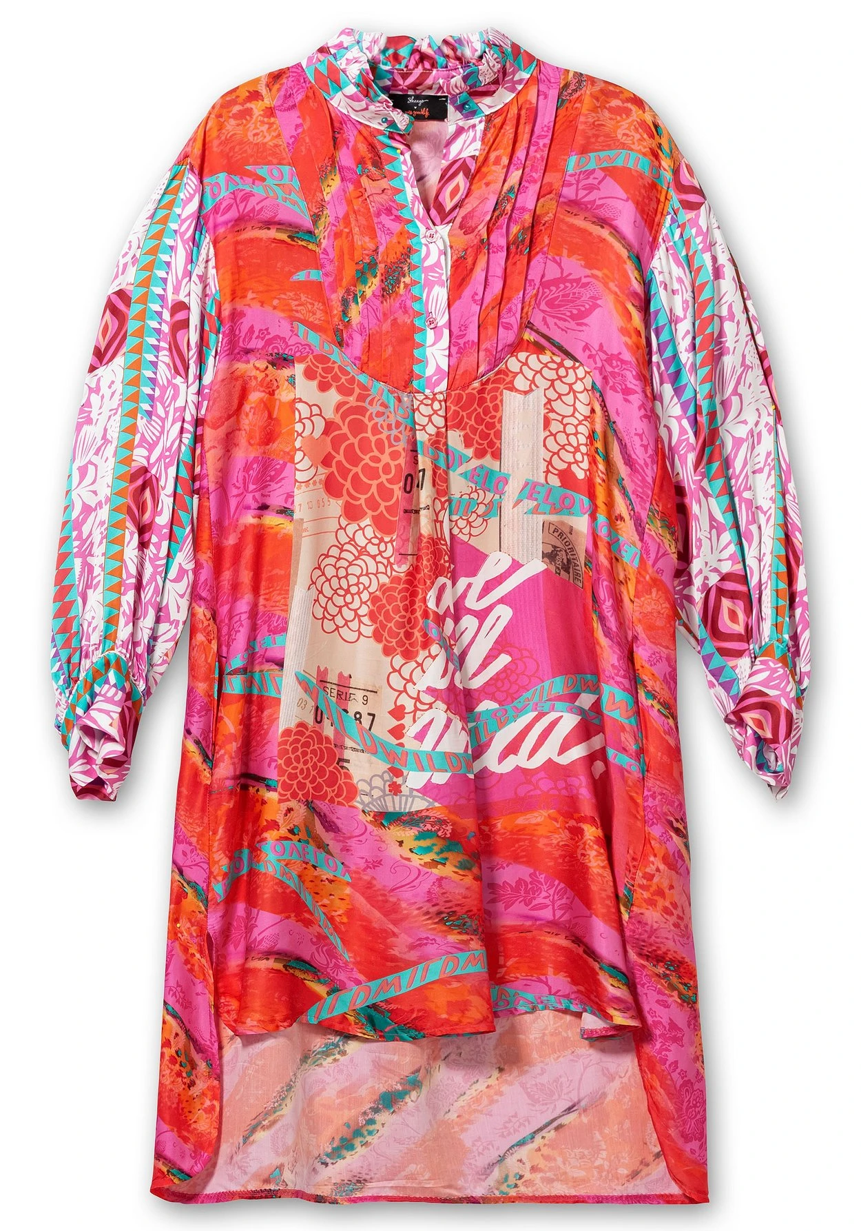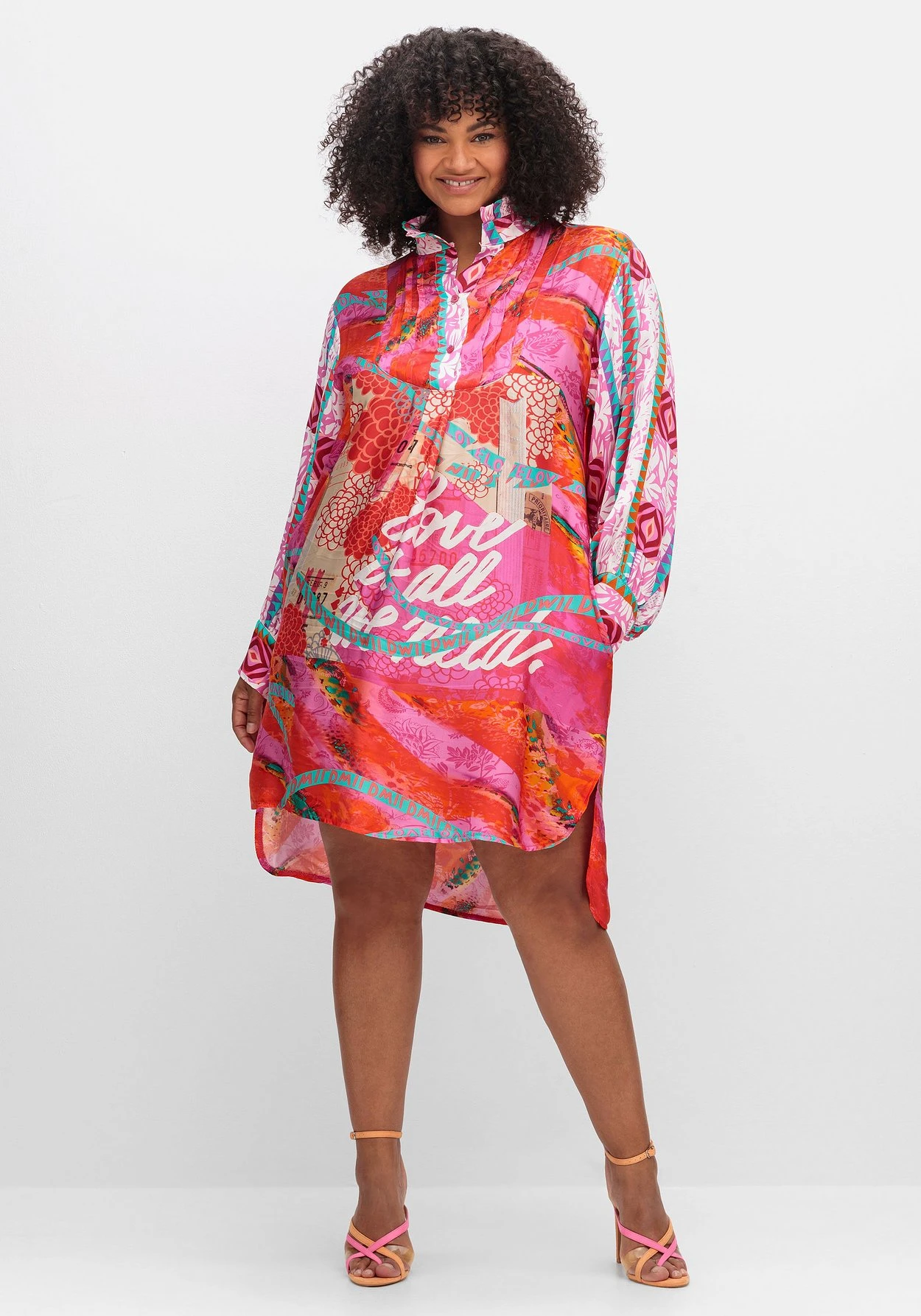 Kleid im Hemdblusen-Stil von sheego loves miss goodlife. Vorn zeigt es sich feminin in kniefreier Länge, hinten reicht der Style bis unter die Kniekehle. Das Kleid ist mit einem streckenden V-Ausschnitt und kurzer Knopfleiste gestalten, ein Stehkragen mit kleiner Rüsche sowie die dekorativen Biesen darunter sind modische Details. Die weiten Ärmel sind überschnittenen, enganliegende Manschetten lassen eine feminine Ballonform entstehen. Hingucker ist der farbenfrohe Alloverdruck, bei dem Wordingprints, florale Drucke und Ethnomuster auf modische Weise zusammenkommen.