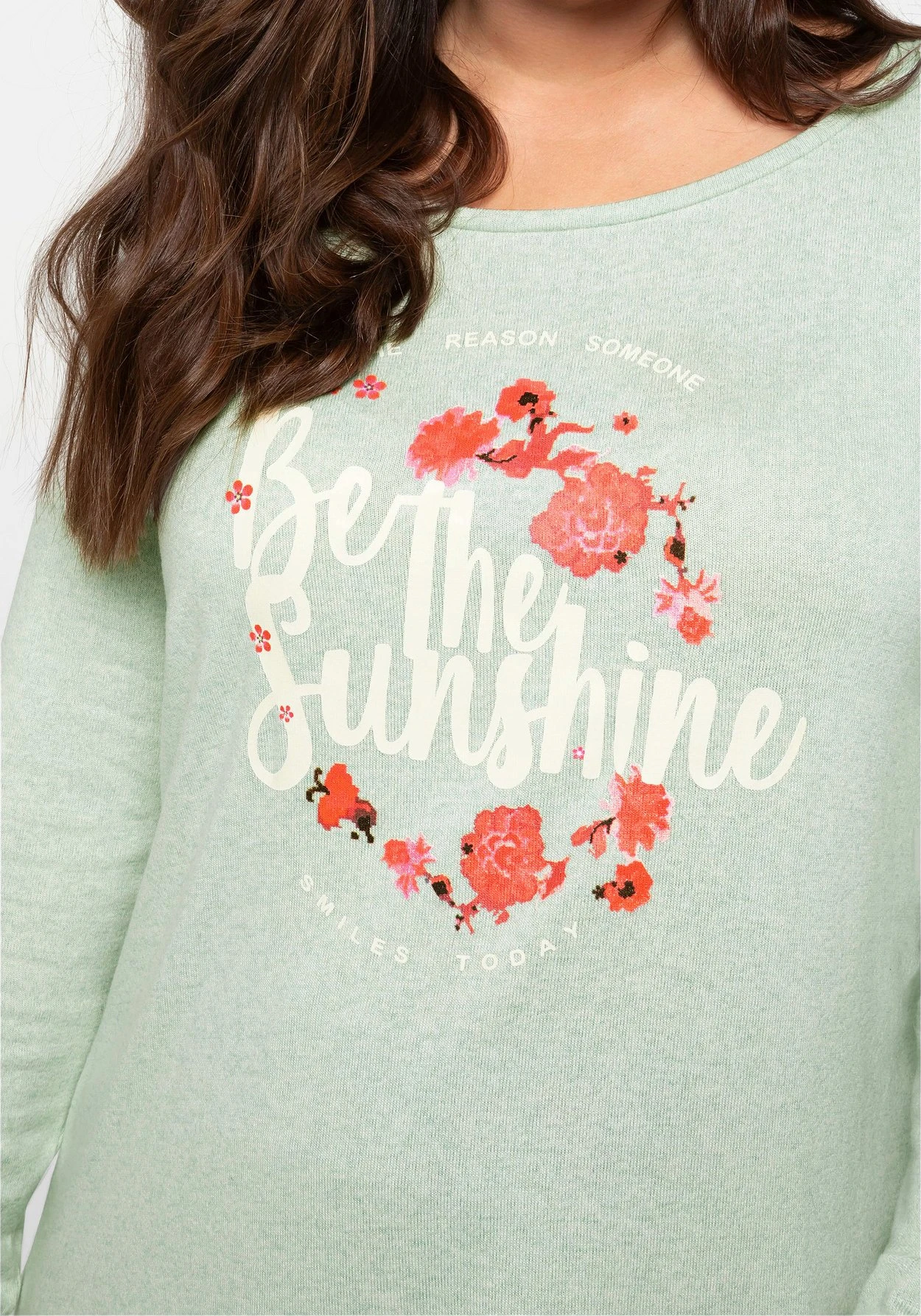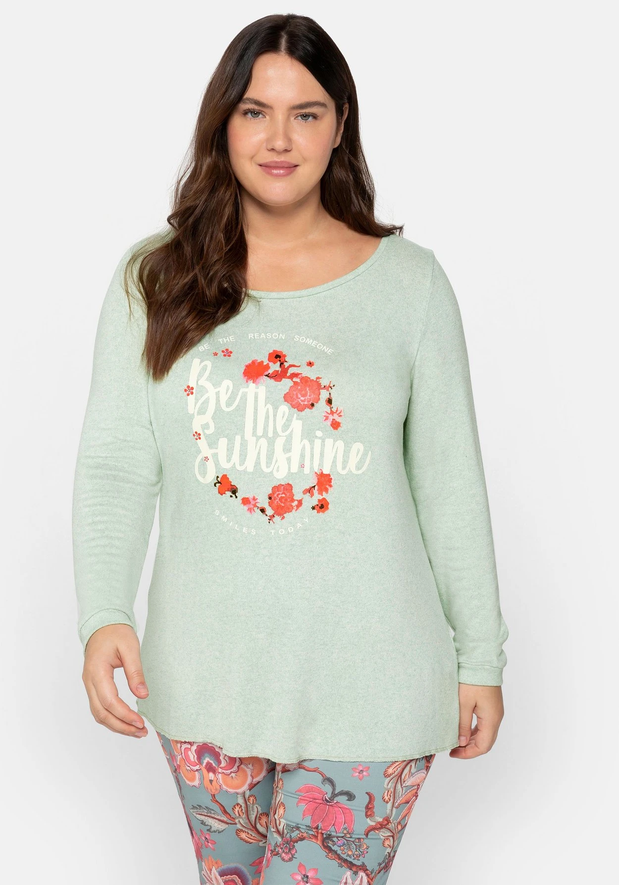 Shirt in Melange-Optik von sheego by Joe Browns. Der lässige Loungewear-Look ist nicht nur äußerst bequem, er begeistert auch durch seine supersofte Feinstrickqualität. Die langen Ärmel enden mit bequemen Rippbündchen, ein modischer Frontdruck und der weite U-Boot-Ausschnitt runden den Style feminin ab.