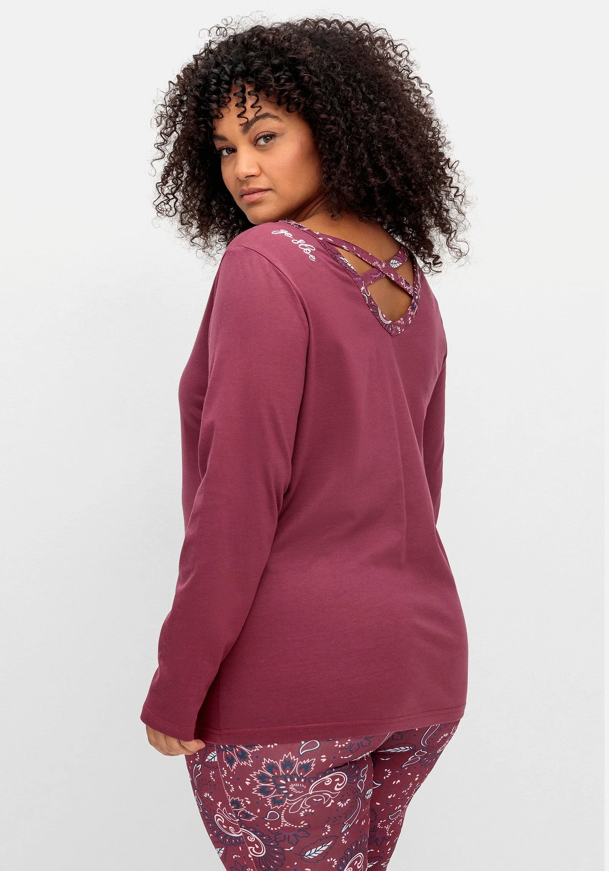 Langarmshirt von sheego by Joe Browns, mit bedrucktem Rundhals vorn. Hinten überrascht ein bedruckter, tieferer V-Ausschnitt, gekreuzte Bänder schmücken dekorativ die Rückenpartie. Ein Stickerei-Schriftzug setzt zusätzlich einen kontrastfarbenen Akzent. Mit passender Paisley-Hose aus unserer Homewear Kollektion macht den Loungewear-Look komplett.