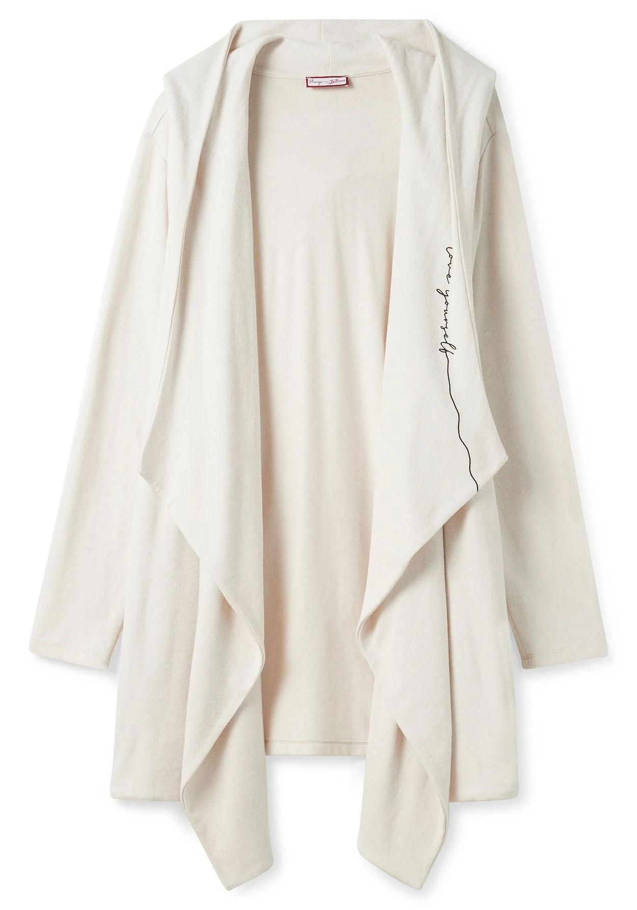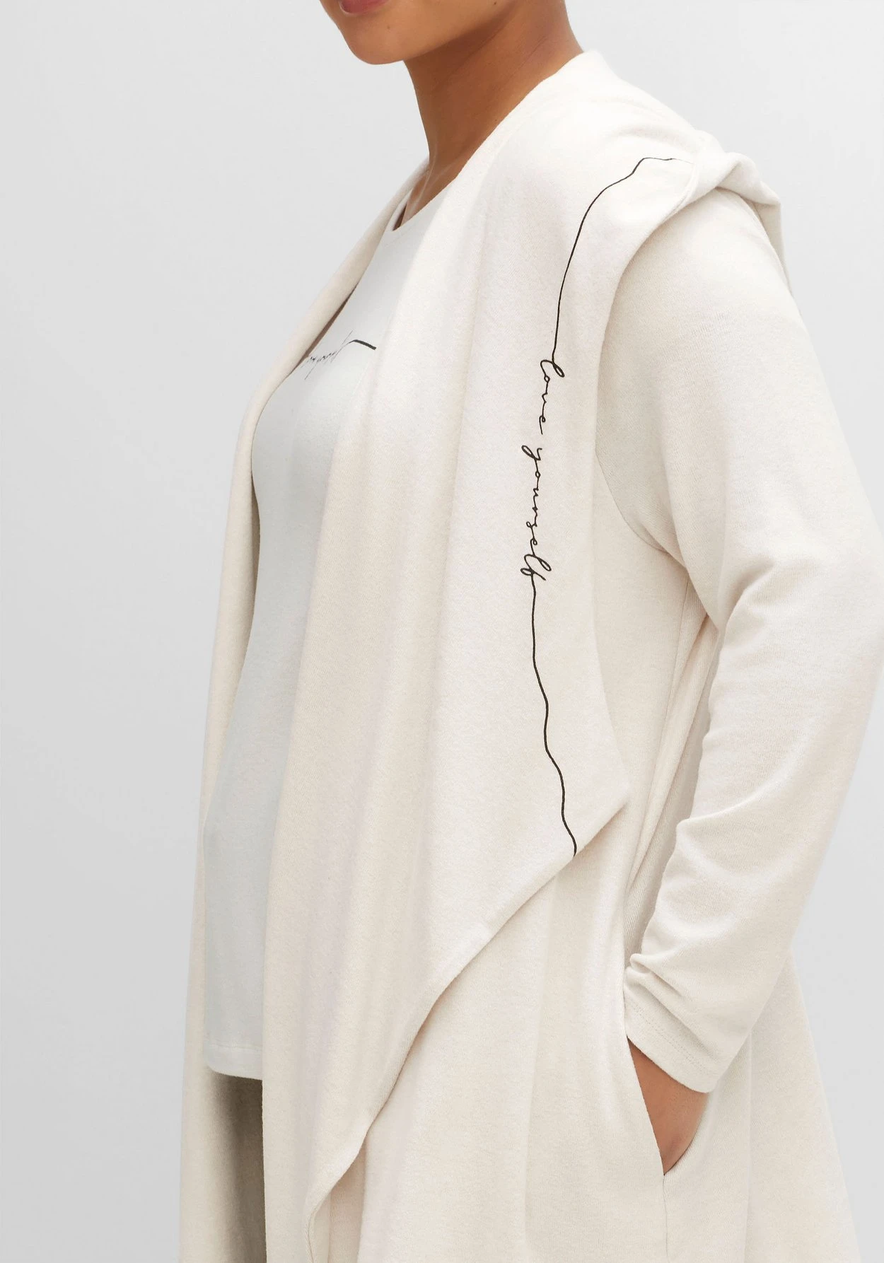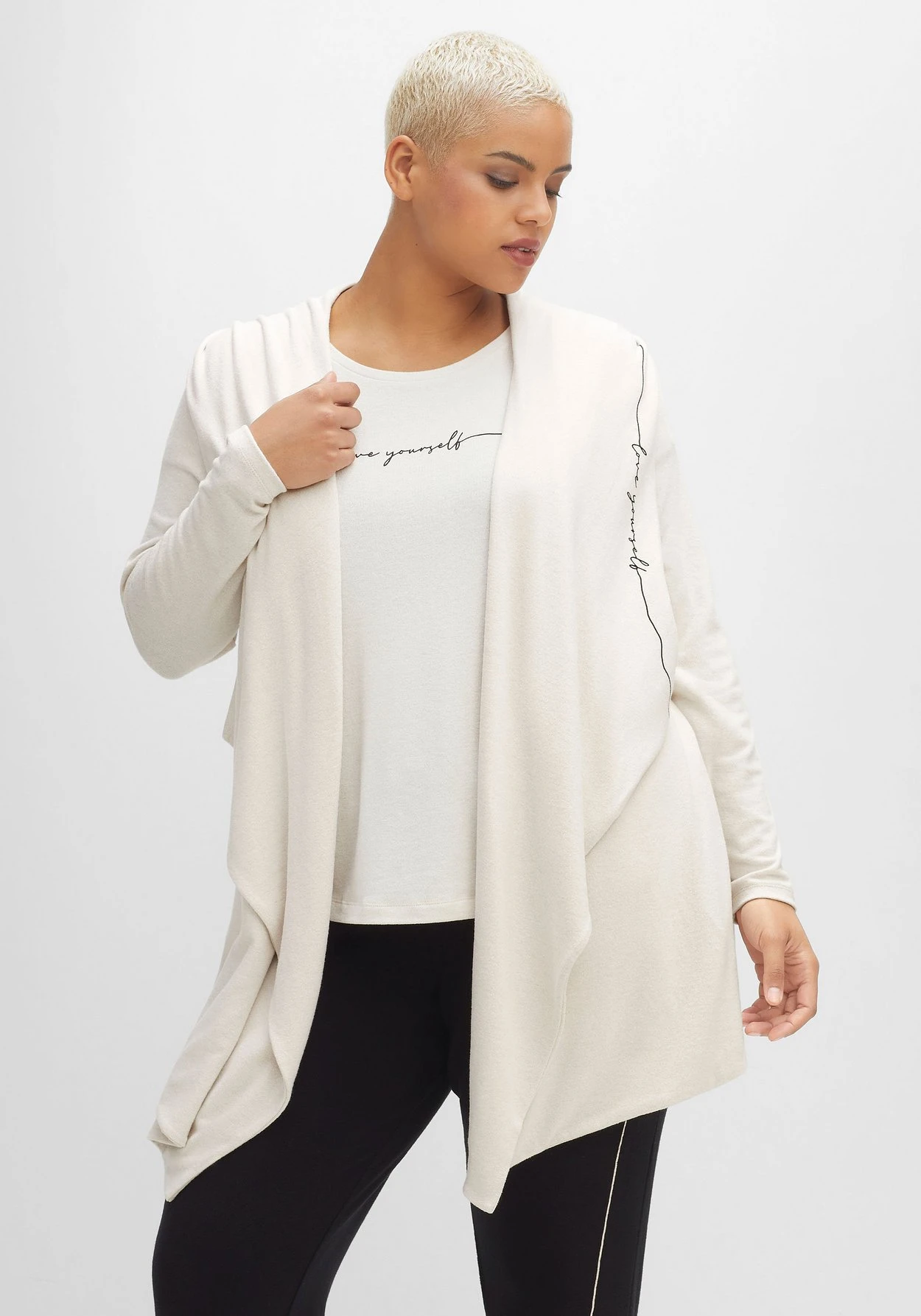 Longstrickjacke mit weit geschnittener Kapuze von sheego by Joe Browns. Der offene Oversized-Schnitt lässt einen zipfligen Double-Layer-Look entstehen. Einen kleinen farblichen Akzent setzt der Wordingprint vorn auf der linken Seite, der dekorativ in Linienform ausläuft. Nahtfeine Seitentaschen ergänzen den legeren Style.