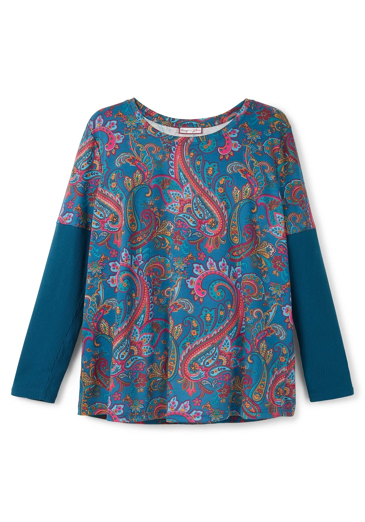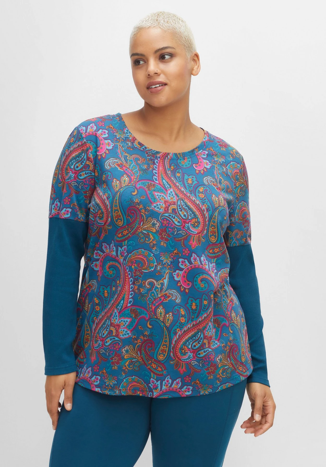 Langarmshirt von sheego by Joe Browns. Charakteristisch ist hier der farbenfrohe Paisleyprint. Unifarbene Partien am Ärmel setzen hierzu einen modischen Kontrast. Dazu kommen ein Rundhalsausschnitt und ein gerade geschnittener Saum in hüftbedeckender Länge.