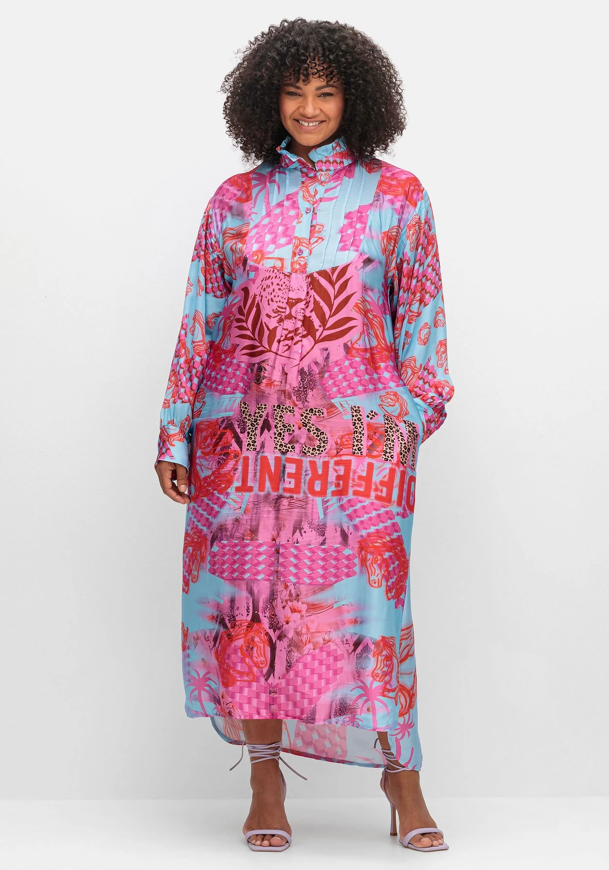 Maxikleid von sheego loves miss goodlife, aus leicht glänzendem Viskosesatin. Der sommerliche Style zeigt sich mit etwas tieferem V-Ausschnitt und einem wunderschönen Alloverdruck. Die langen Ärmel sind in dezenter Ballonform geschnitten und enden mir breiten Manschetten. Lässiges Finish sind die Taschen in der Seitennaht.