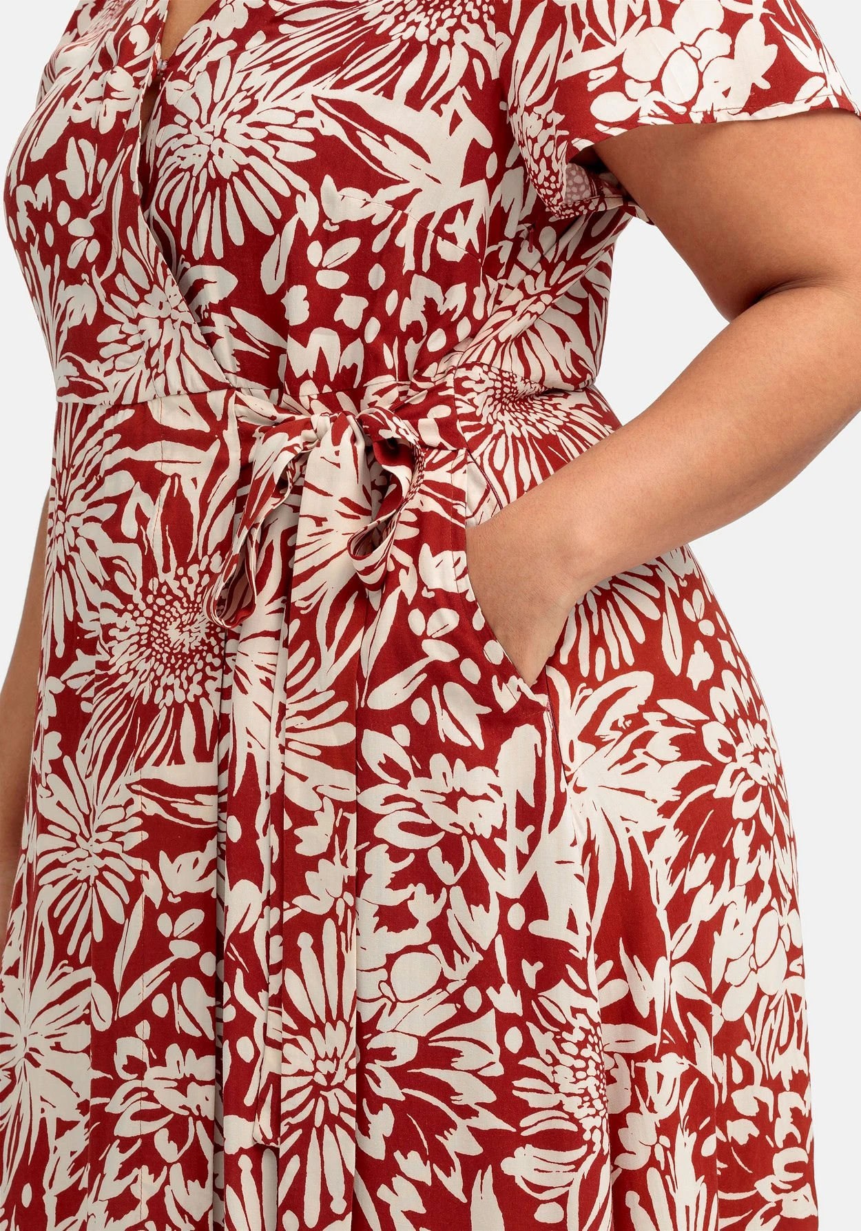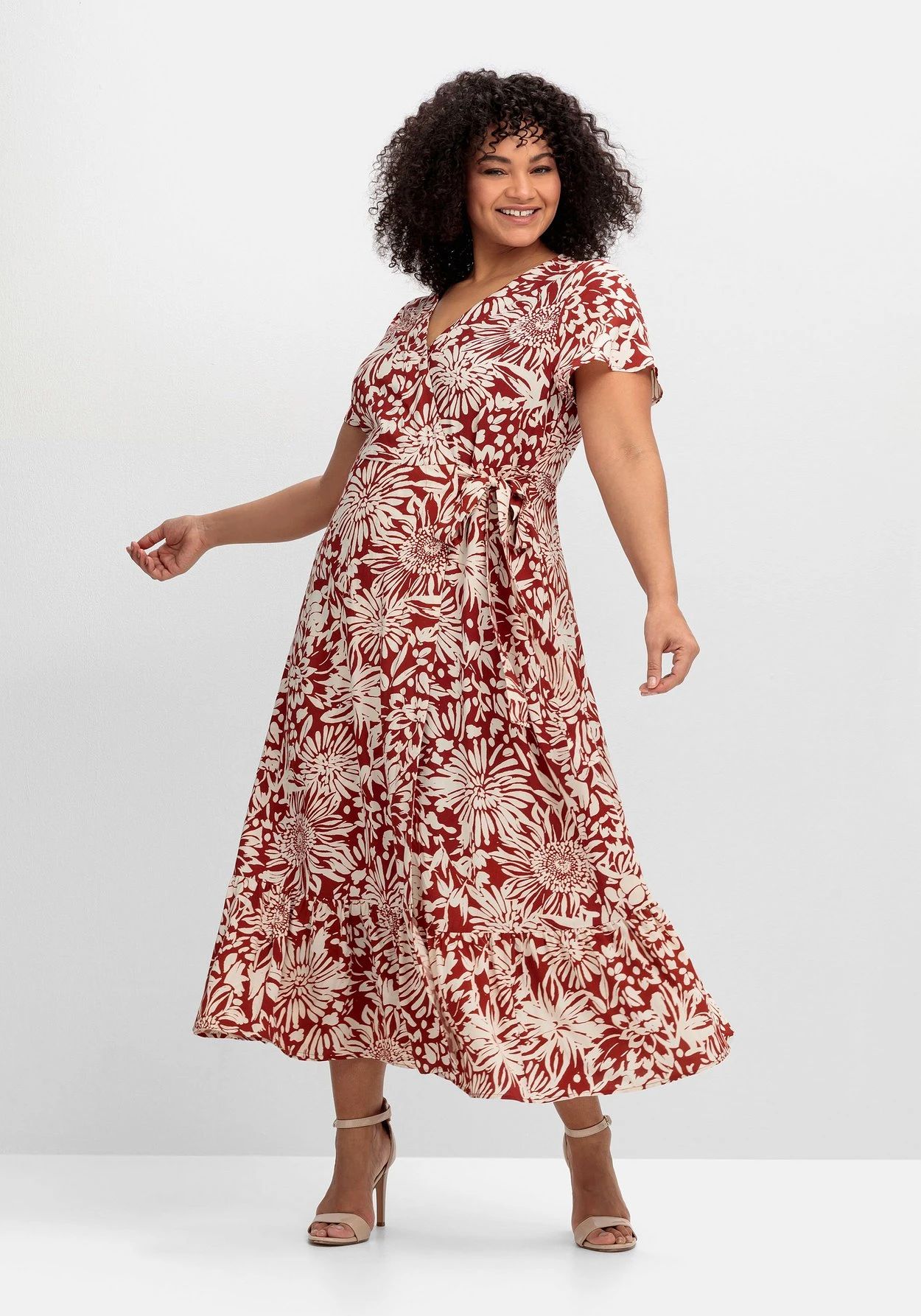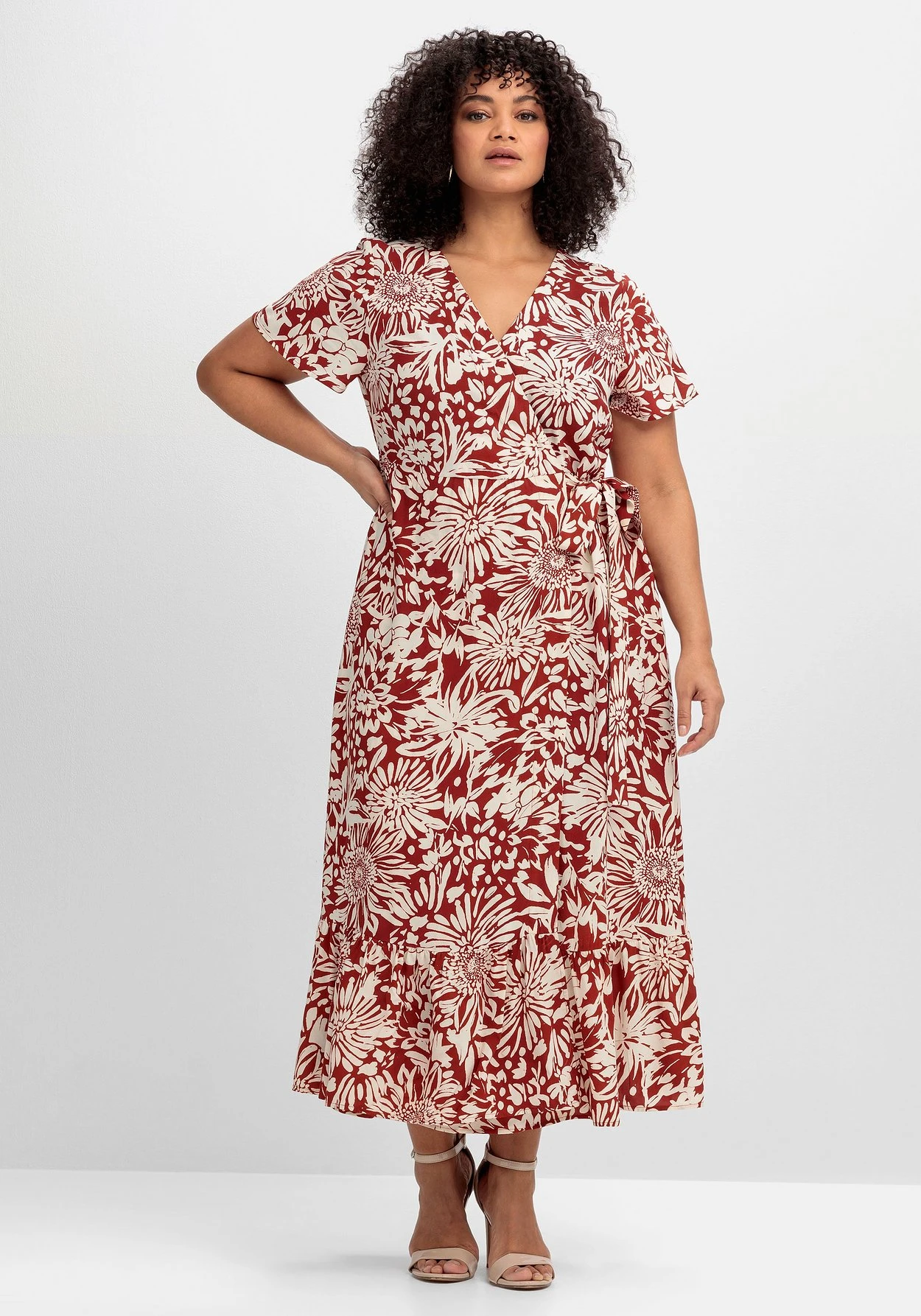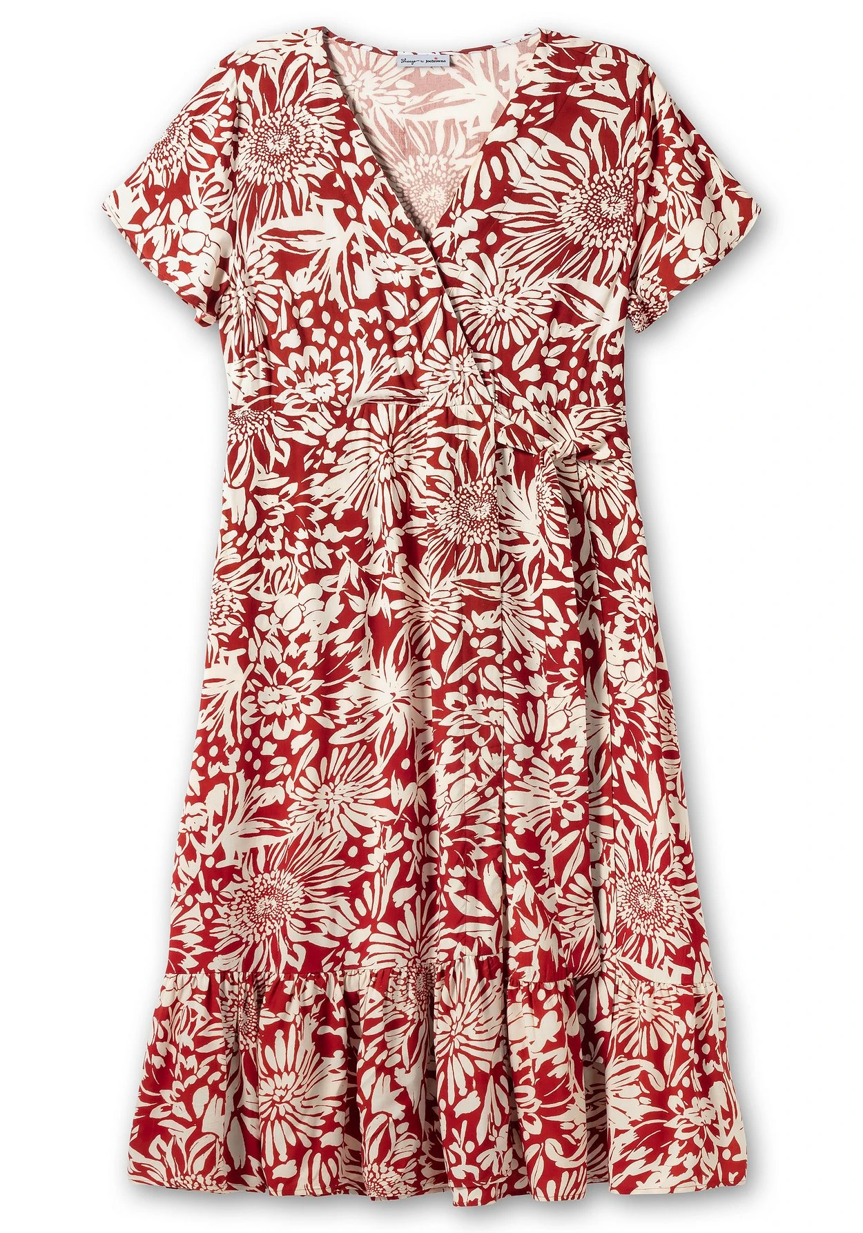 Maxikleid in Knöchellänge von sheego by Joe Browns. Dabei lebt der feminine Style von seinem kontraststarken Blumenprint. Die Wickeloptik lässt einen tiefen V-Ausschnitt entstehen, die kurzen Ärmel sind etwas weiter geschnitten. Ein seitlicher, nahtfeiner Reißverschluss ermöglicht ein bequemes Ankleiden, während das Bindeband in der Seite die Taille feminin betont. Darunter sorgt das weit schwingende Rockteil mit dekorativem Volant am Saum für eine schöne Silhouette. Zwei praktische Seitentaschen ergänzen den Look.