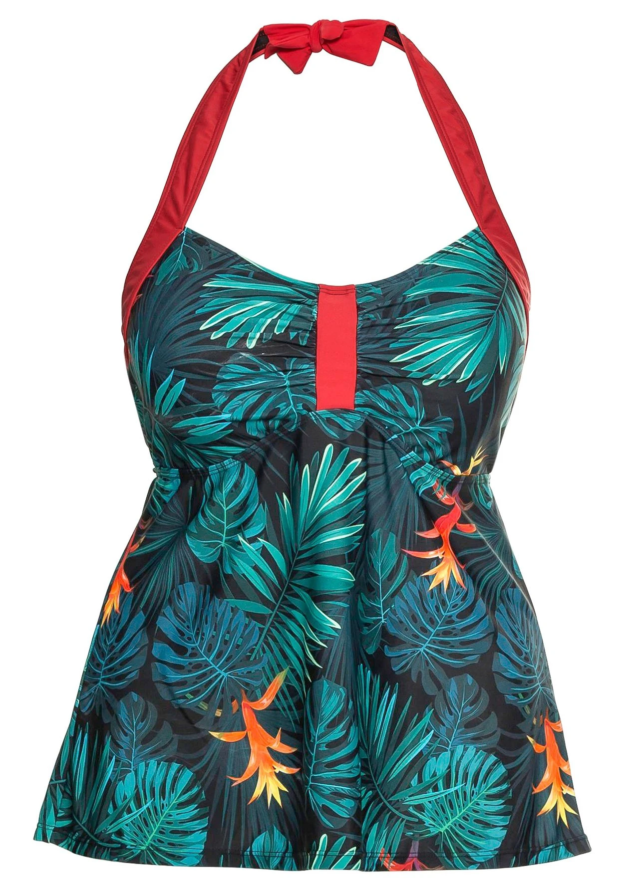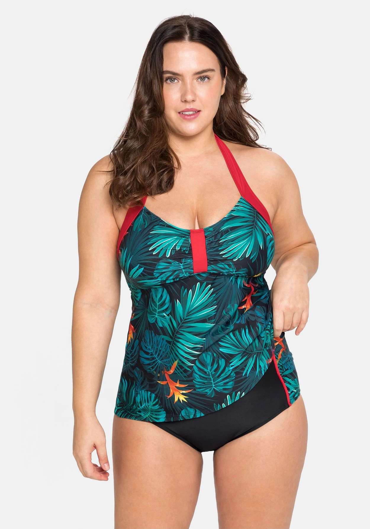 Tankini-Top von sheego by Joe Browns. Für sommerlichen Charme sorgt der tropische Print, unifarbene Partien setzen dazu moderne Akzente. Das Oberteil ist mit breiten Neckholder-Trägern gearbeitet, wattierte Softcups und ein Unterbrustgummi geben der Brust Form. Der längere, nach unten hin ausgestellte Fit und der tiefe Rückenausschnitt betonen die feminine Silhouette. Dank des Mix & Match-Charakters lassen sich dazu verschiedene Bikinihosen aus der sheego by Joe Browns Badekollektion kombinieren.
