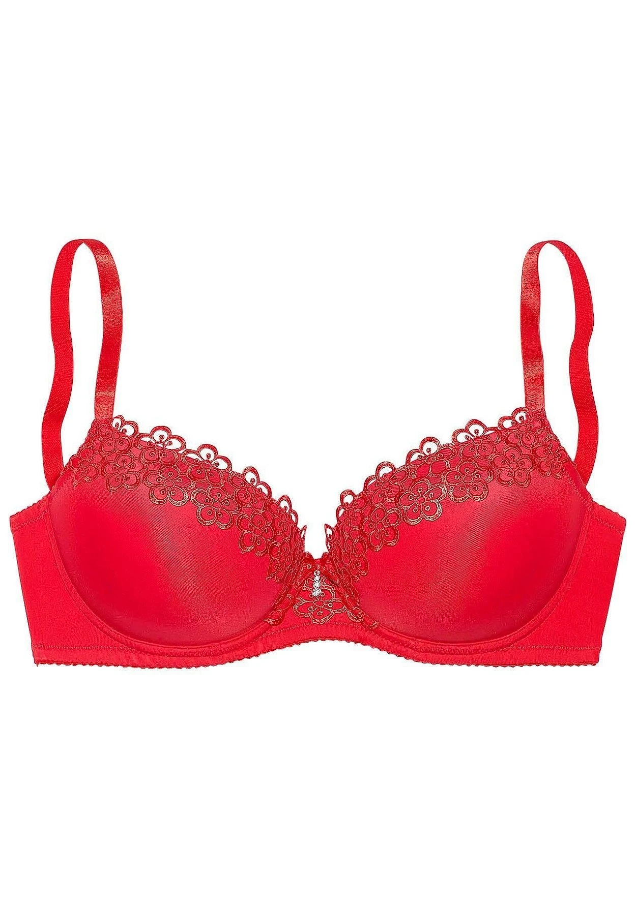Schalen-BH, nahtlos vorgformt. Hübsches Spitzenband an der Cupkante. Glitzeraccessoire in der vorderen Mitte. Träger und Rückenverschluss verstellbar. Sexy Dessous. Spitzen-Dessous. Romantische Dessous. Verspielte Dessous. Aus 70% Polyamid, 20% Polyester, 10% Elasthan.