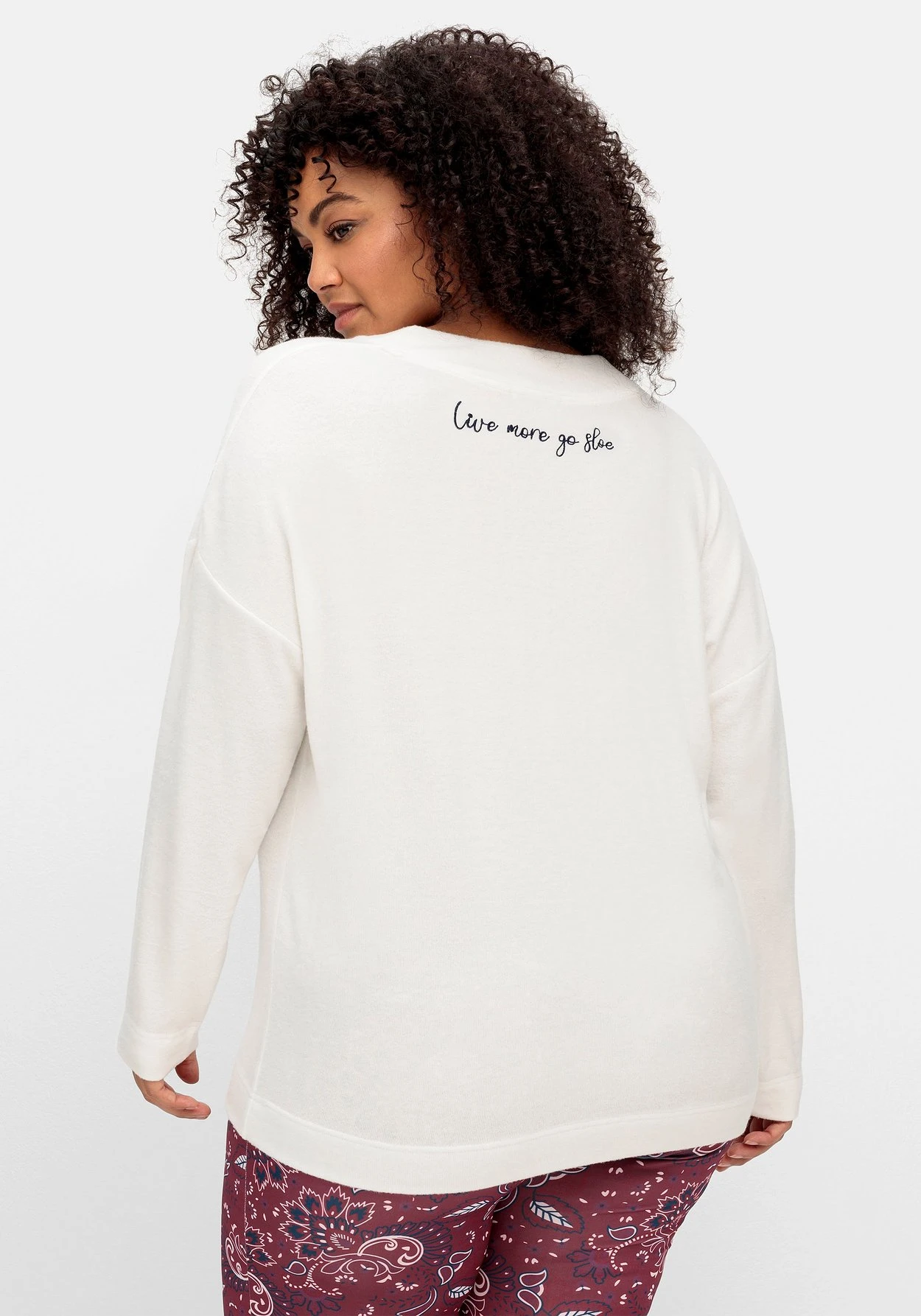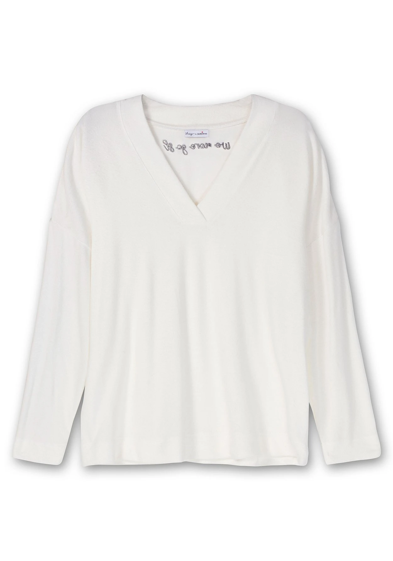 Sweatshirt aus softer, elastischer Feinstrick-Qualität, von sheego by Joe Browns. Der feminine V-Ausschnitt ist leicht überlappend gestaltet, überschnittene Schultern sorgen für eine lässige Optik. Eine dekorative Schriftzug-Stickerei im Rücken verleiht dem cleanen Look einen farblichen Akzent. Kombiniere das Oberteil mit einer Relaxhose aus unserer Homewear Kollektion – und schon ist dein Wohlfühl-Look komplett.