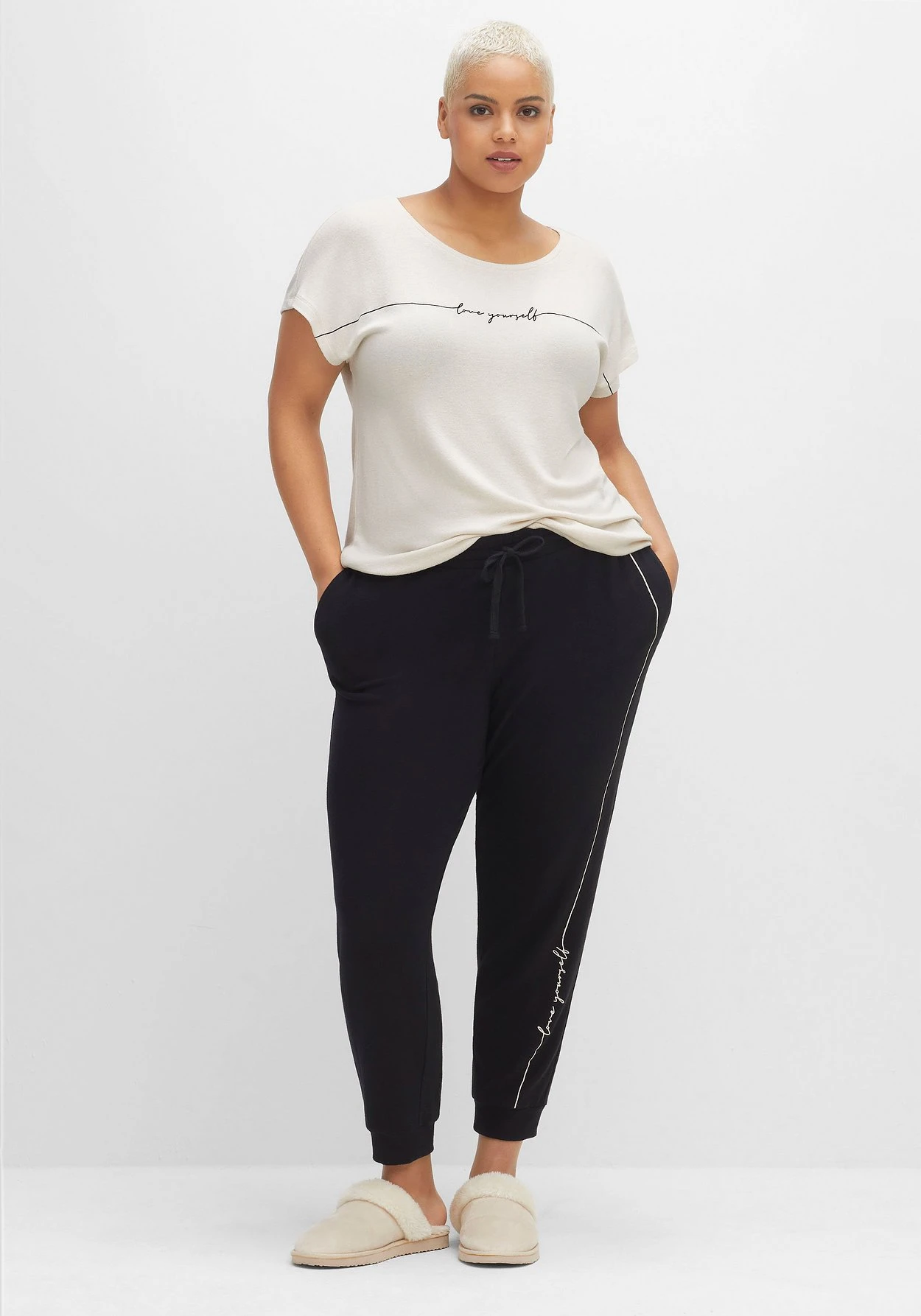 Oversized-Shirt in Feinstrick-Optik von sheego by Joe Browns. Dieses Loungewear-Shirt überbringt eine liebevolle Botschaft in Form eines dezenten Wordingprints im Vorderteil. Auch der Oversized-Schnitt im Zusammenspiel mit dem weiten Rundhals und den überschnittenen, etwas weiteren Ärmeln sorgt für Lässigkeit und Tragekomfort.