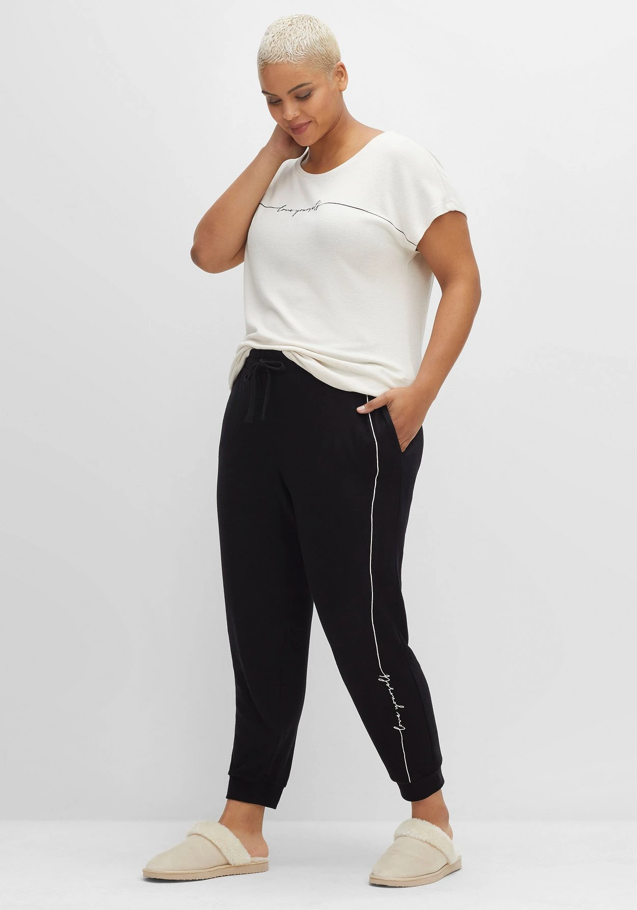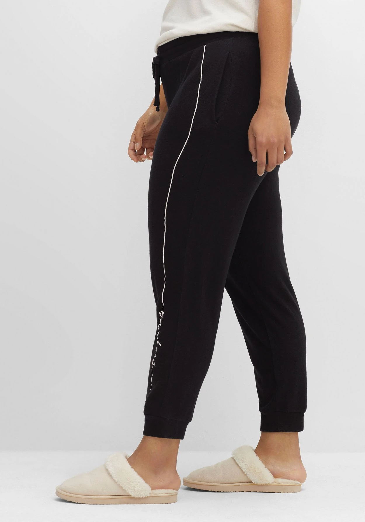 Relaxhose von sheego by Joe Browns. Durch den breiten Schlupfbund, die schrägen Eingrifftaschen und die elastischen Rippbündchen am Beinabschluss erhält die Hose ihren sportiven Lounge-Charakter. Zur Weitenregulierung dienen die Bindebändchen am Tunnelzug. Hingucker ist der dezente Wordingprint am linken Hosenbein, der in Linienform ausläuft und so für einen farblichen Akzent sorgt.