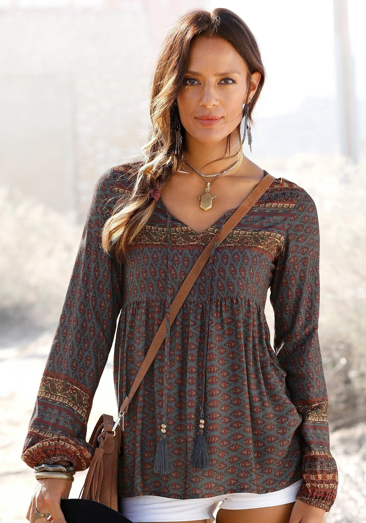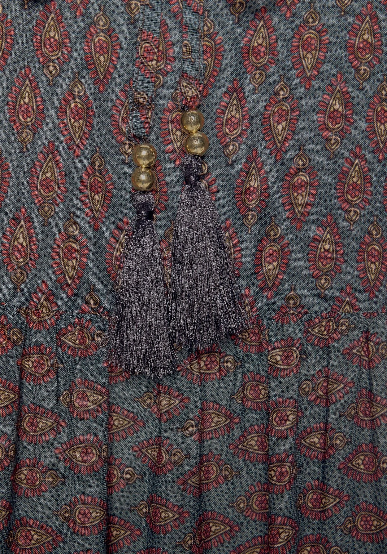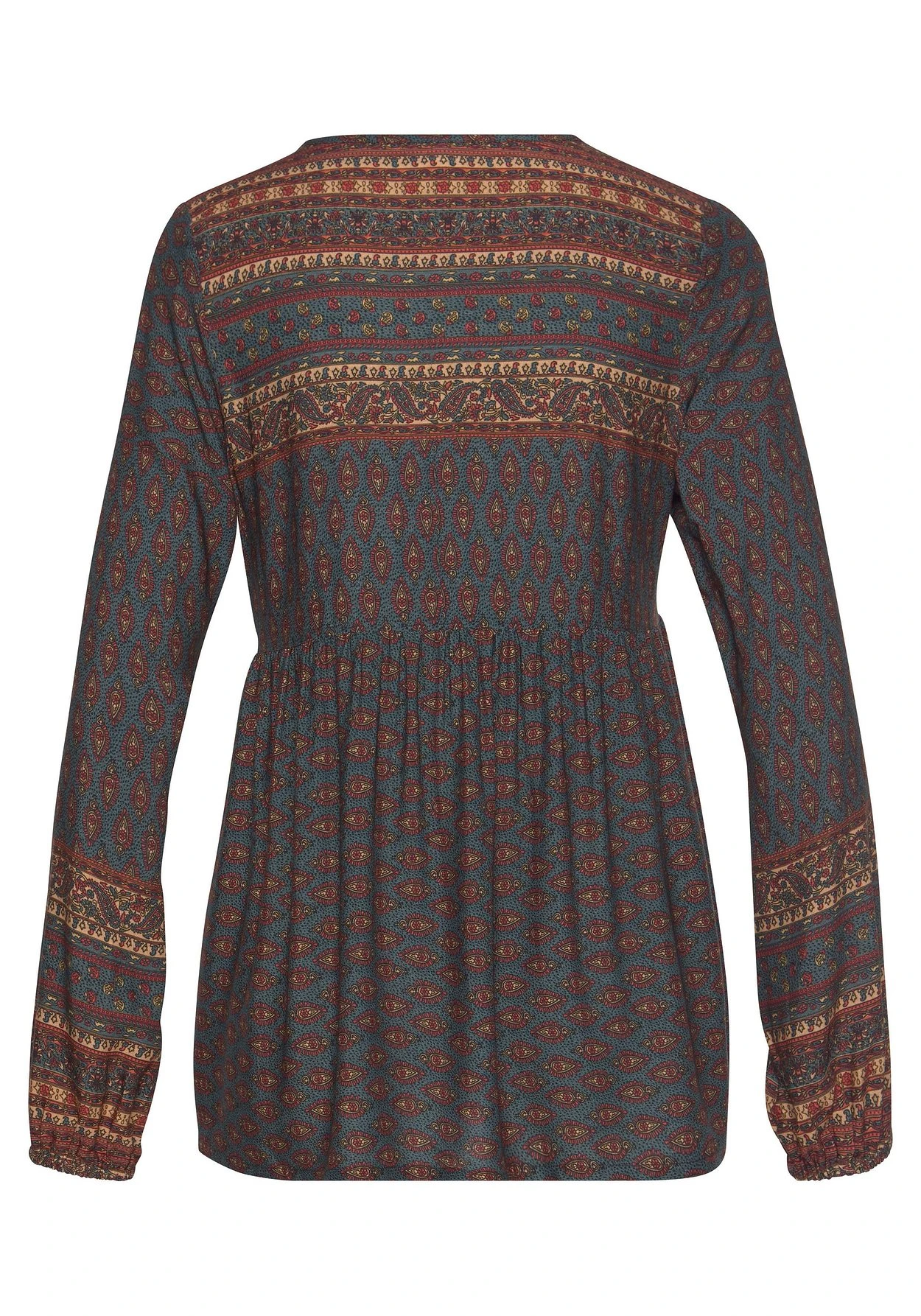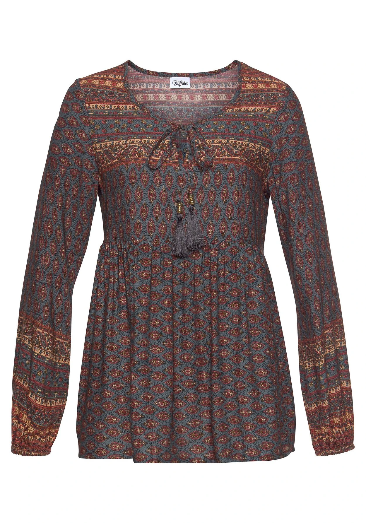 Allover bedruckt, jedes Teil ein Unikat. Bindebänder mit Zierperlen am Ausschnitt. Unterbrustnaht. Lange Ärmel mit Gummizug. Länge ca. 68 cm. Aus 100% gewebter Viskose.
