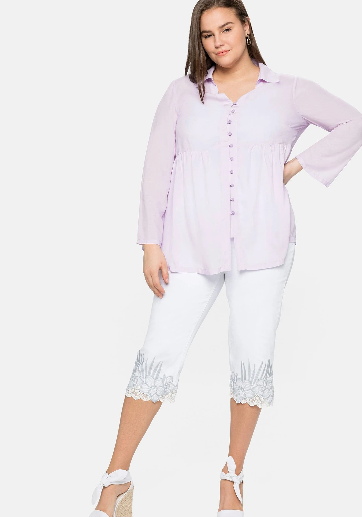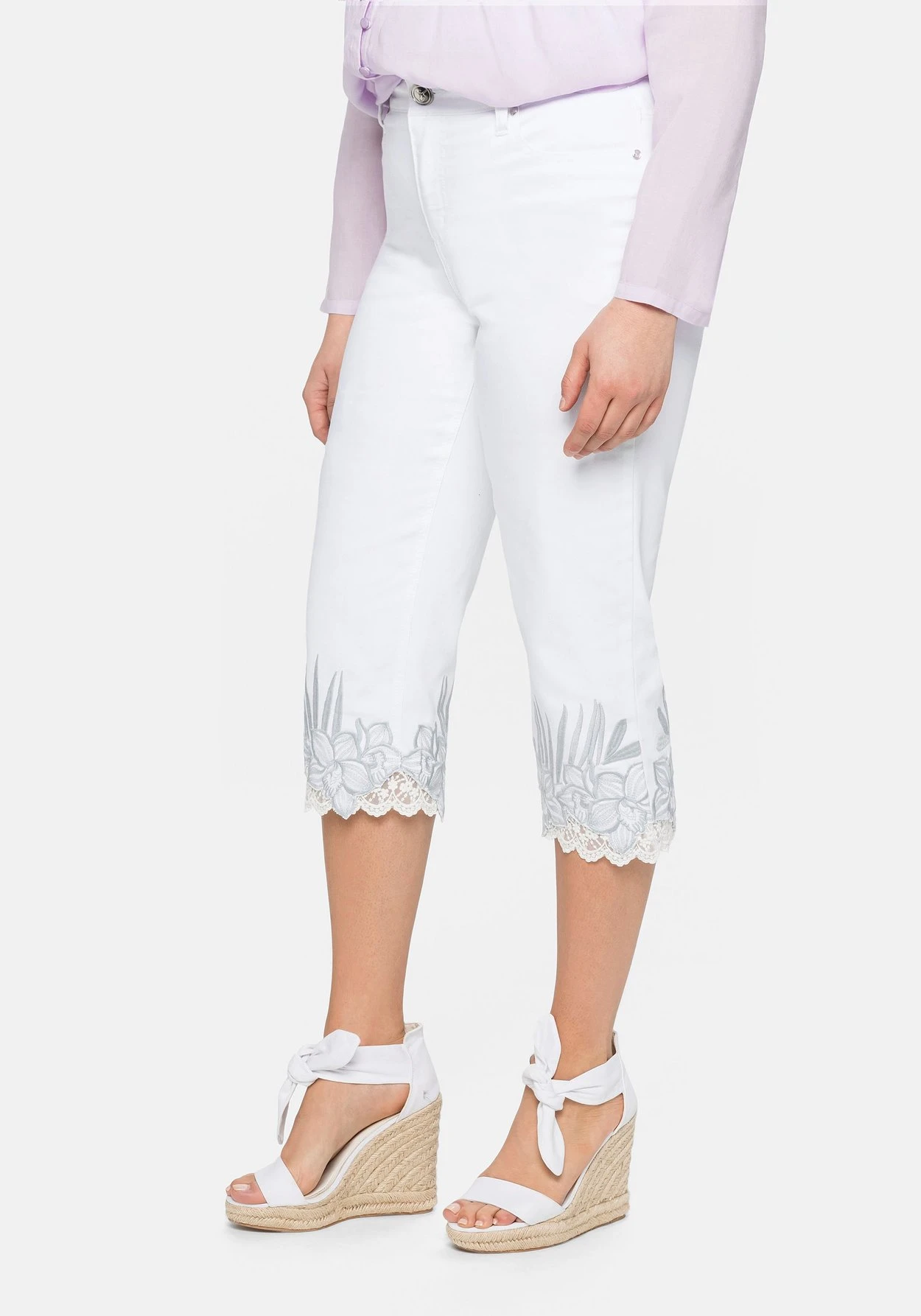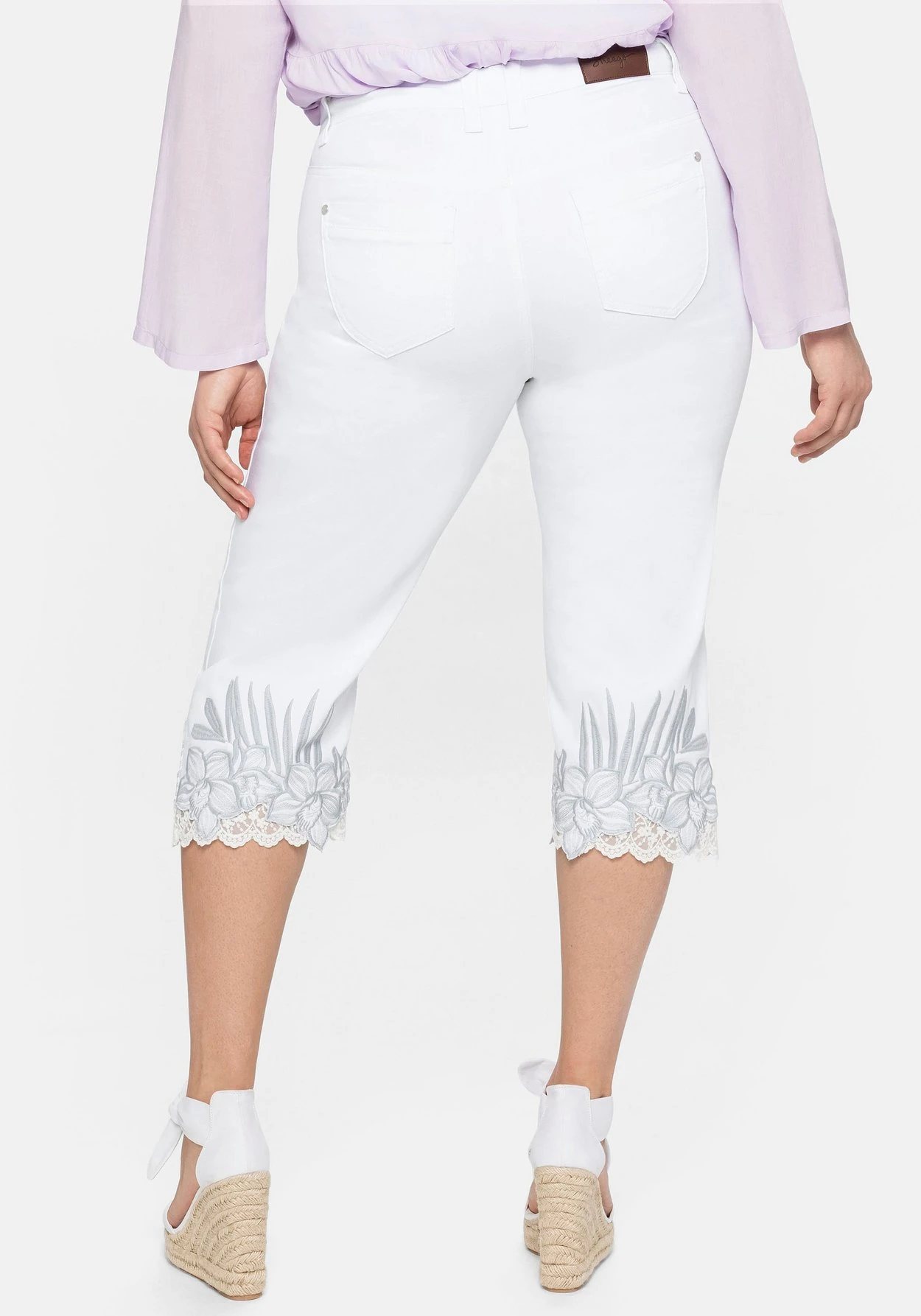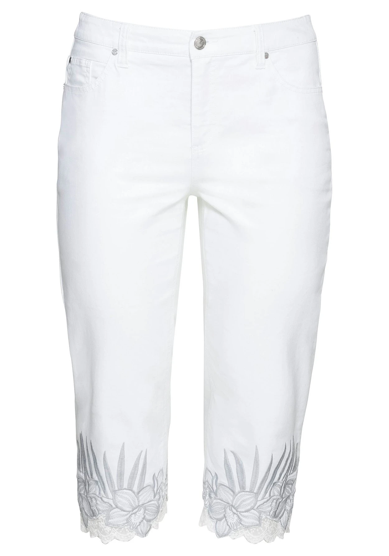 Jeans in sommerlicher 3/4-Länge. Eyecatcher ist die edle Blumenstickerei, die mit feiner Spitze unterlegt ist und so für einen femininen Beinabschluss sorgt. Die cleane Waschung, der Formbund mit Gürtelschlaufen und die klassischen fünf Taschen ergänzen den sommerlichen Auftritt.