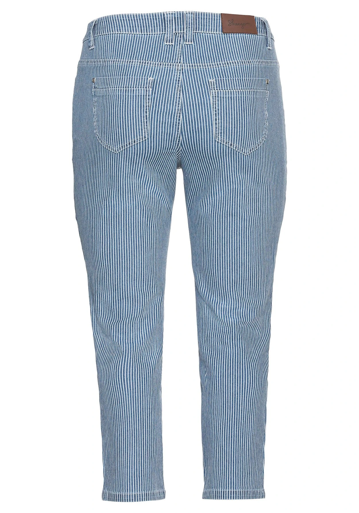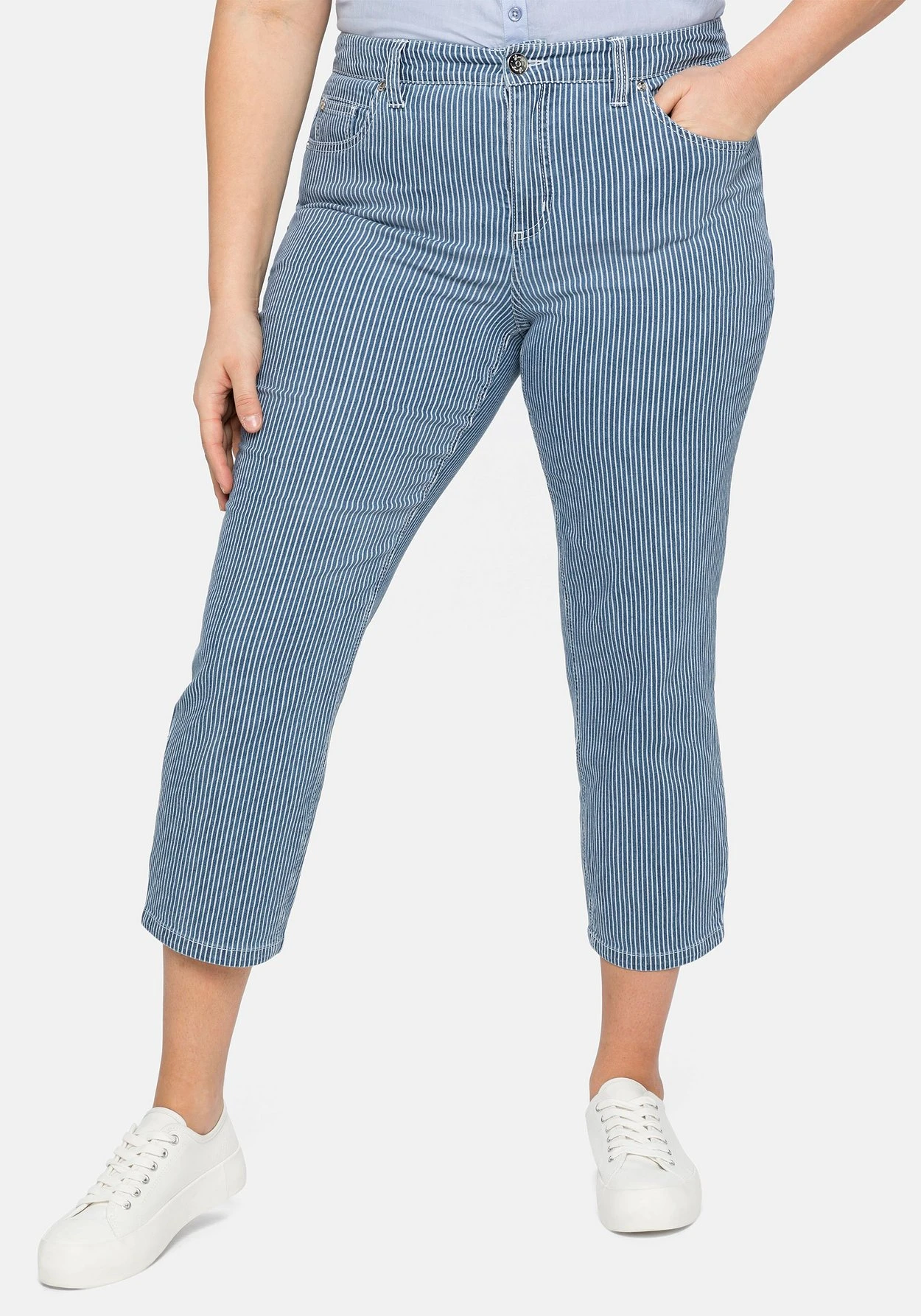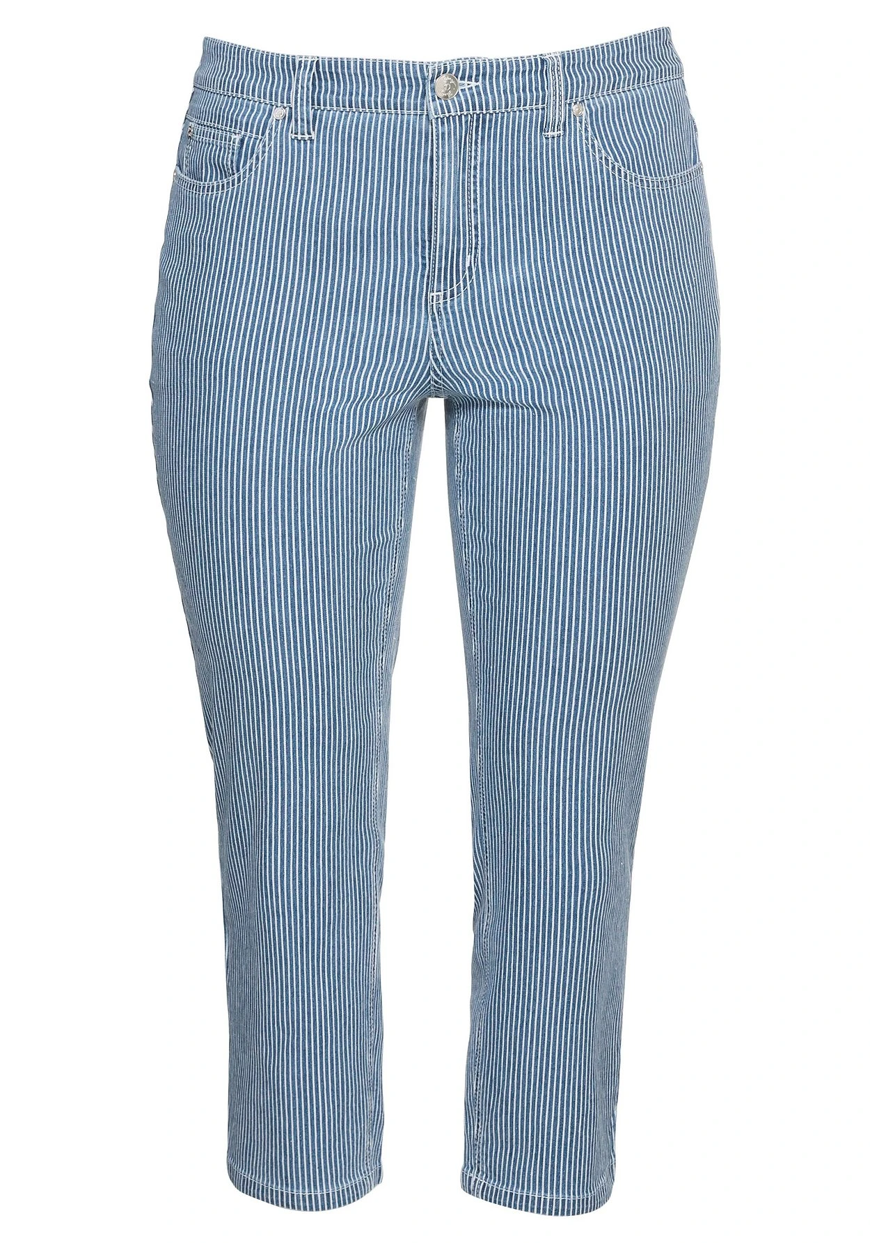 Jeans in 7/8-Länge. Die feinen Allover-Streifen zaubern einen frischen Look und setzen damit ein maritimes Modestatement. Die Hose ist im 5-Pocket-Style mit Formbund und Gürtelschlaufen gestaltet. Geschlossen wird sie mit Knopf und Reißverschluss.