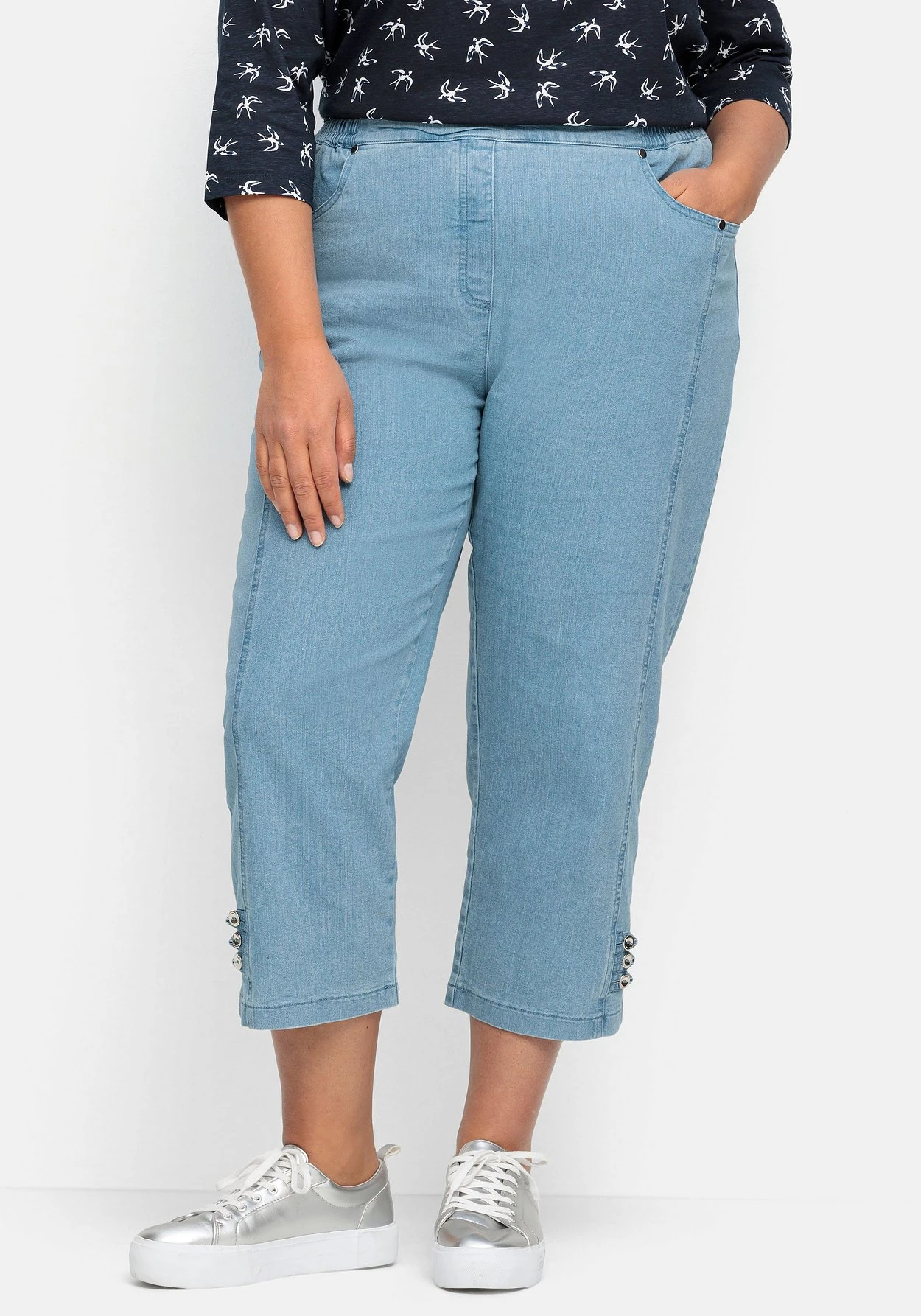 Jeans in sommerlicher 7/8-Länge. Durch den elastischen Bund trägt sich die Hose besonders bequem, die imitierte Reißverschluss-Blende gibt ihr eine gepflegte Optik. Die abgerundeten Eingrifftaschen zieren dekorative Nieten, seitlich am Beinabschluss sorgen Dekoschlaufen mit Zierknöpfen für einen modischen Eyecatcher.