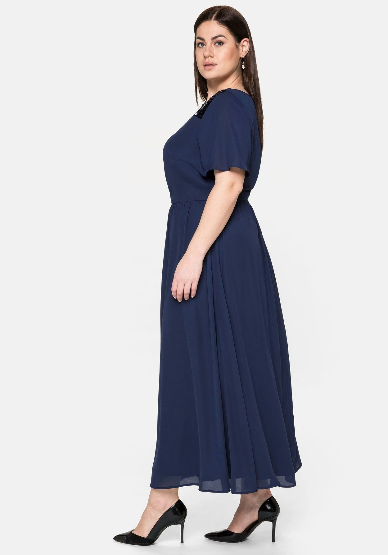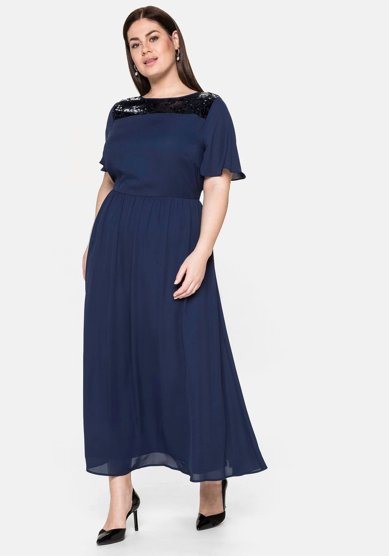 Abendkleid aus Chiffon. Eleganter Eyecatcher ist die Passe aus blickdichtem Mesh, auf der farbige Pailletten schimmern. Der semitransparente, etwas länger geschnittene Ärmel fällt schön locker. Auf Taillenhöhe betont ein gekräuselter elastischer Bund die Körpermitte und lässt den Rock darunter schön schwingen. Mit nahtfeinem Reißverschluss im Rücken.