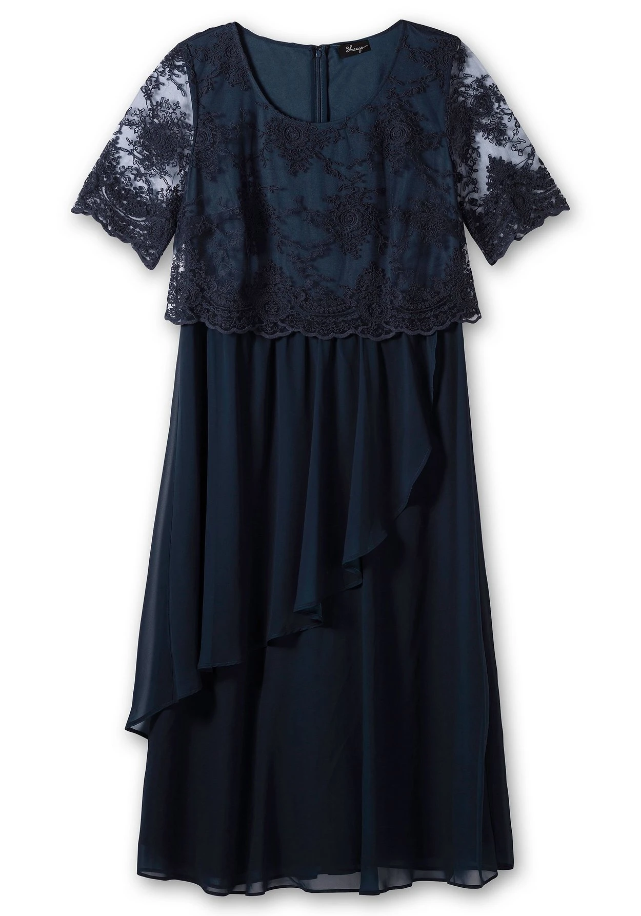 Abendkleid aus Georgette. Für raffinierte Eleganz und gleichzeitig eine schmeichelnde Silhouette sorgt das locker über das Kleid fallende Oberteil aus besticktem Mesh. Dabei lässt die zarte, transparente Qualität am Ärmel dezent die Haut durchschimmern. Darunter fällt der lange Rock, der durch die Wickeloptik die Beine locker umspielt. Die leicht transparente Georgette-Qualität wird durch das Unterkleid blickdicht. Ein nahtfeiner Reißverschluss im Rücken ergänzt den festlichen Look.