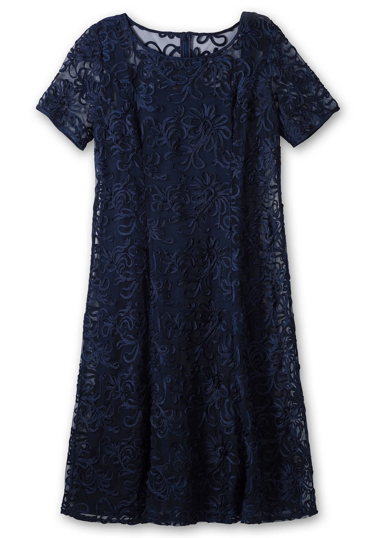 Abendkleid in A-Linie. Das zarte, leicht transparente Material erhält durch die aufwendigen Zierborten besondere Eleganz. Dabei lassen die kurzen Ärmel dezent die Haut durchschimmern, der Body wird durch das Unterkleid blickdicht. Ein nahtfeiner Reißverschluss im Rücken ergänzt den festlichen Look.
