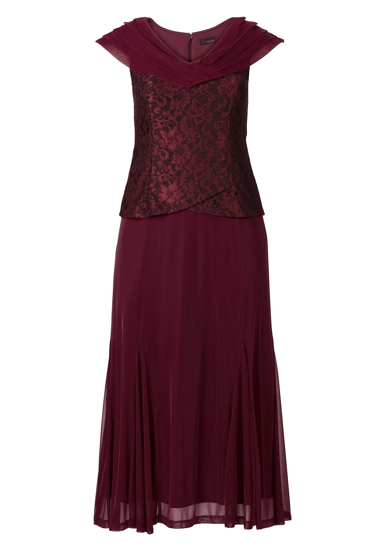 Dieses Abendkleid fällt durch seine schlichte Eleganz auf. Der Schalkragen ist weich drapiert und fällt locker über die Schultern. Für das gewisse Etwas sorgt die effektvolle Spitze im Oberteil. Durch den geraden Abschluss wird die Taille zusätzlich betont. Der Rock ist leicht transparent und in Godetfalten gelegt. Farblich ist er passend zu dem Schalkragen gestaltet, so dass ein ruhiges, stimmiges Gesamtbild entsteht. Geschlossen wird das Kleid mit einem Rückenreißverschluss. Dieser ist verdeckt gearbeitet und farblich passend ausgewählt, wodurch er kaum auffällt und sich perfekt in den Look einfügt.