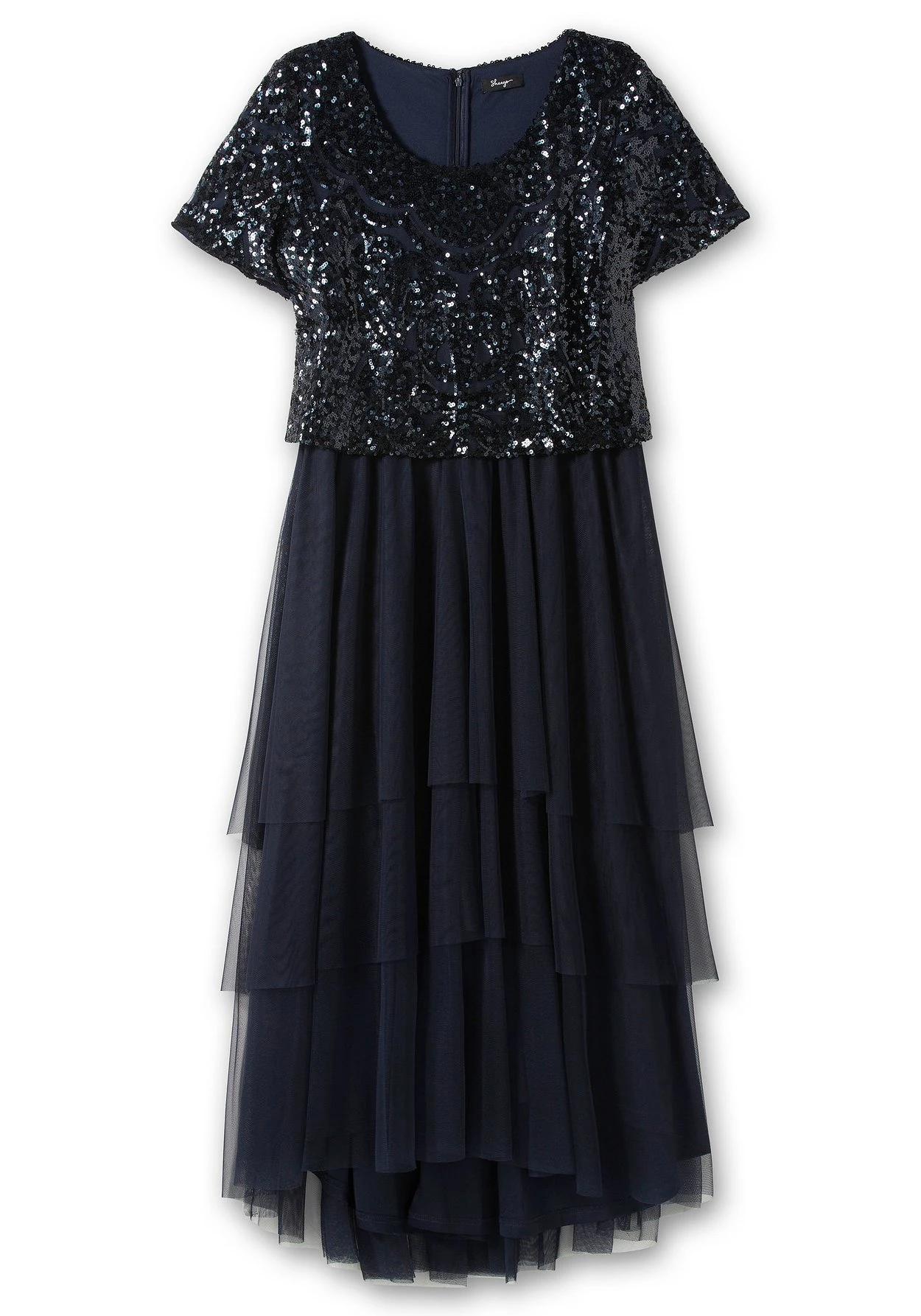 Abendkleid in Maxilänge. Besondere Raffinesse erhält das Kleid durch das lose fallende, festlich glitzernde Paillettenoberteil. Daran schließt sich ein transparenter Rock an, der durch die Lagen wunderbar luftig fällt. Hinten besitzt das Kleid einen nahtfeinen Reißverschluss, das Unterkleid macht den Look blickdicht.