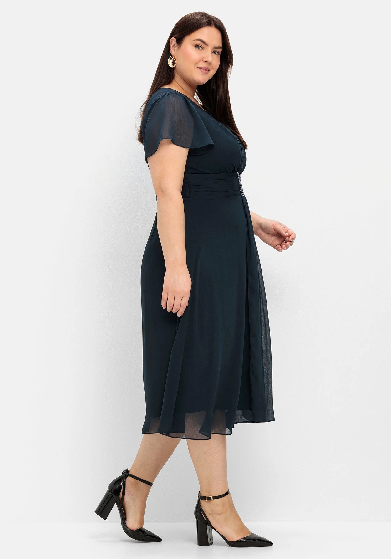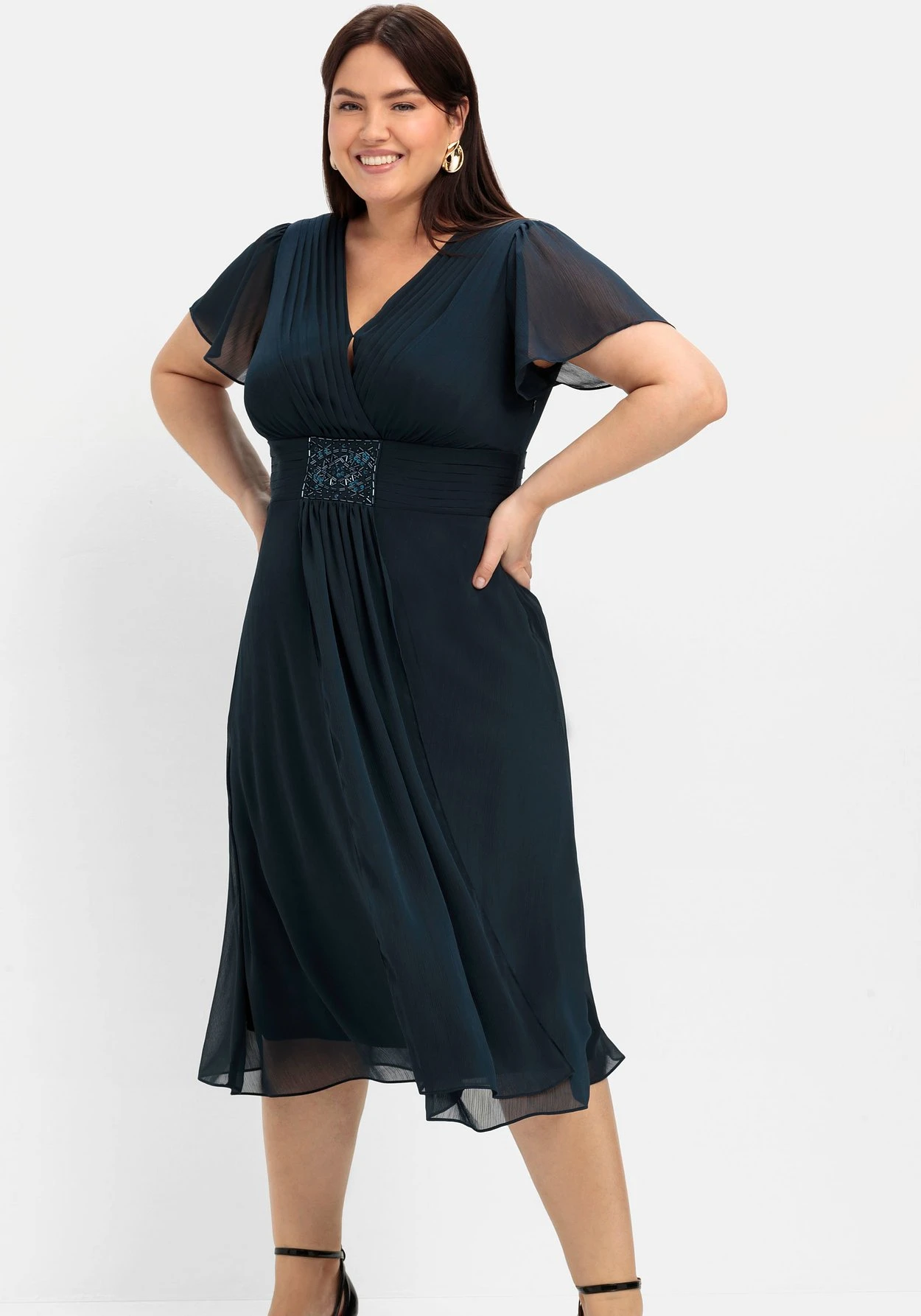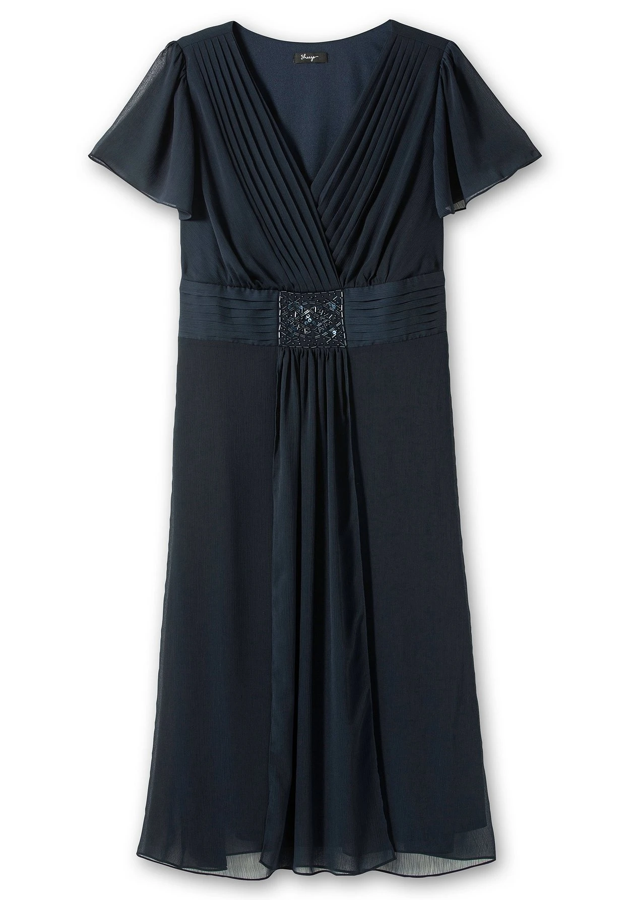 Dieses Abendkleid begeistert mit seinem tollen Schnitt, der die Figur angenehm umschmeichelt und so eine schöne Kontur schafft. Unterstrichen wird der attraktive Look durch die figurfreundliche Wickeloptik sowie die hochwertig drapierte Taille. Das leicht transparente, fließende Crêpe-Georgette rundet das ansprechende Erscheinungsbild dabei gekonnt ab. Der Body ist blickdicht gefüttert, sodass das dezent durchsichtige Obermaterial besonders im Gang toll in Szene gesetzt wird, ohne etwas durchscheinen zu lassen. Harmonisch darauf abgestimmt umspielen die Flügelärmel die Schultern und Oberarme. Ein schönes Detail ist die funkelnde Schmuckbrosche im schicken Mix aus Pailletten, Perlen und Stäbchen, die dem Kleid eine elegante Note verleiht. Unterhalb sorgt der lose fallende Schal im Rockteil für das gewisse Etwas. Ein verdeckter Reißverschluss in der Seitennaht erleichtert das An- und Ausziehen.