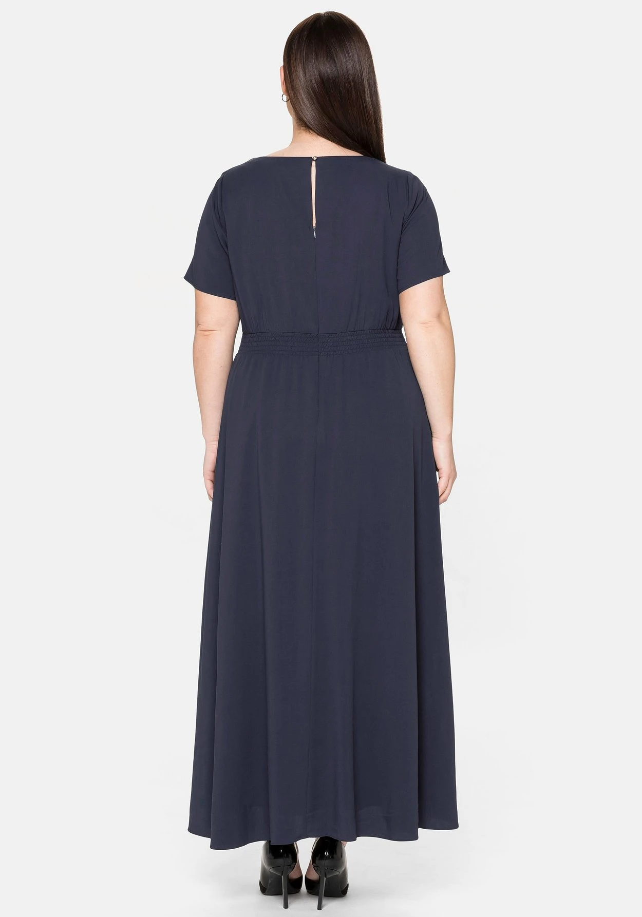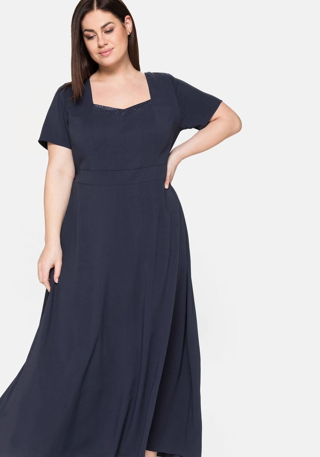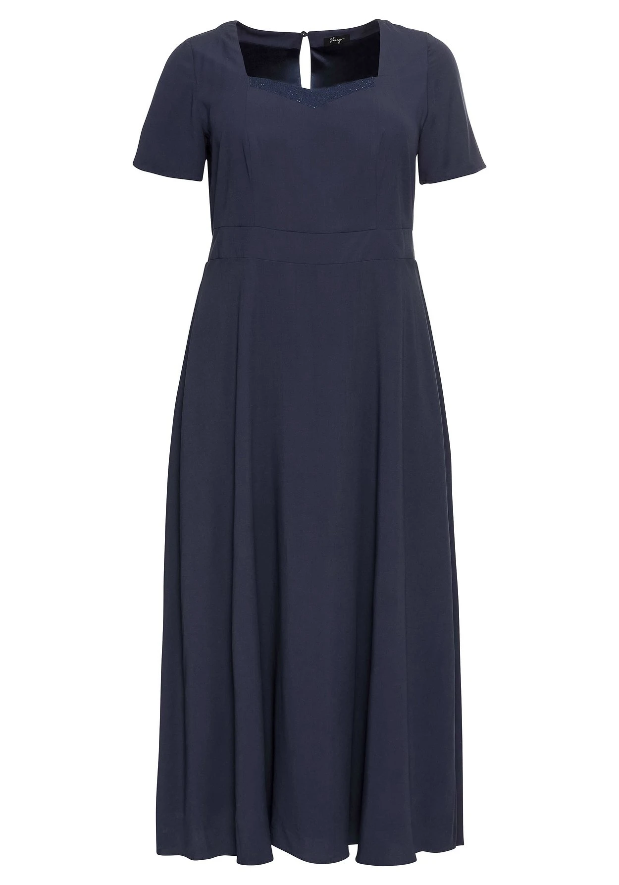 Abendkleid mit Karree-Ausschnitt. Elegant schimmernde Schmucksteine betonen den tiefen, angedeuteten V-Ausschnitt und geben diesem Style ein festliches Finish. Ein Band auf Hüfthöhe setzt die Taille in den Fokus, im Rücken sorgt ein Smokeinsatz für den perfekten Sitz. Daran schließt sich der weit schwingende Rock an. Ein Schlüssellochausschnitt mit Schmuckknopf im Nacken sowie ein nahtfeiner Reißverschluss hinten ergänzen den Look.