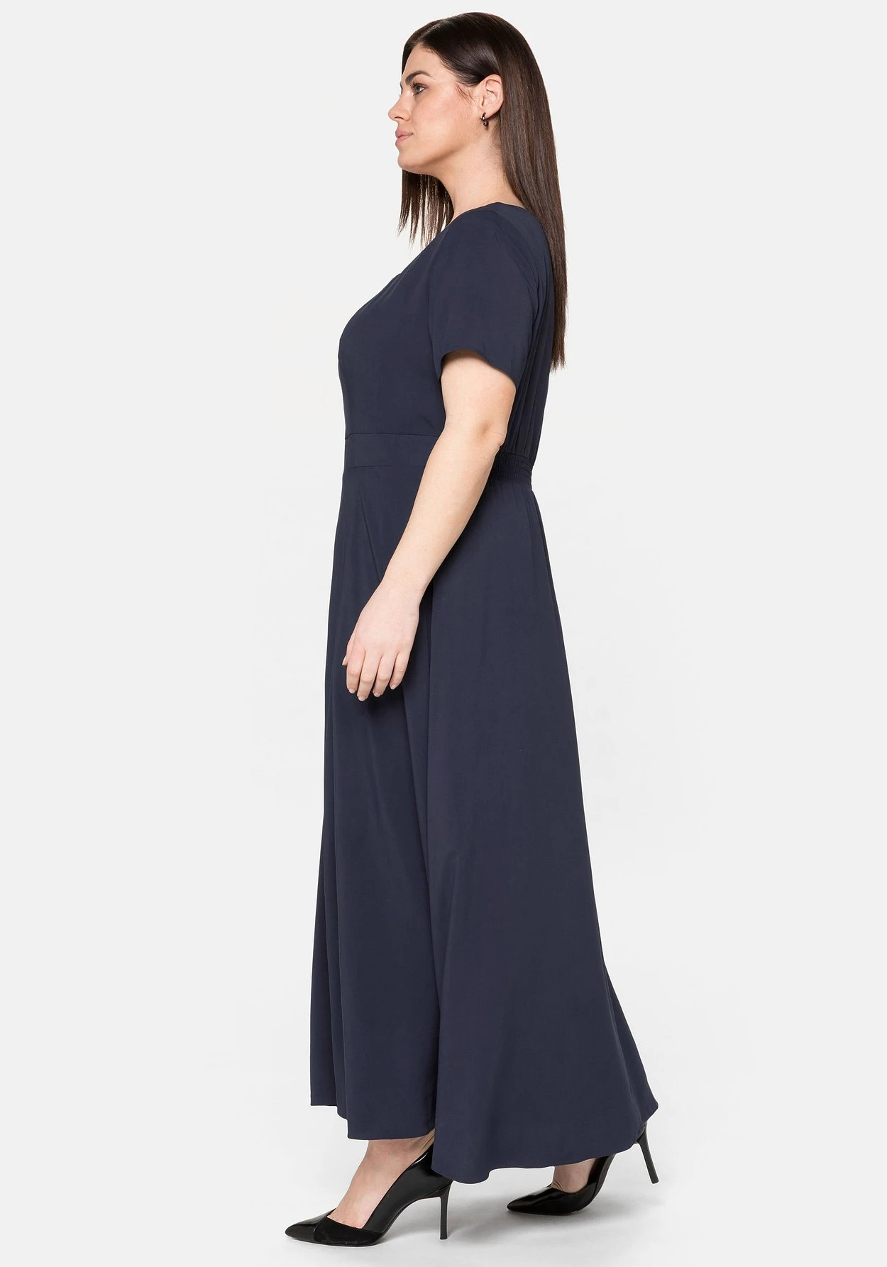 Das Kleid fällt figurumspielend, das Taillenband formt eine feminine Silhouette. Die Ärmel sind etwas länger geschnitten und schmeicheln so den Oberarmen.