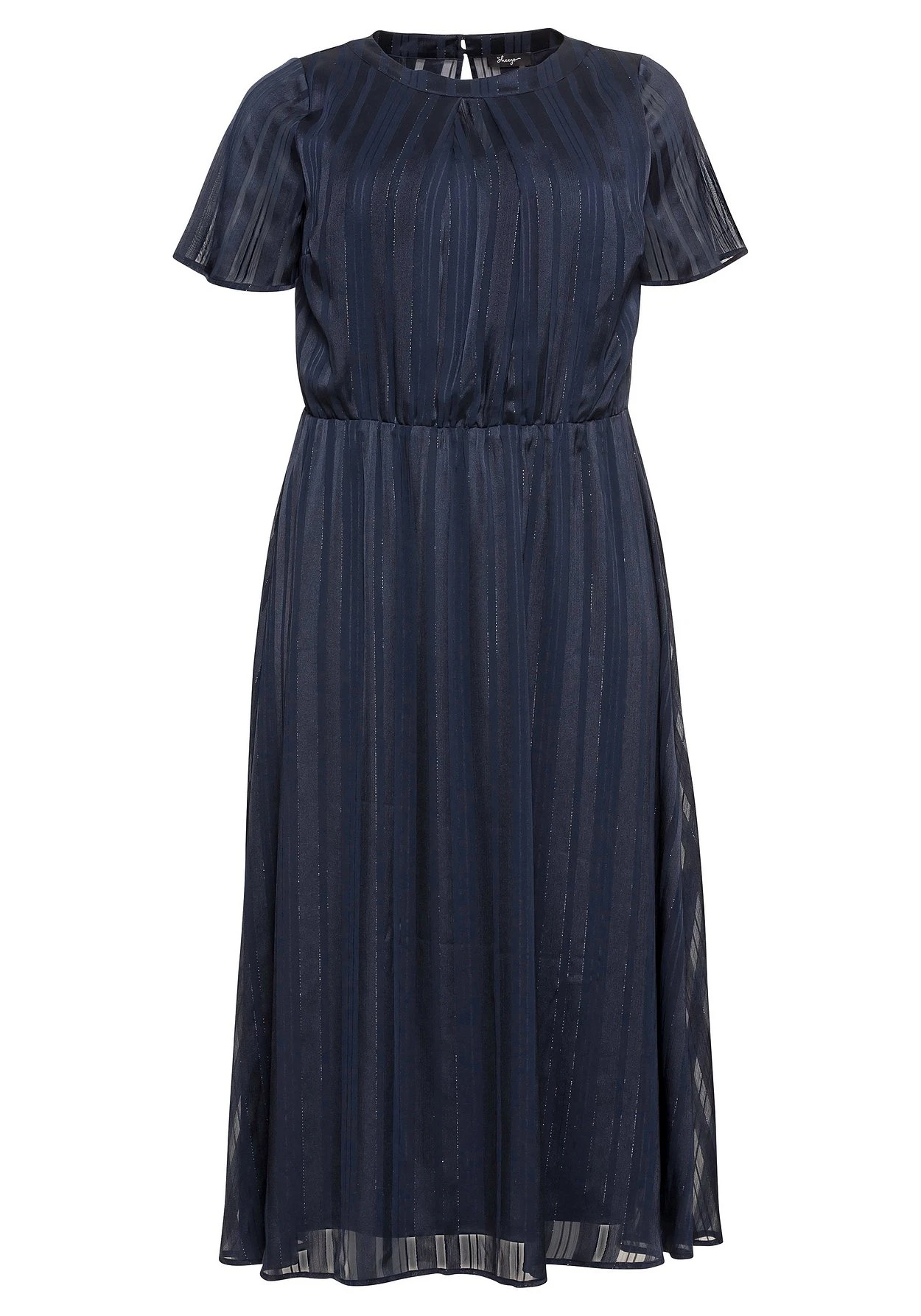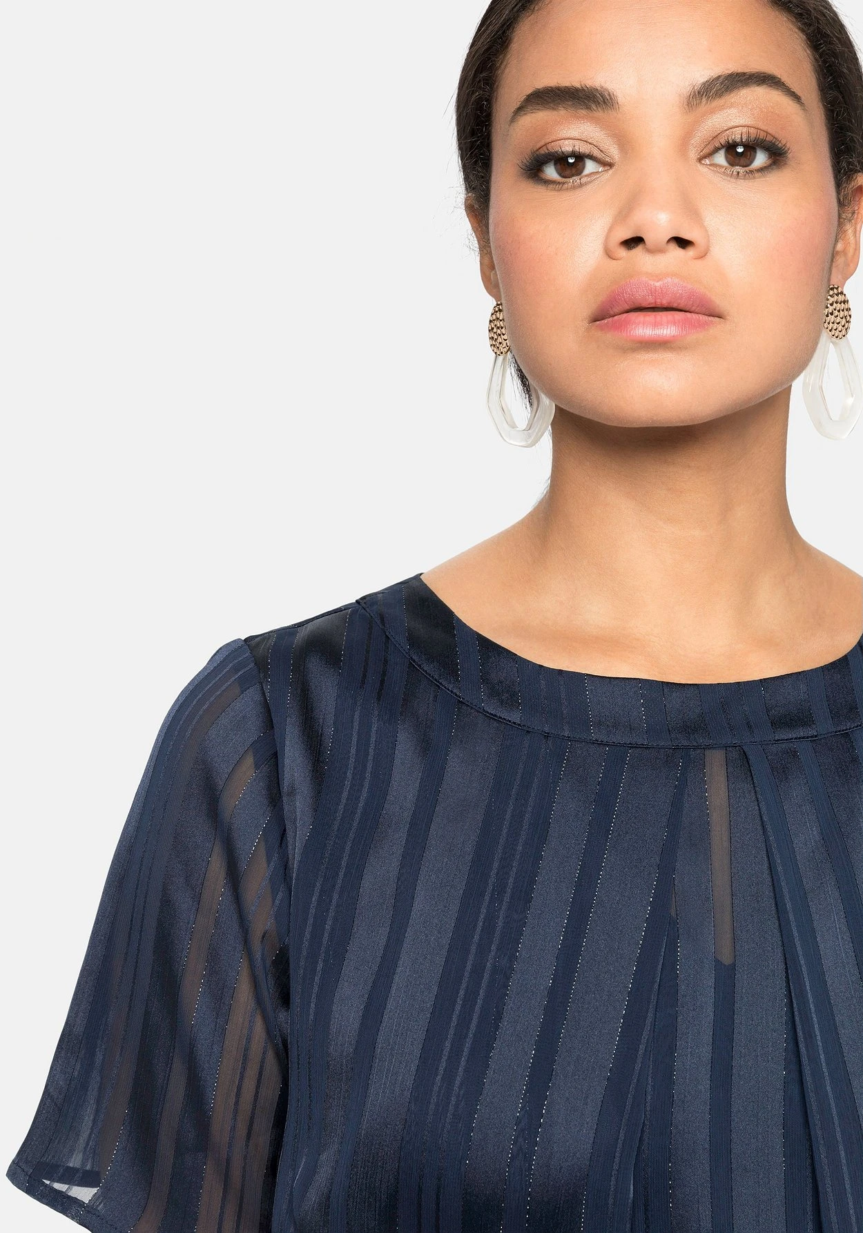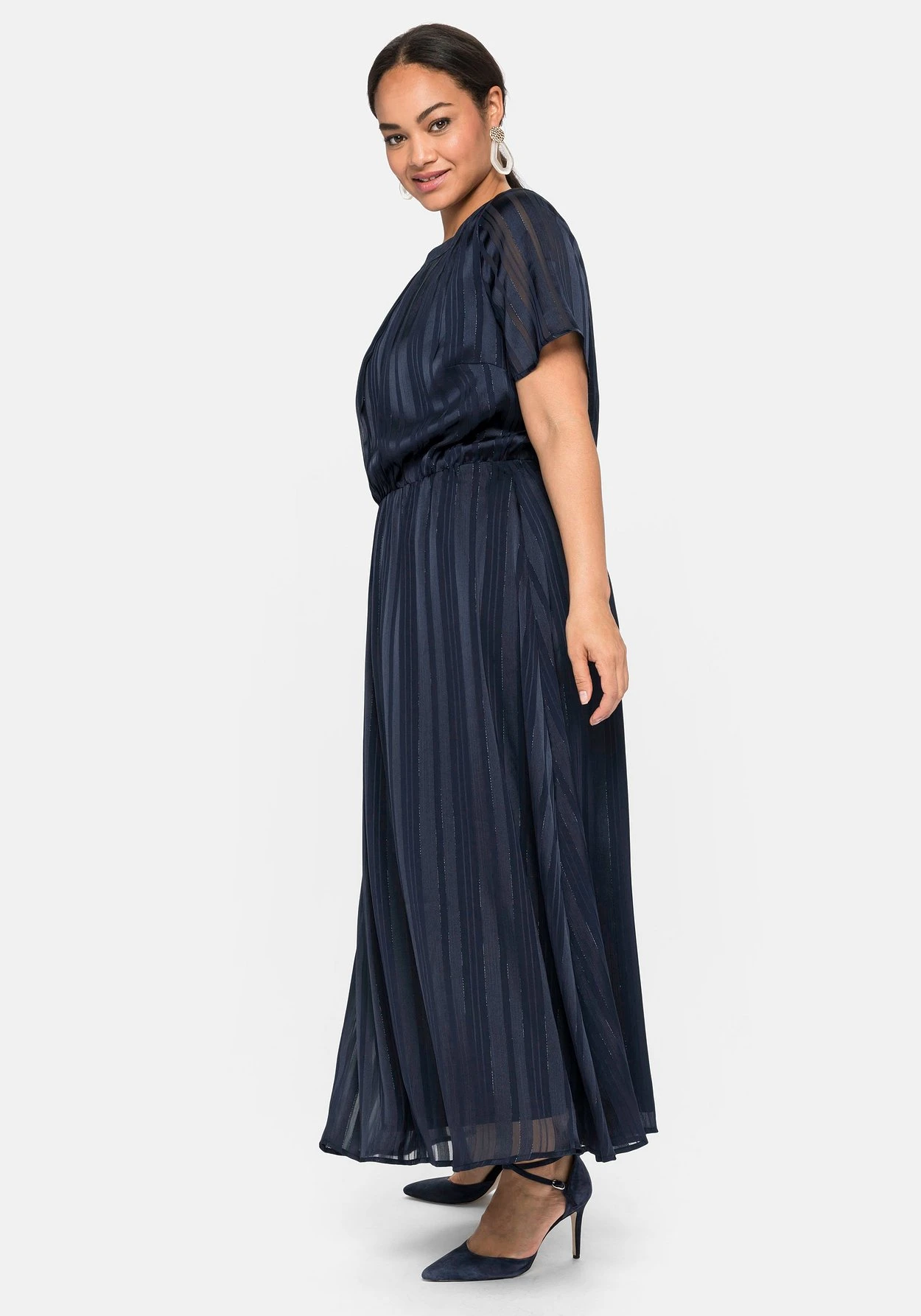 Abendkleid in Maxilänge. Für den effektvollen Auftritt sorgt das dezent gestreifte Jacquardmuster, das durch den eingearbeiteten metallisierten Faden einen eleganten Schimmer erhält. Der Rundhalsausschnitt ist in Falten gelegt, im Rücken überrascht ein tiefer Schlitz. Durch den Gummibund in der Taille kann das Oberteil leger geschoppt werden.