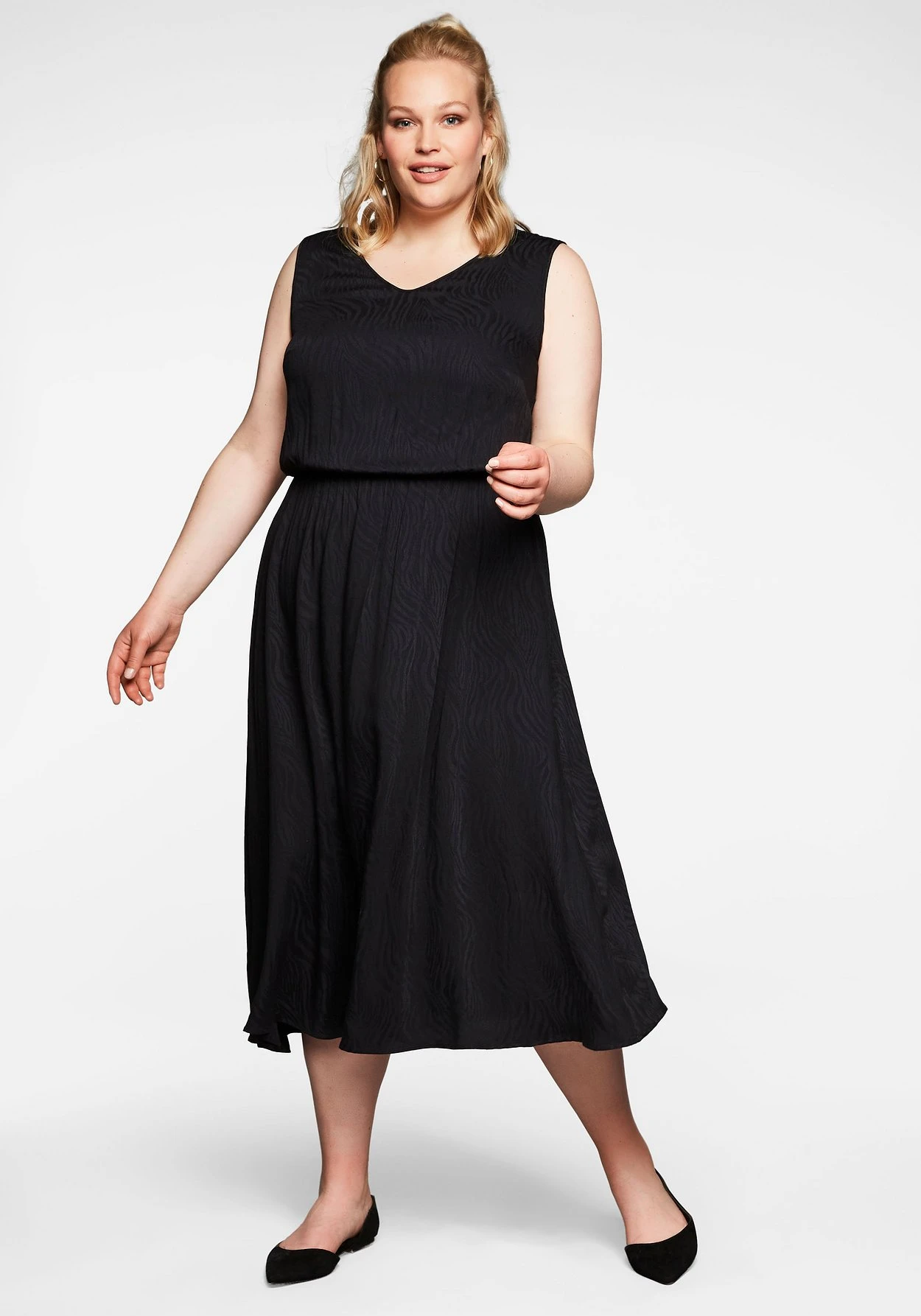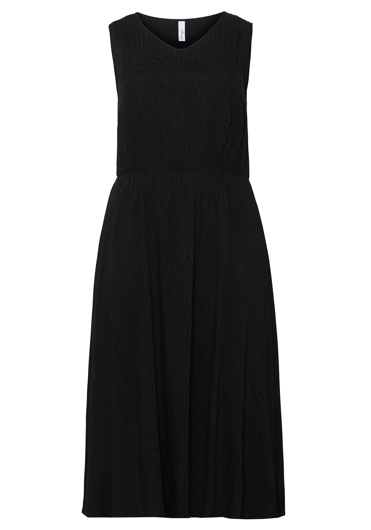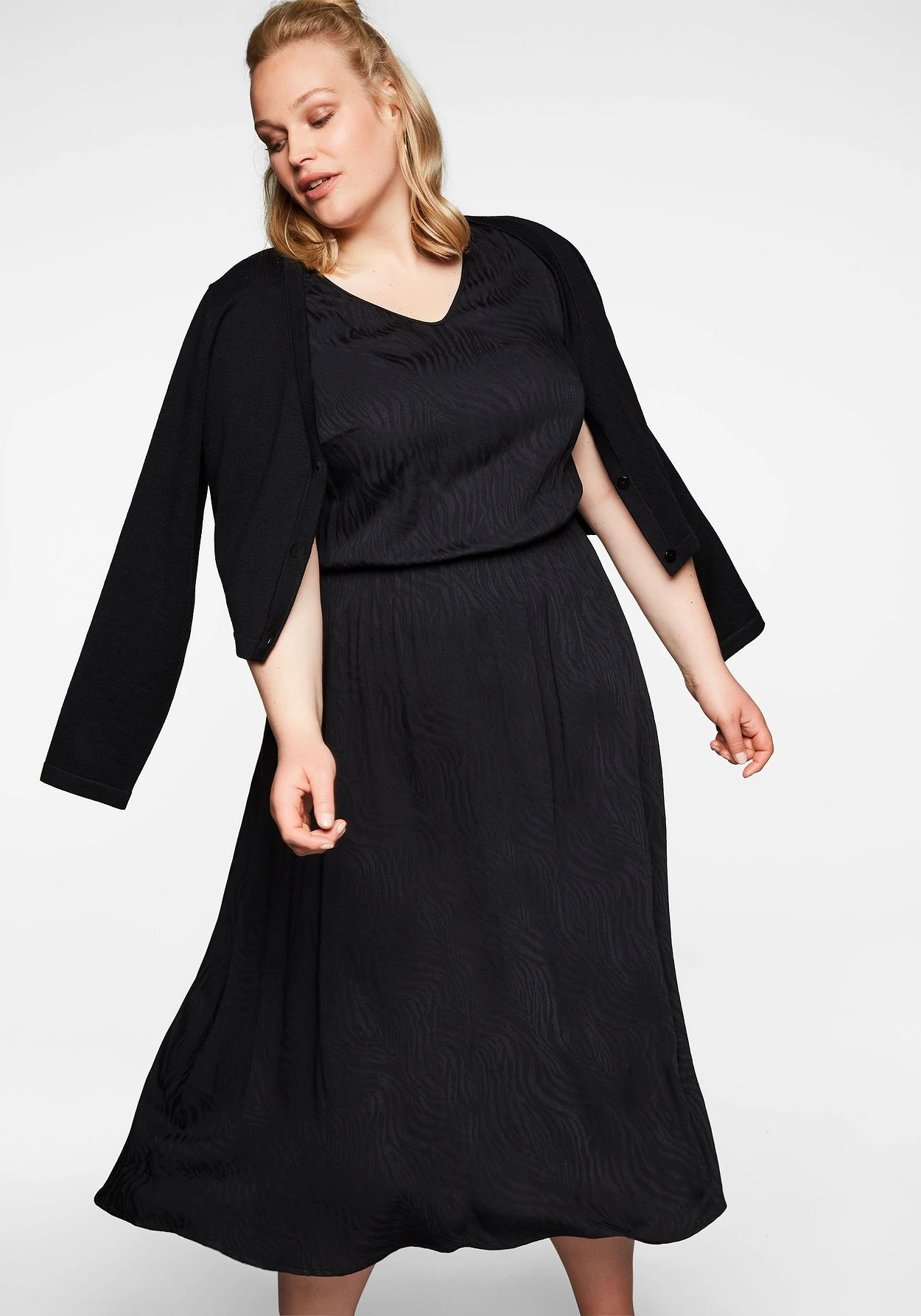 Kleid und Cardigan im Set. Das schlichte, ärmellose Kleid zeigt sich mit femininem V-Ausschnitt und einem Gummizugbund in der Taille. Ein leicht glänzendes Jacquardmuster verleiht ihm eine festliche Note. Perfekt darauf abgestimmt ist der kurze Cardigan mit Knopfleiste.