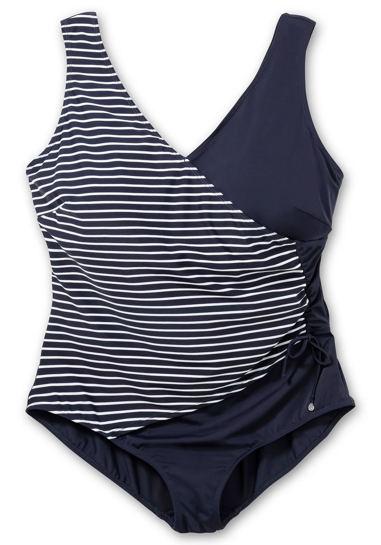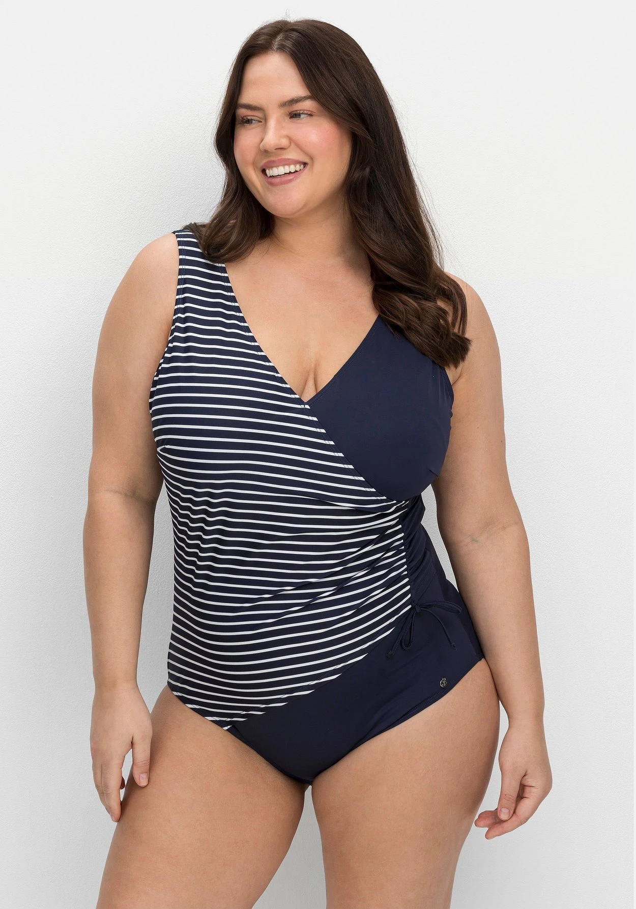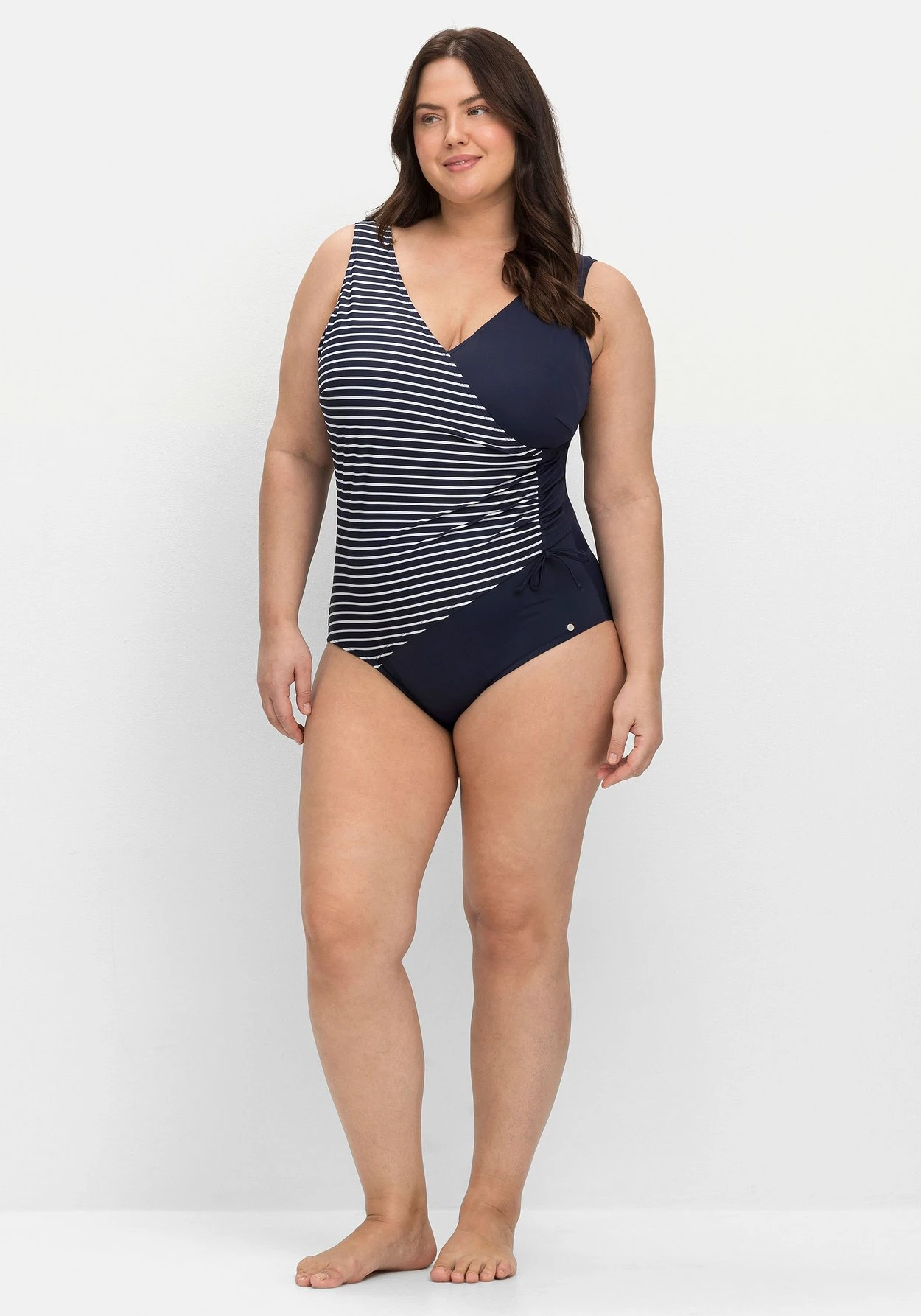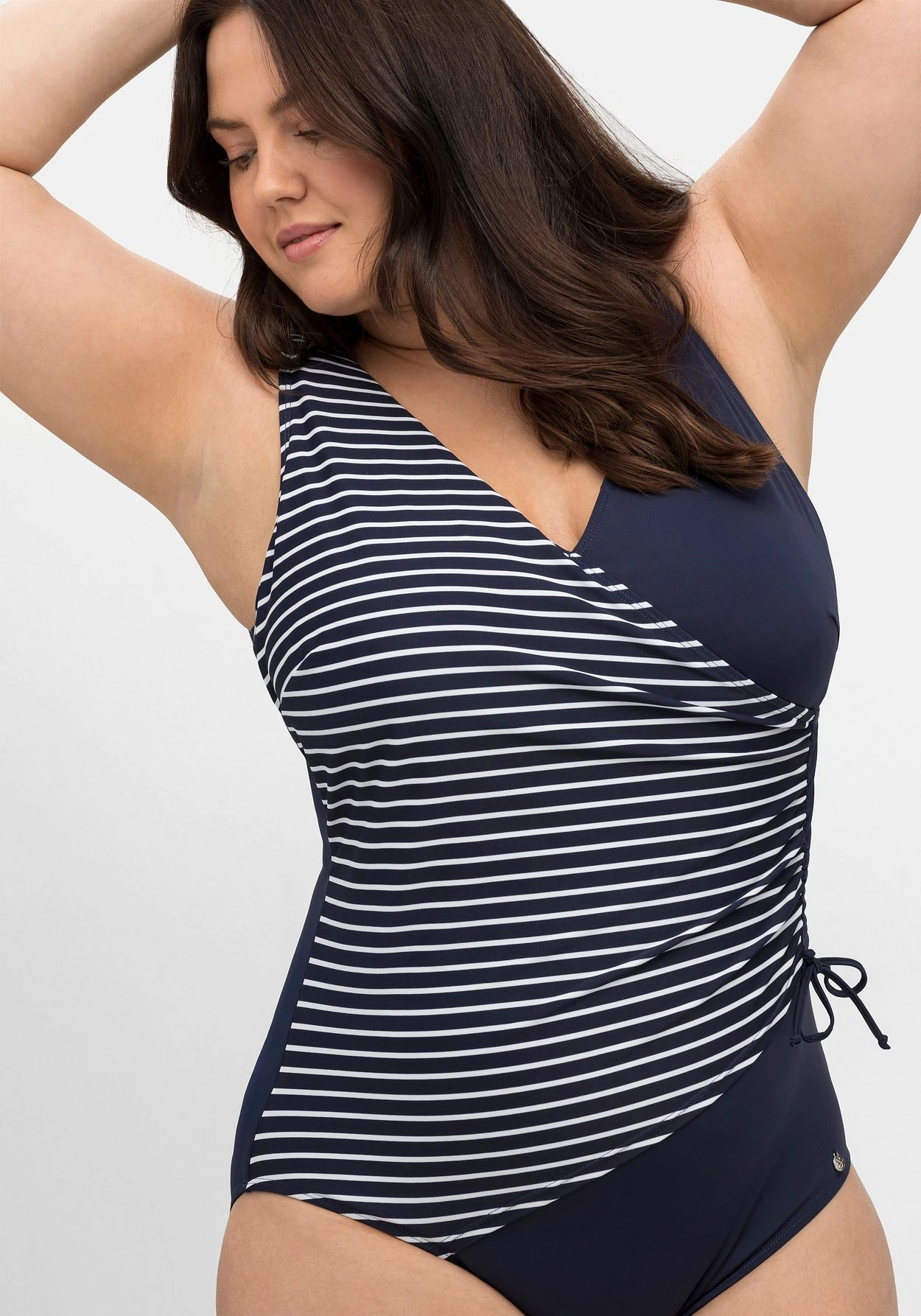 Badeanzug in Wickeloptik. Die Streifen unterstreichen den raffinierten Auftritt, eine kleine applizierte Schleife setzt einen femininen Akzent. Wattierte Softcups geben der Brust Form, breite verstellbare Träger machen den Tragekomfort perfekt.