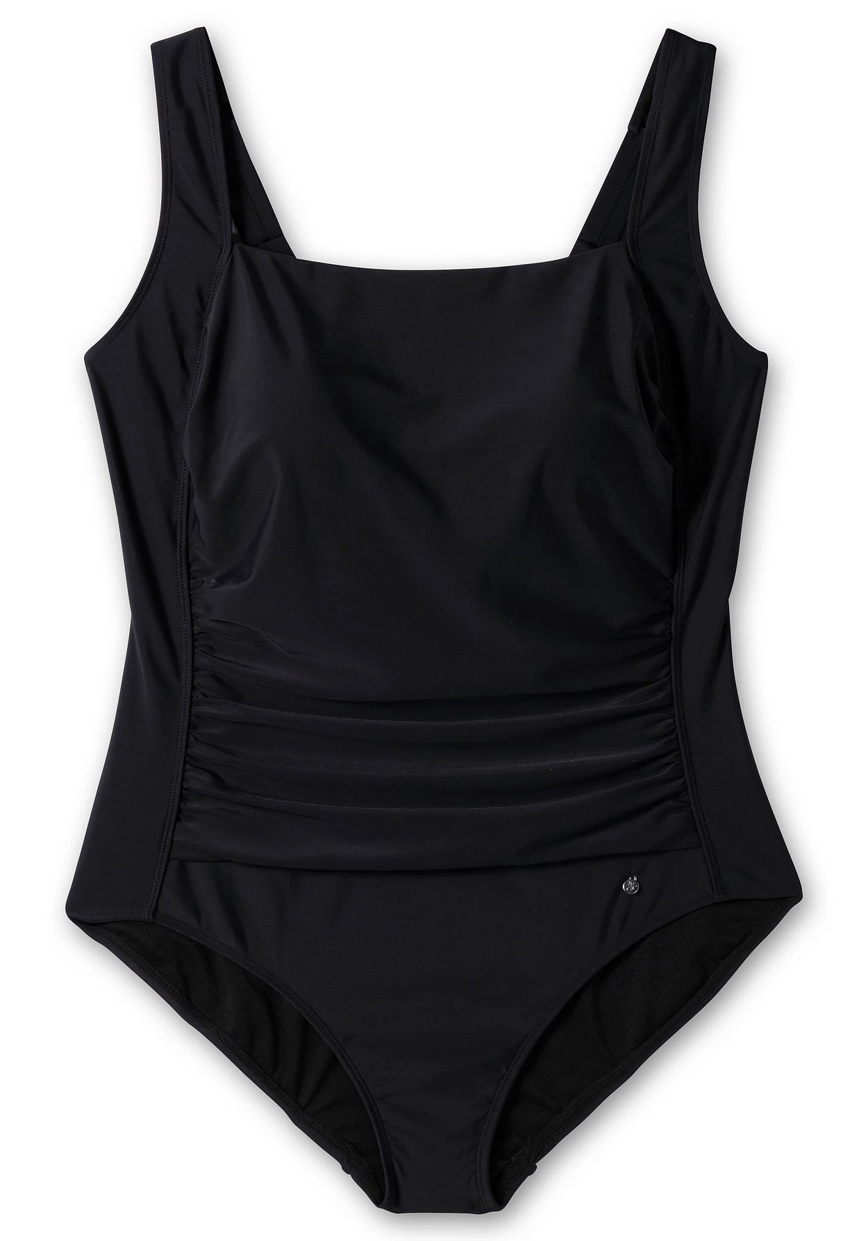 Badeanzug mit Shaping-Effekt. Der pure, klassische Style erhält durch die geschickte Raffung im Bauchbereich eine feminine Optik. Im Rücken überzeugt der hohe Ausschnitt. Wattierte Softcups und ein Unterbrustgummi geben der Brust Form, breite verstellbare Träger machen den Tragekomfort perfekt.