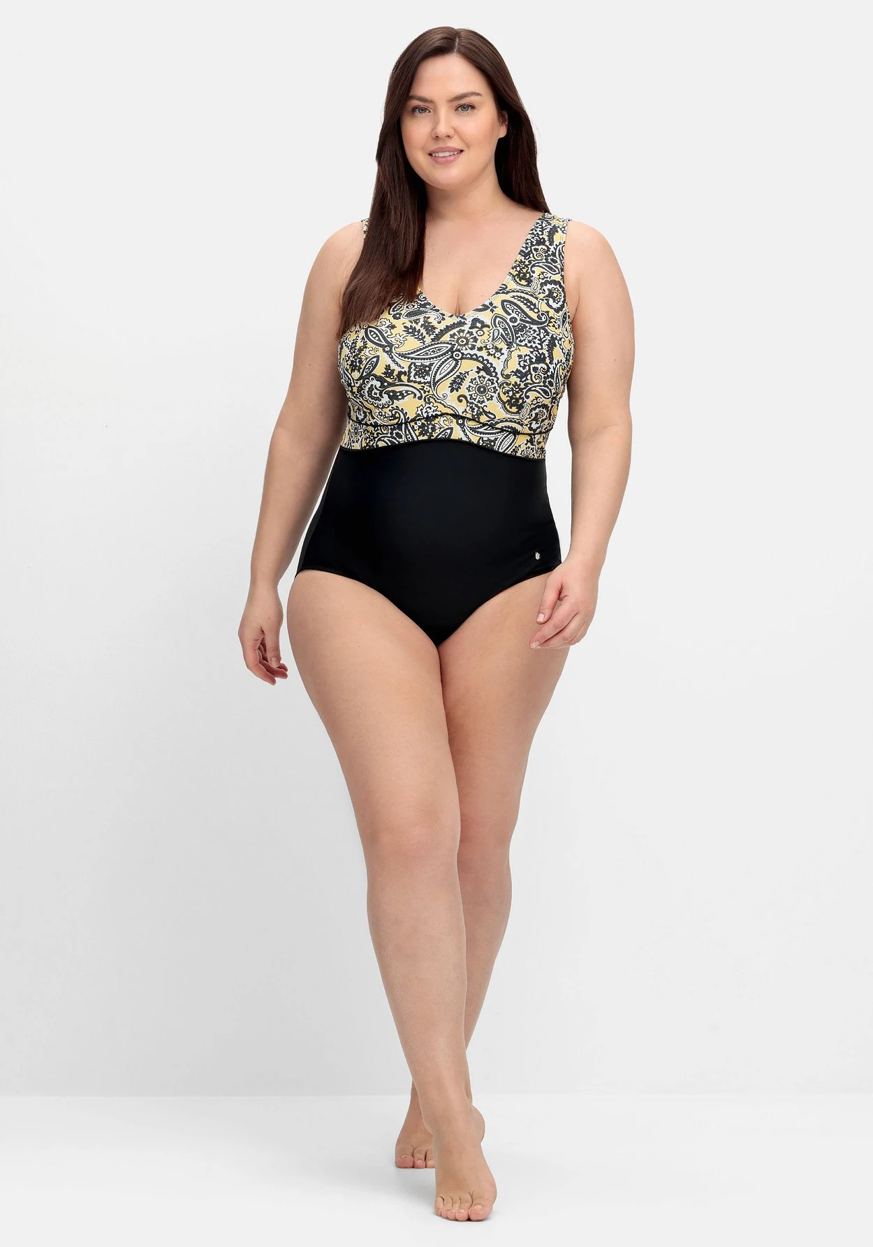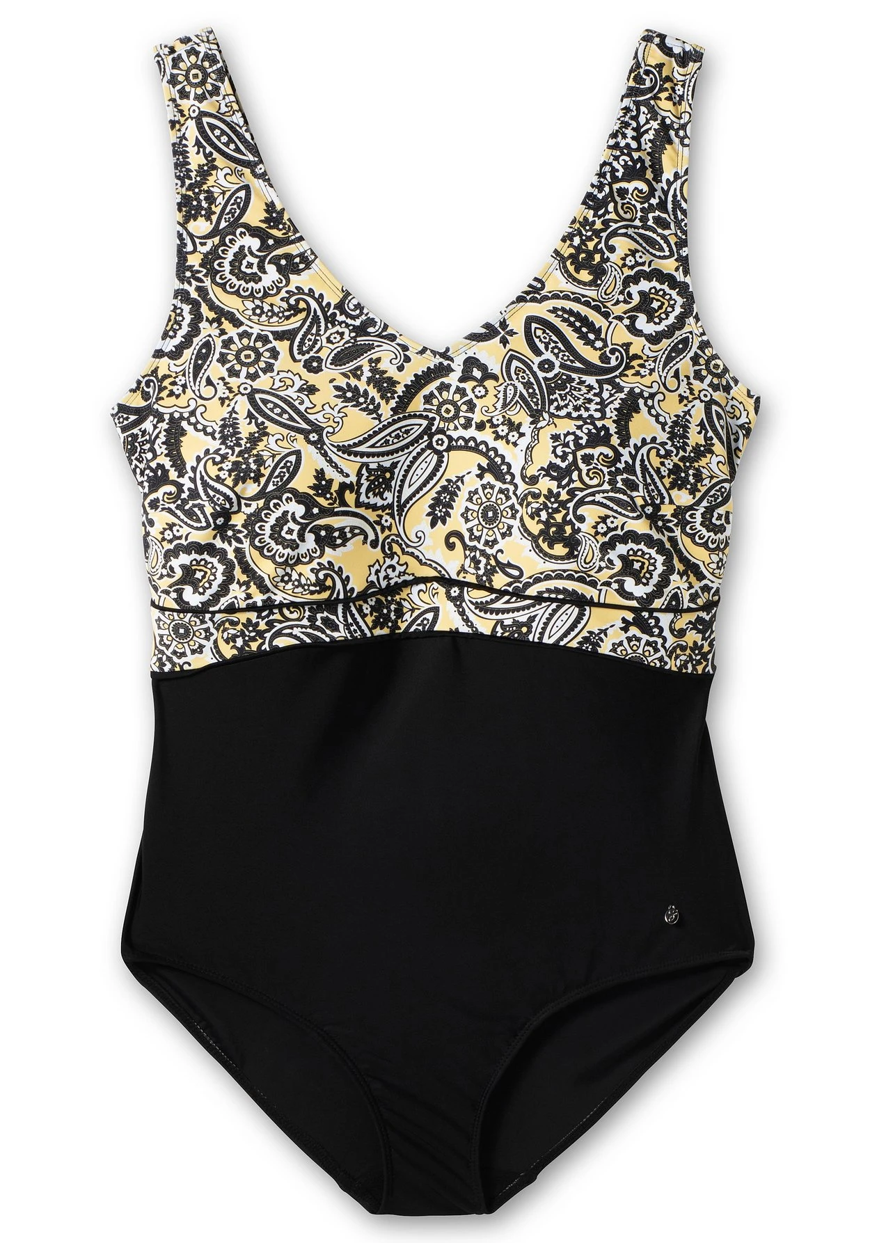 Badeanzug mit tief ausgeschnittenem Rücken. Das dekorative Paisleymuster lenkt den Blick nach oben, das Höschen ist dagegen schlicht unifarben gehalten. Die Träger garantieren vorn optimalen Halt, im Rücken werden sie zu drei schmalen Bändern und damit zum raffinierten Eyecatcher. Die wattierten Softcups geben der Brust Form.