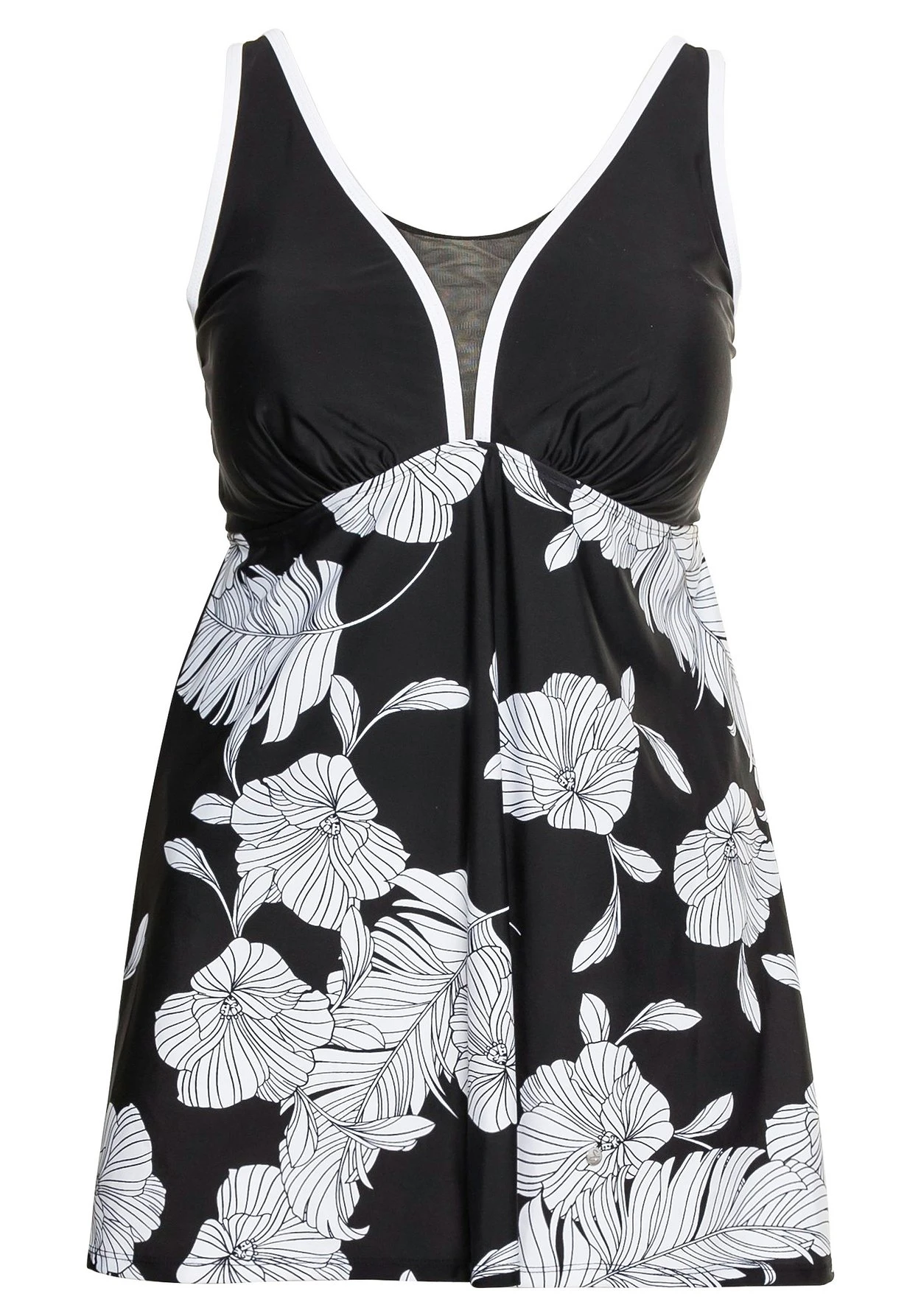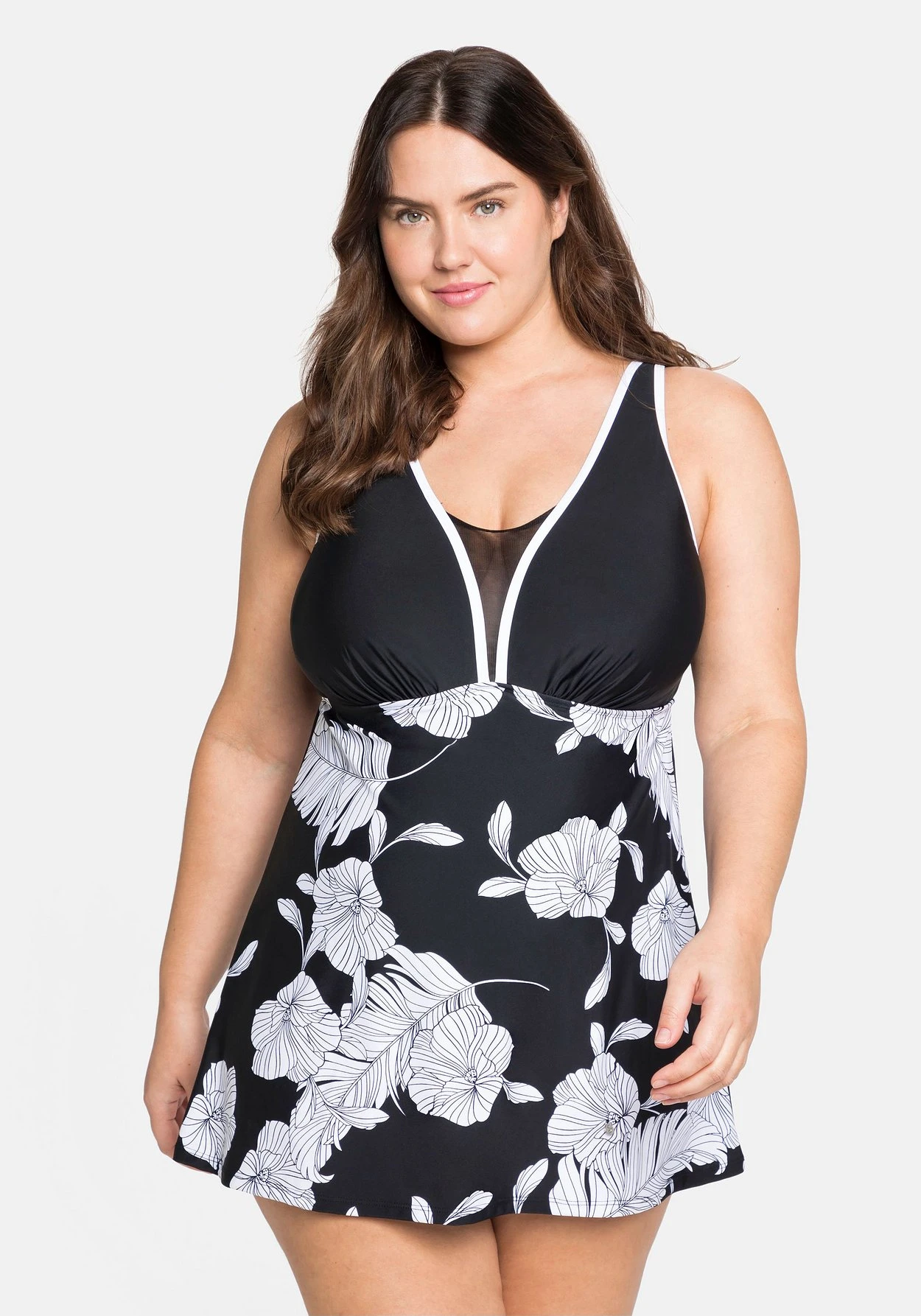 Badekleid mit locker fallendem Rock. Eyecatcher ist hier der großformatige Blumenprint, die Paspelierung am Oberteil ist dazu eine feminine Ergänzung. Der V-Ausschnitt wird durch den transparenten Mesh-Einsatz raffiniert betont, eingearbeitete Soft-Cups und breite, verstellbare Träger machen das Kleid tragekomfortabel.