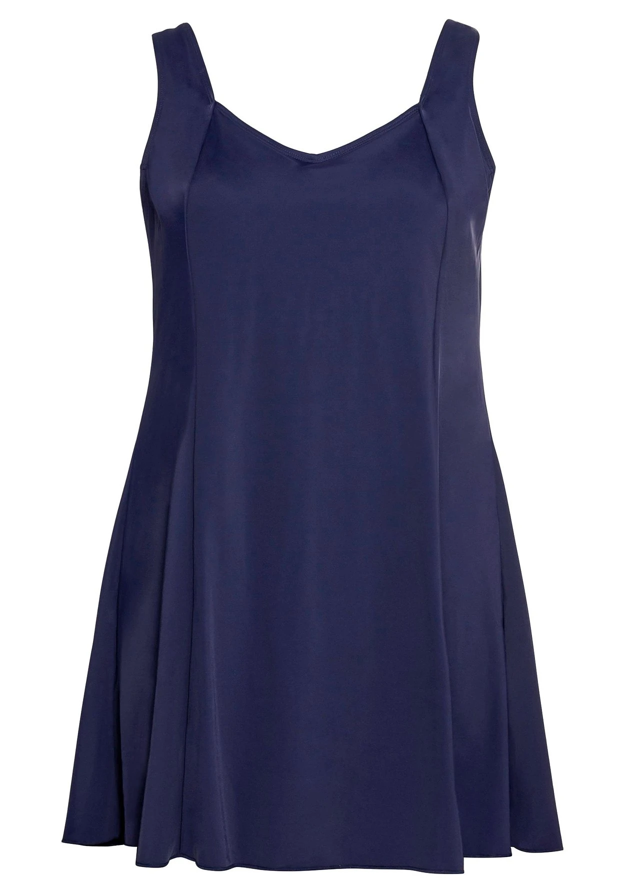 Badekleid mit tiefem Rückenausschnitt von sheego. Dieser Schwimmstyle zaubert durch die wattierten Cups und den leichten V-Ausschnitt ein schönes Dekolleté. Das leicht schwingende Rockteil ist mit Unterhose in Panty-Form gearbeitet.