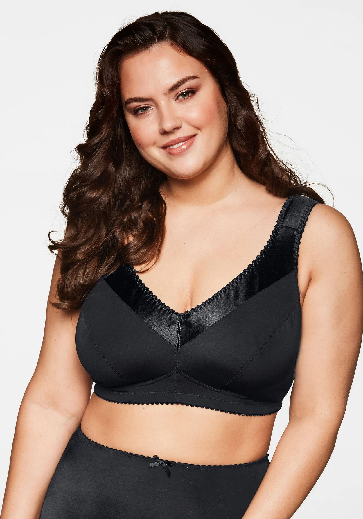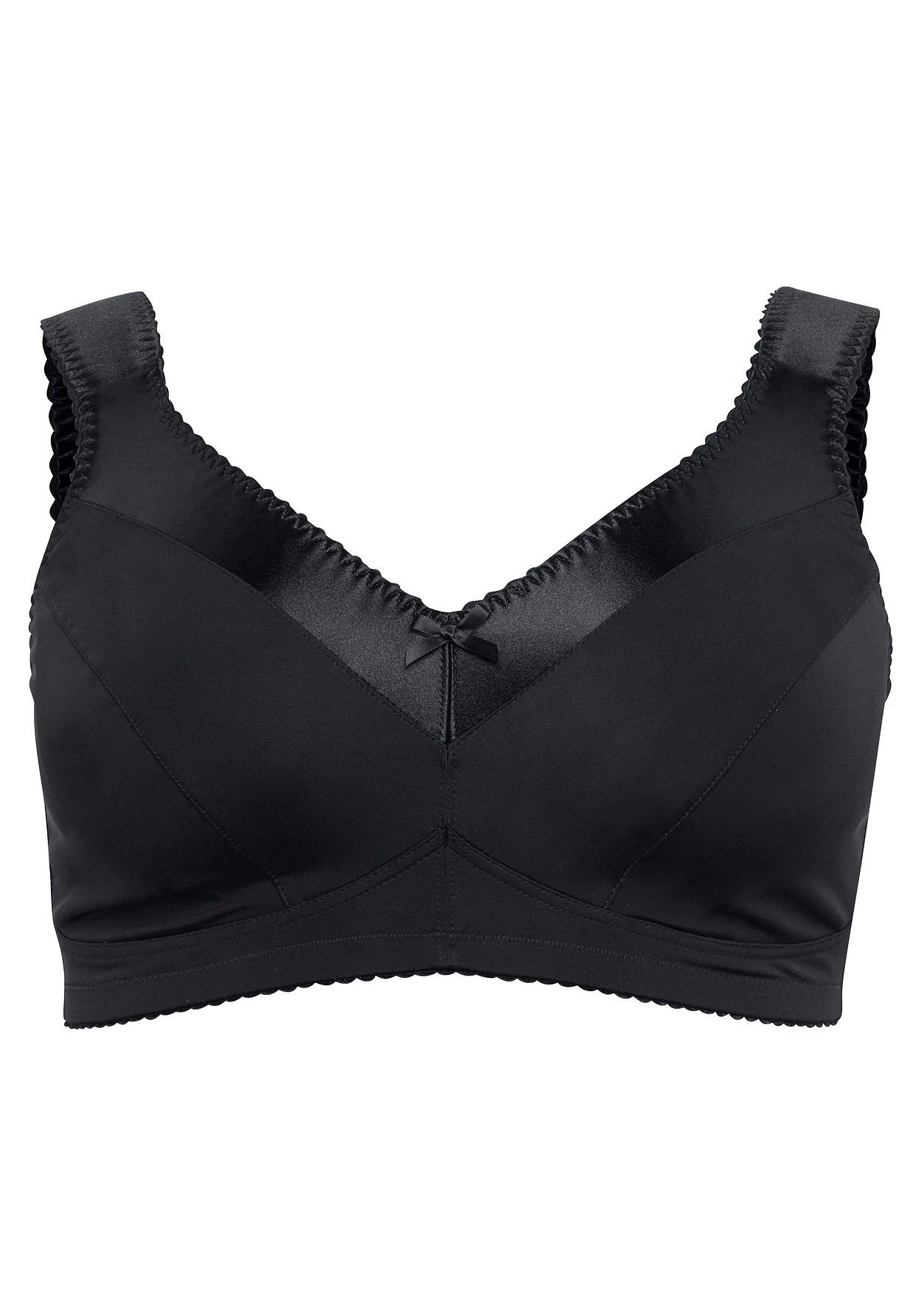 BH ohne Bügel mit breiten, wattierten Trägern. Eine dekorative Satinblende garantiert eine stilechte Optik. Besonders praktisch sind die verstellbaren Träger sowie der verstellbare Rückenverschluss. Die Cups sind mit Mesh unterlegt.