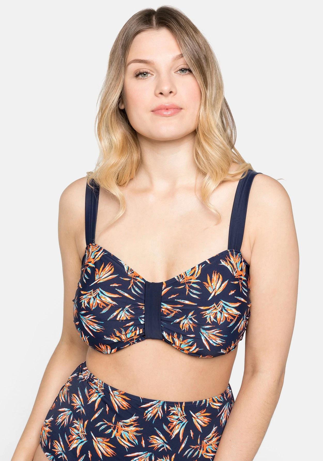 Bikini-Oberteil mit Bügel. Der sommerliche Print und die hübsche Raffung in der Ausschnittmitte geben ihm einen frischen, femininen Look. Dank des Mix & Match-Charakters lässt sich das Oberteil perfekt mit der passenden Bikinihose aus der sheego Badekollektion kombinieren.